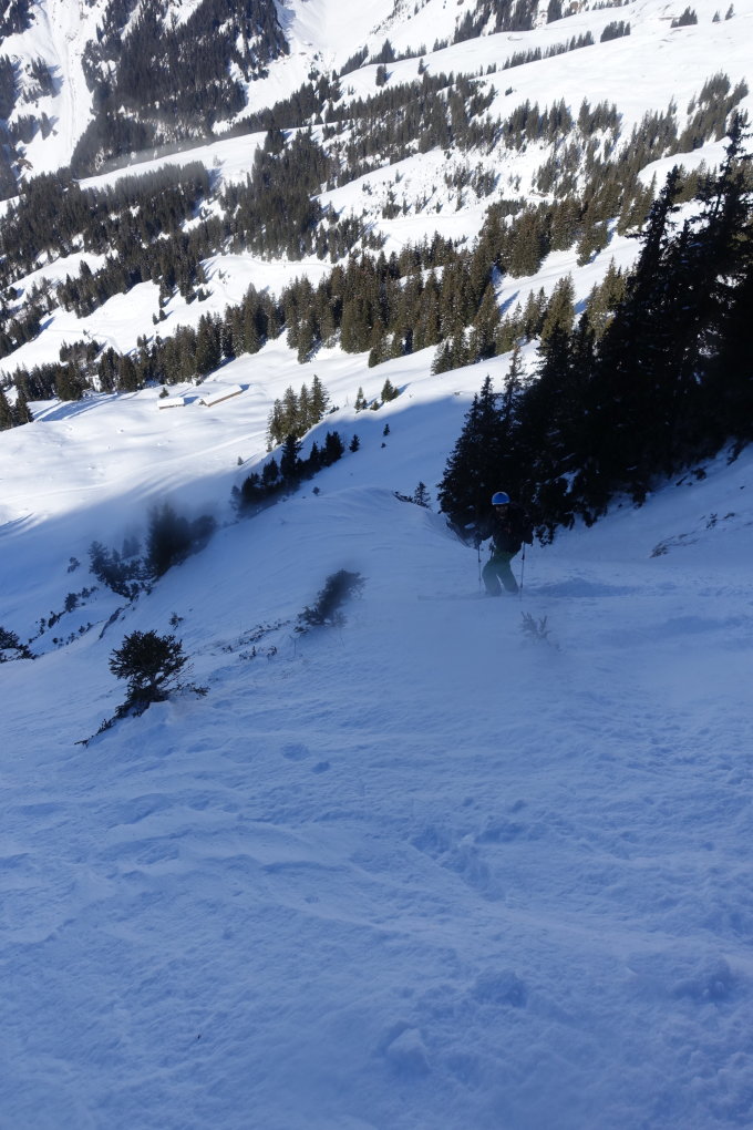 Sind über Normalroute ab Jaunpass auf Gipfel. Abfahrt durch mittleres Couloir etwas weniger Schnee als sonst-Einfahrt kurz hart griffig von Wind.Rest guter Pulfer in Mulden.Restabfahrt über die Alpweiden runter nach Jaun der Superpulfer.Da mit 2 PWs da noch mal hoch in Pass und noch das rechte Culi(von Jaun gesehen)gefahren.Einfahrt harter Triebschnee,aber sicher,dann nur der Hammer zum fahren-tiefer,lockerer Pulfer bis unten.Restabfahrt wieder top.