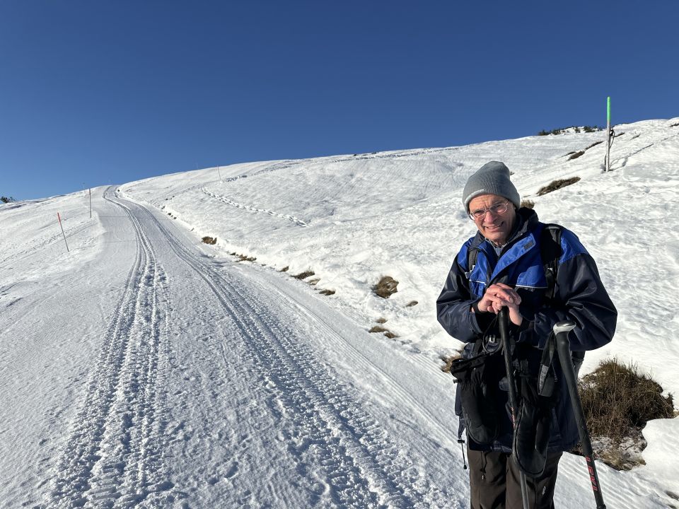 Im Abstieg kamen uns viele Fußgänger entgegen. Die Schneeschuhspur ist völlig zertrampelt. Berg- und Talfahrt mit der Gondel-Seilbahn kostet € 24,50 (Stand: 2025). Bin heute das 4. Mal auf dem Berg gewesen.