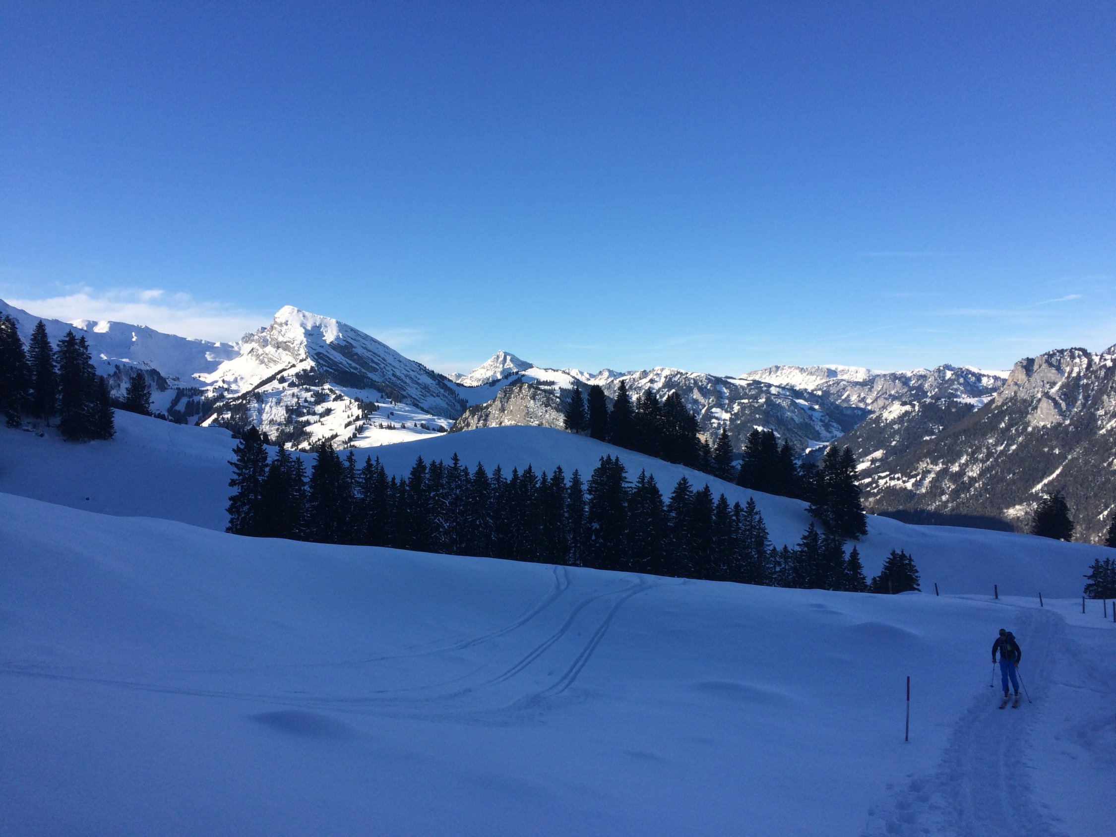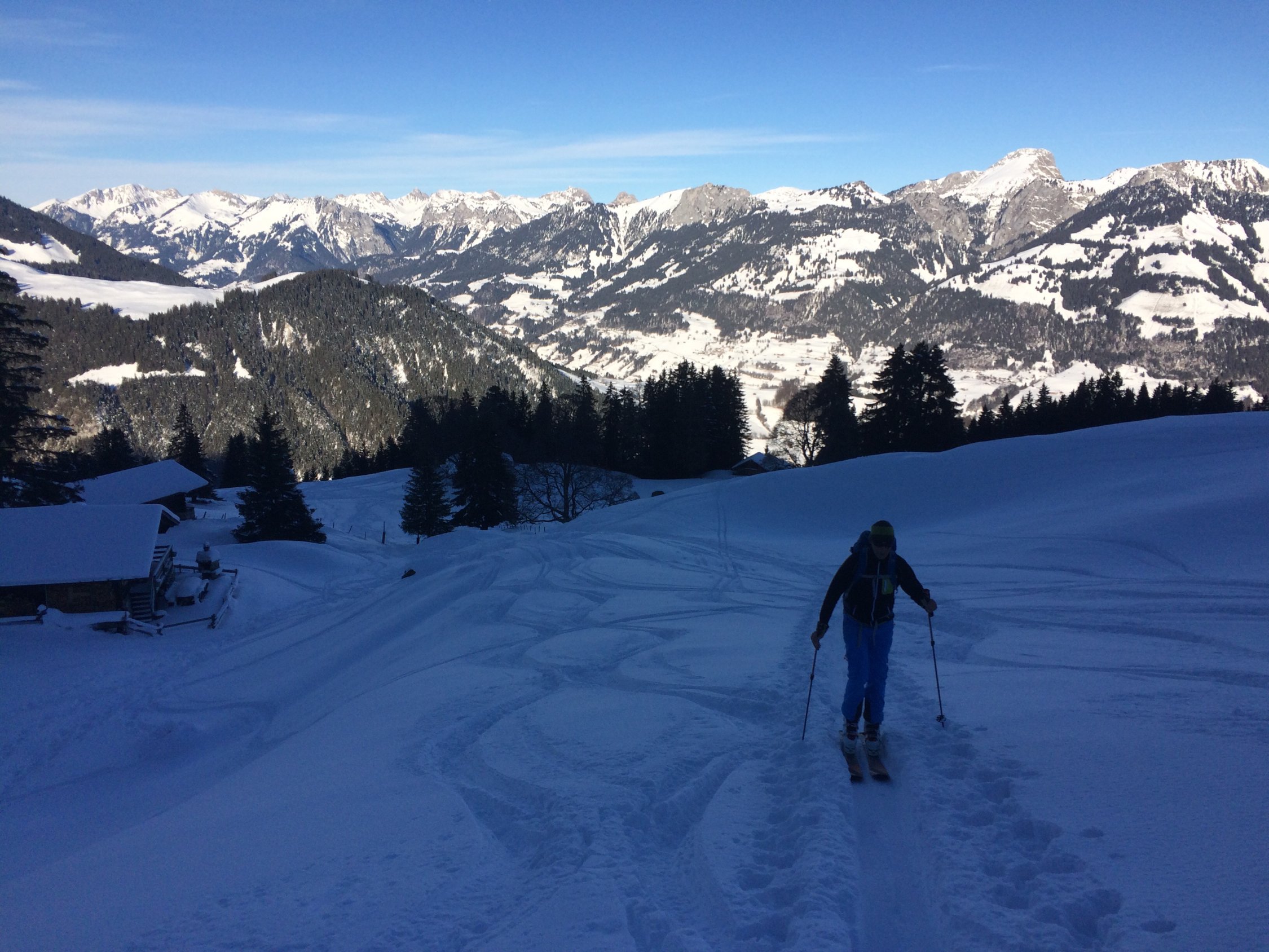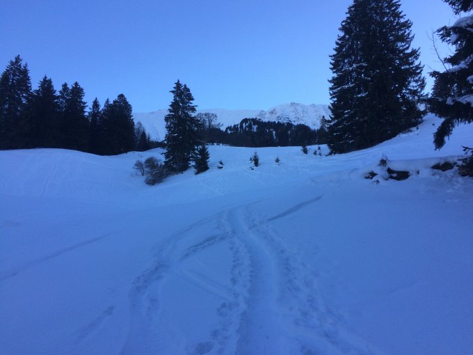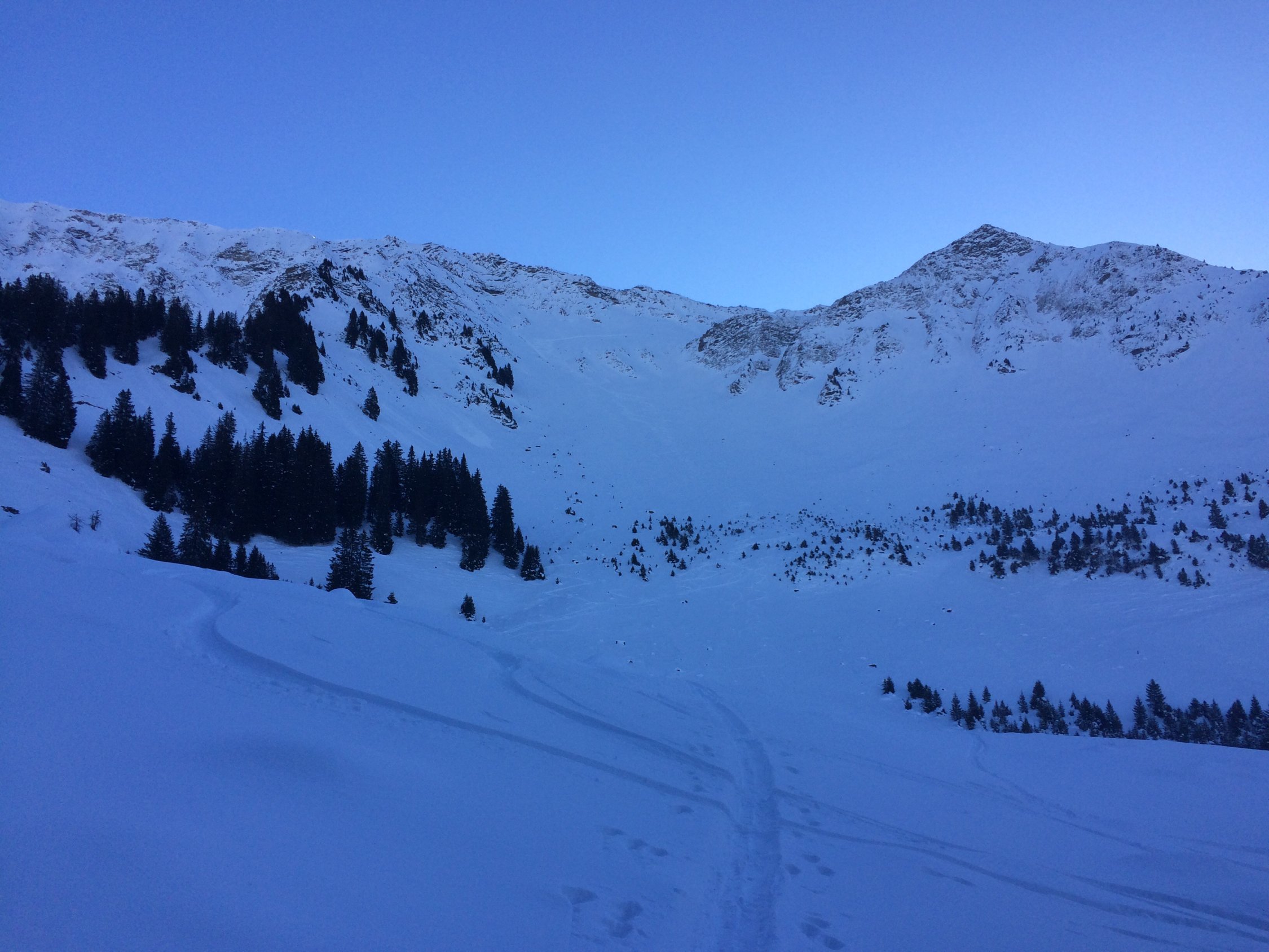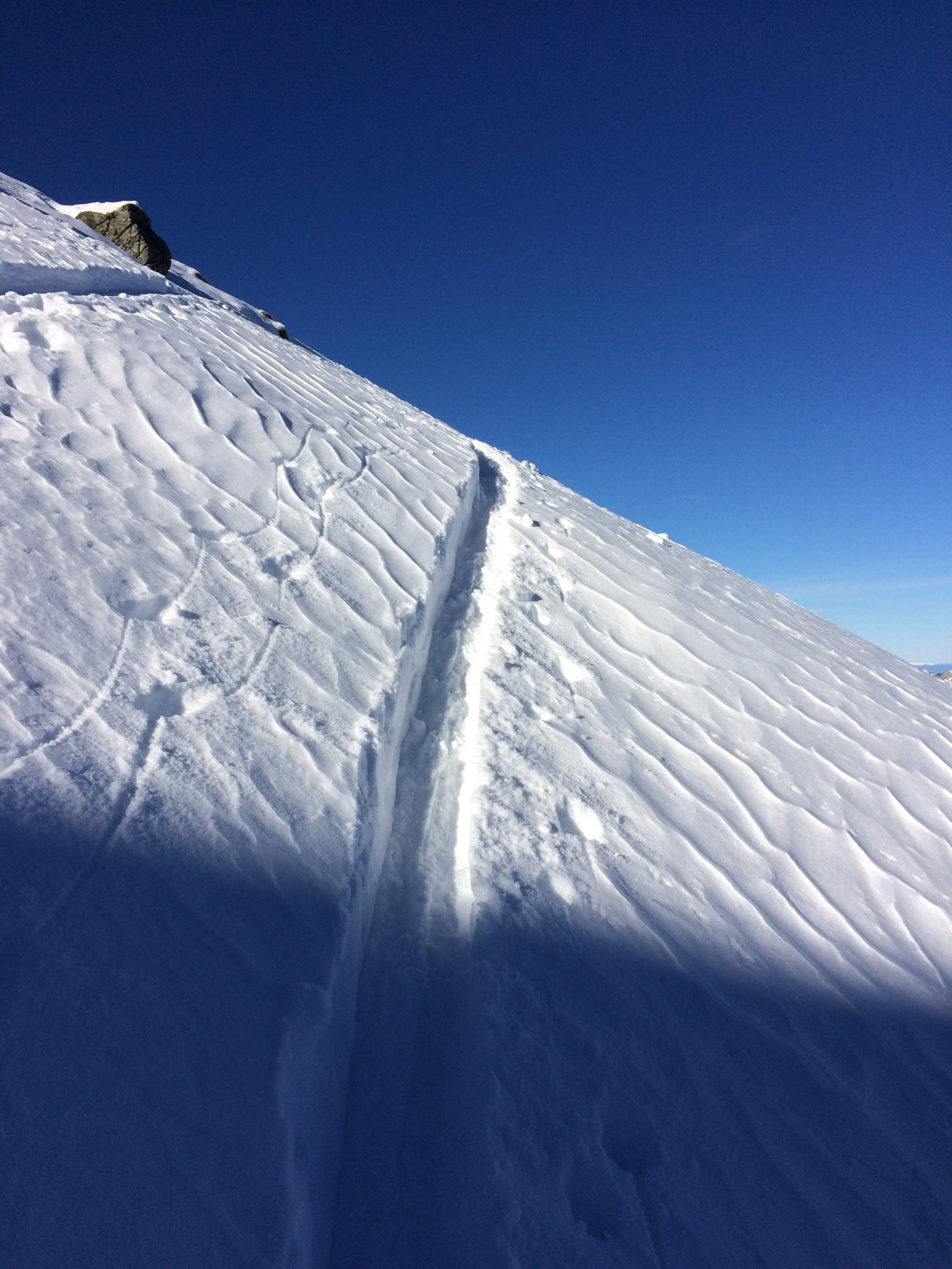 Start um 9:40 Uhr im Haseloch bei -10°C windstill. Zu Fuss auf der Privatstrasse bis zur Abzweigung Ahorni (privatstrasse ist Schneebedeckt). Ab hier Aufstieg durch gut gesetzter Pulverschnee mit einer schönen Reiffdecke. Oberhalb Pt. 1752 hat der Wind die alte Aufstiegsspur stellenweise wieder eingedeckt. Die alte Spur ist etwas glasig. Leider hat es hier nicht so viel Schnee wie erwartet. Steine und kleine Tannen sind oft nur wenig überdeckt. Die Steilstufe kurz vor der Rechtskurve auf ca. 2100 ist bereits stark verfahren. Abfahrt direkt vom Skigipfel möglich. Mit etwas vorsichtiger Fahrweise können Steinkontakte vermieden werden. Abfahrt durch die Steilstufe unterhalb 2100 ist kein Genuss. Unterhalb der Steilstufe fängt jedoch der Spass so richtig an. Gut gesetzter Pulverschnee verleitet zu grossen Turns.