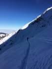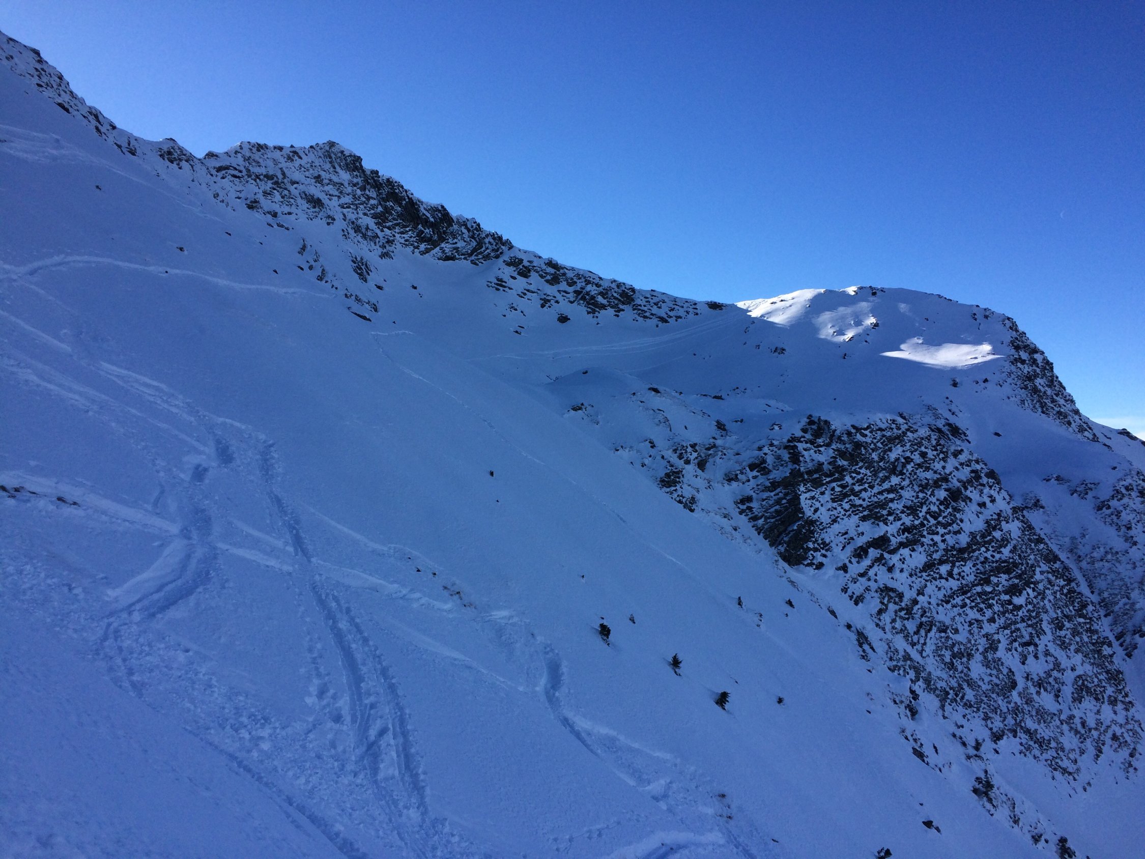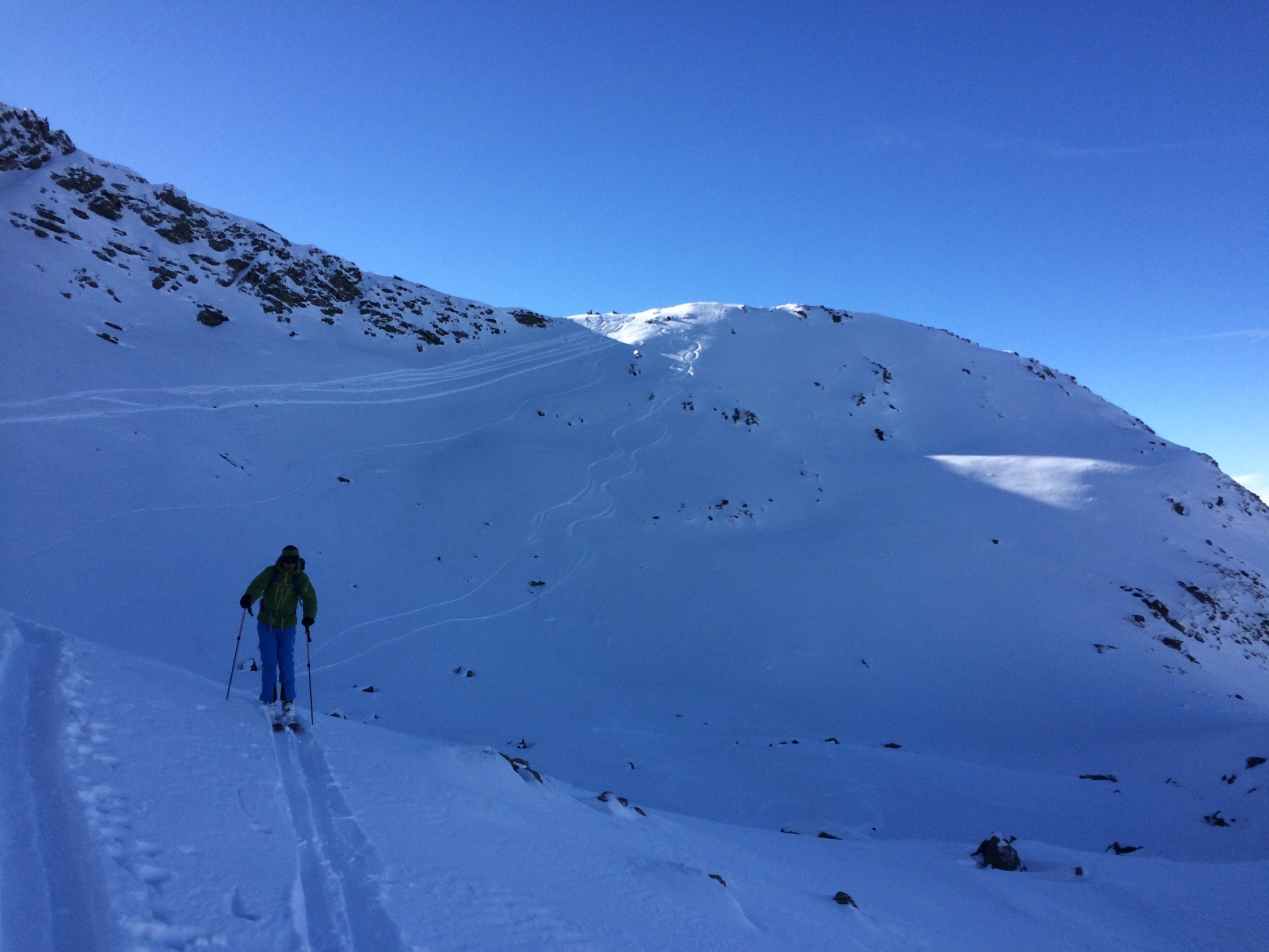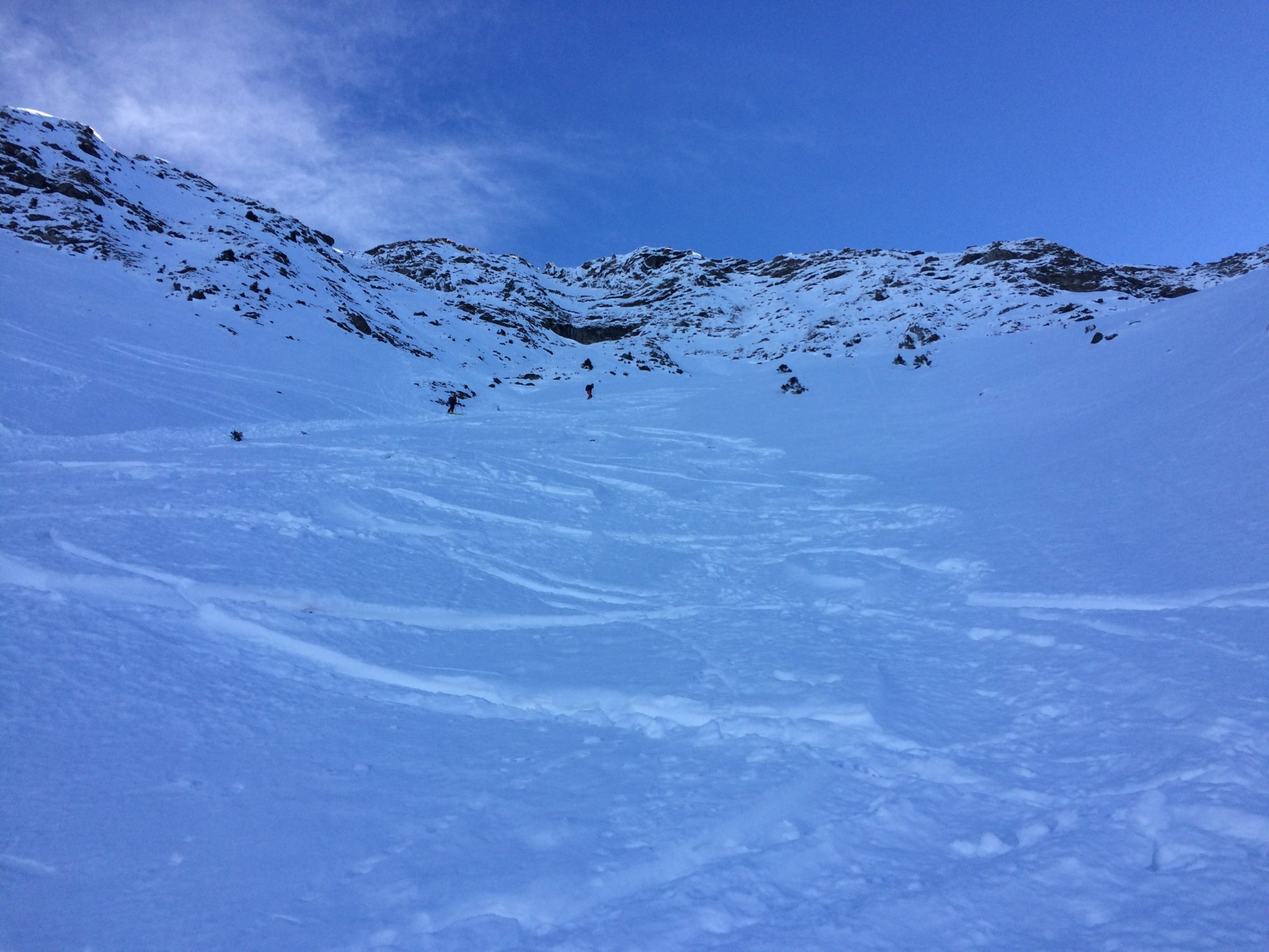 Heute waren 13 Personen am Steinschlaghorn, demenstprechend ist es jetzt vercharret. Die Steilstuffe sollte somit beim Aufstieg etwas schwierig werden.