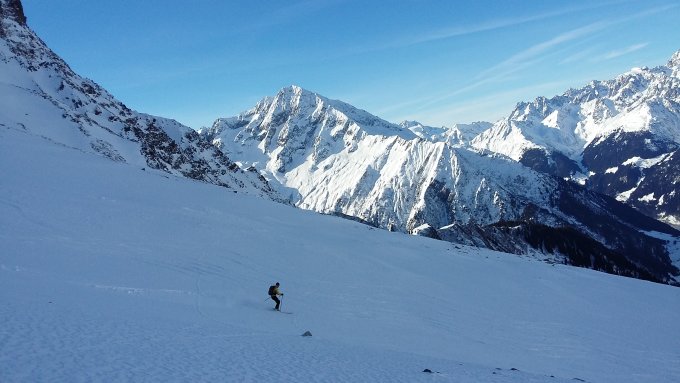 Einstieg in den Gletscher hart bis eisig, einige blanke Stellen. Über Gletscher windgepresst, dann gedeckelt mit leichtem Pulver, im Mittelteil Pulver, unten raus noch wenig Schnee