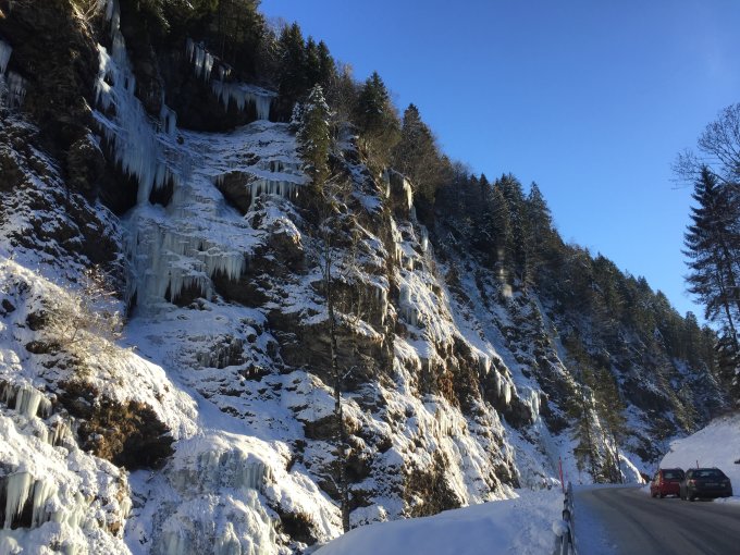 Brauchbare Verhältnisse, wir sind den Hauptfall und Doppelsäulenfall geklettert, Standplätze nicht überall möglich, gute Routenwahl erfordelich, 13cm und 10cm Eisschrauben mitnehmen, es können aber auch lange teilweise gesetzt werden.