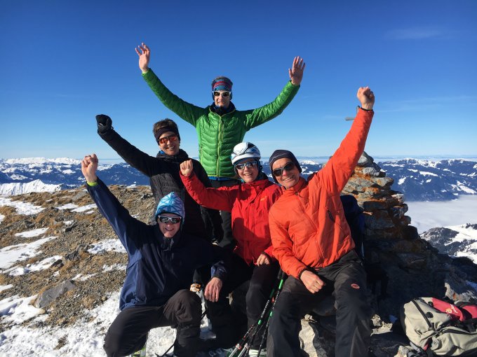 Urs ist es gelungen, die eigentlich gar nicht homogene Gruppe in einem angenehmen und doch zügigen Tempo auf den Gipfel zu führen. Aber die schwierigste Aufgabe stand ihm noch bevor: Schon beim Aufstieg stellen wir fest, dass die Schneedecke zwar wunderschön weiss und pulvrig war, aber die Steine wegen dem fehlenden Untergrund nicht genügend bedeckt waren. Deshalb suchte Urs für uns vorsichtig die bestmöglichste Route aus. Wenn man vom Bodenkontakt, der nicht immer zu vermeiden war absieht, hatten wir eine herrliche Abfahrt über lange, steile, baumlose Hänge. Carla hat dabei mehr als einmal vor Freude gejuchzet.