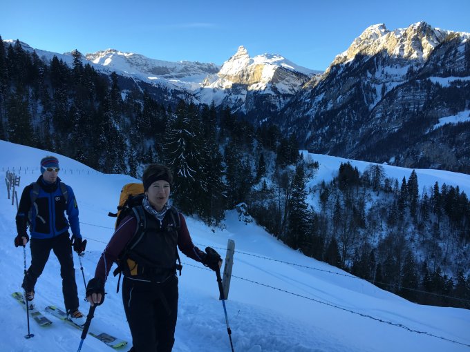 Um 8:20 starteten wir bei Minus 12 Grad in Melchtal, aber beim steilen Anstieg wurde uns schnell warm. Die Spur führte kerzengerade nach oben und glücklicherweise legte Urs Hunziker eine neue Spur im Tiefschnee, die mit der höchsten Stufe der Skitourenbindung gerade noch zu bewältigen war.