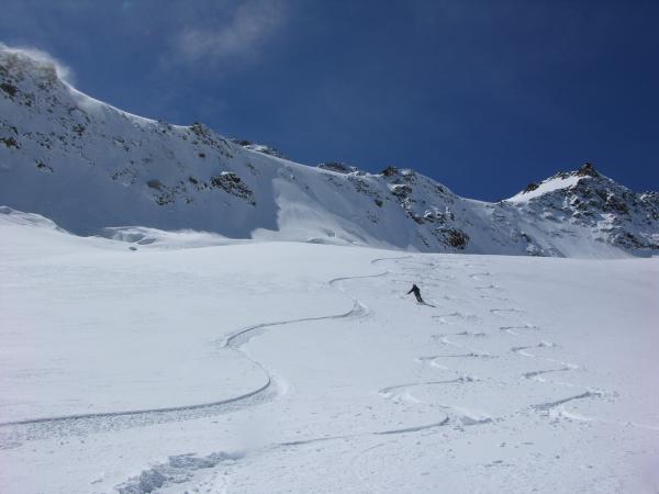 Die Abfahrt wahr sehr schön oben noch im Pulver weiter unten mit schönem Sulzschnee. Es wahren ca. 15 Personen am Berg unterwegs davon 3 Snöber bei herrlichem Bergwetter