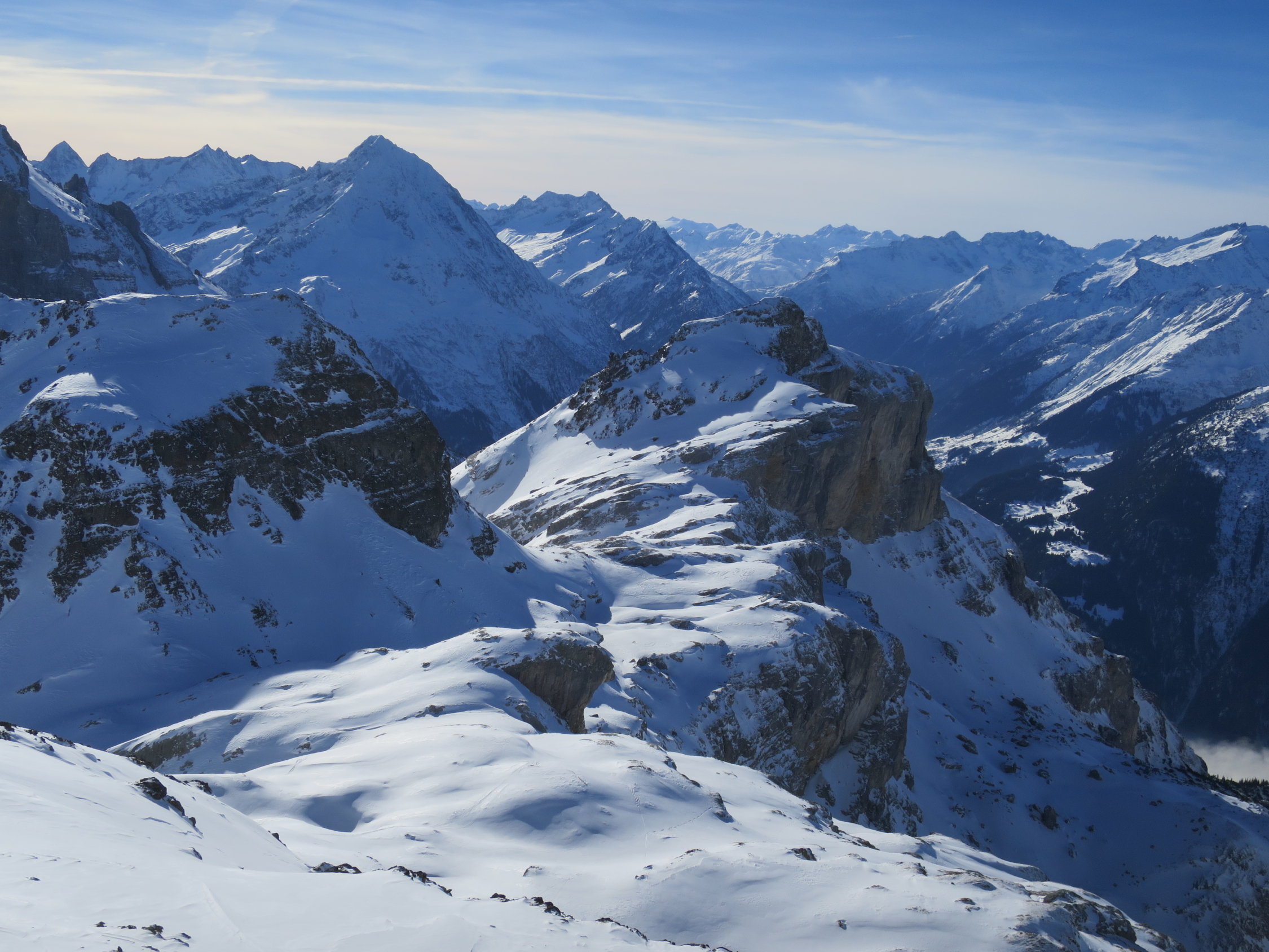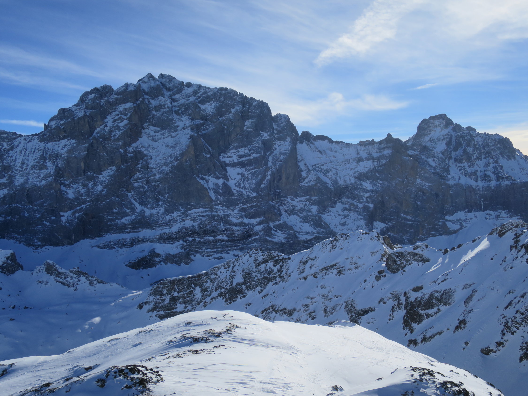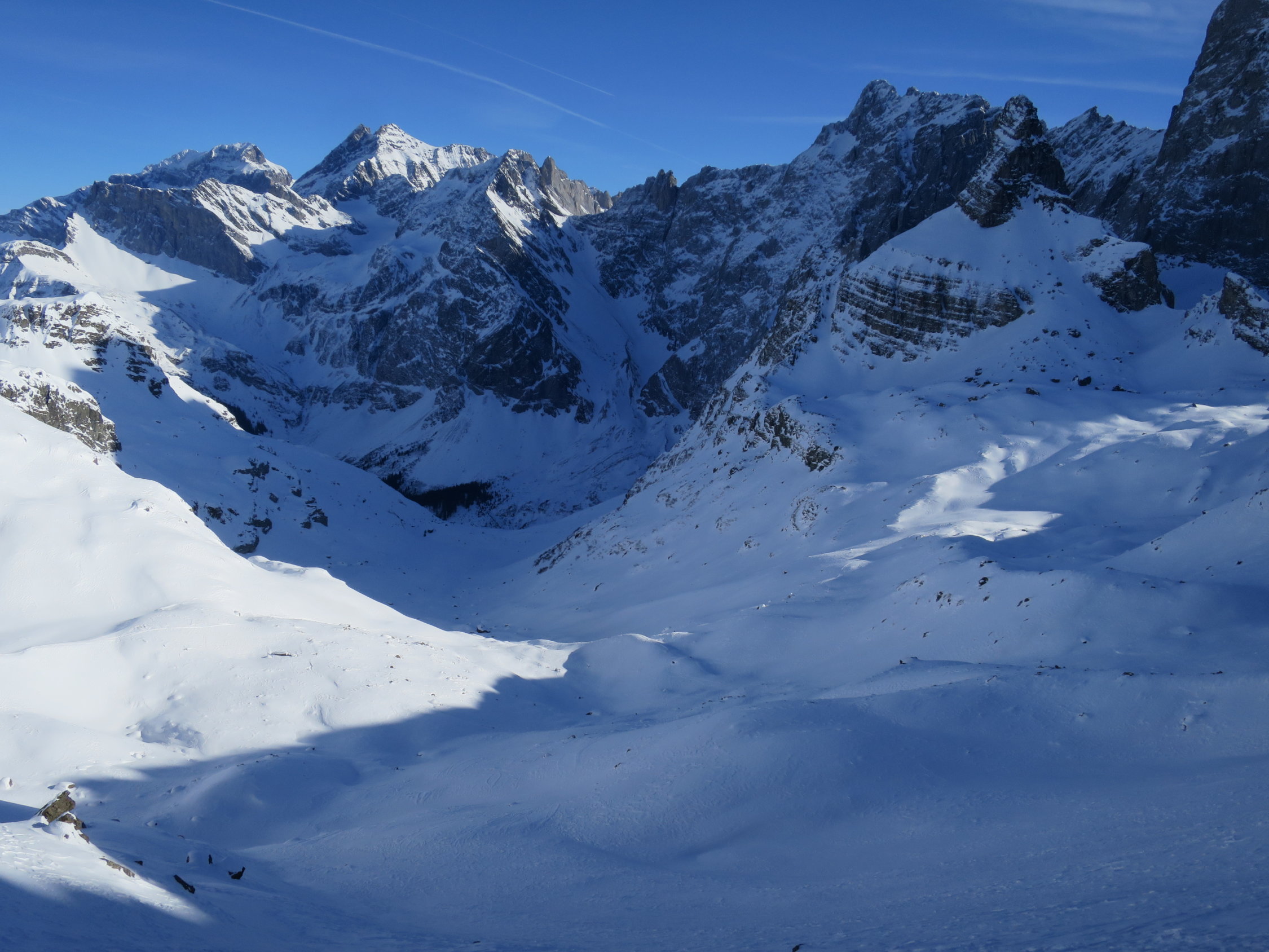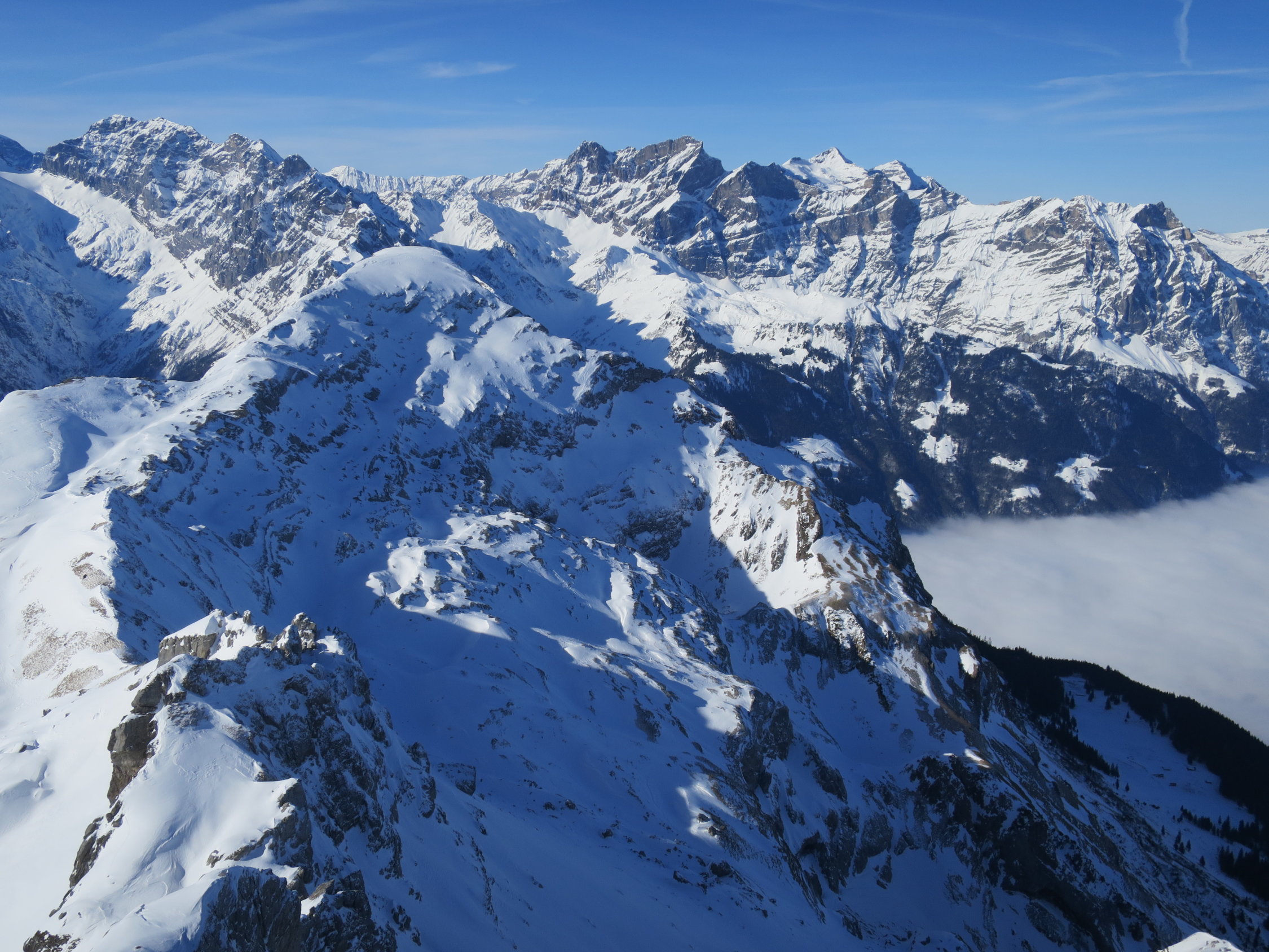Start der Tour um 07.30 beim Parkplatz Bad in Unterschächen. Die Brunnistrasse war mit dem Ratrak bearbeitet worden zu laufen wie auf einem Teppich. Ab der Brunnialp, durch den Chärschelen Wald nach Flösch und durchs Griesstal war die Spur verblasen manchmal noch vage erkennbar. Der Wind hat wiedermal seine Schuldigkeit getan! Wunderschöne Fernsicht vom Gipfel des Hoch Fulen. In der Abfahrt, bis unter die Stichplatten Pulverschnee, dann ein Snowmix aus Pulverschnee und tragendem Winddeckel der aber beim geringsten Kantendruck durchbrach. Bei Eggen unter die Widerflüe traversiert und auf der Sommerroute durch den Wald nach Brunni hinab. Im windgeschützten Wald noch Pulverschnee, im offenen Gelände Winddeckel. Durchs Brunnital nach Unterschächen zurück.