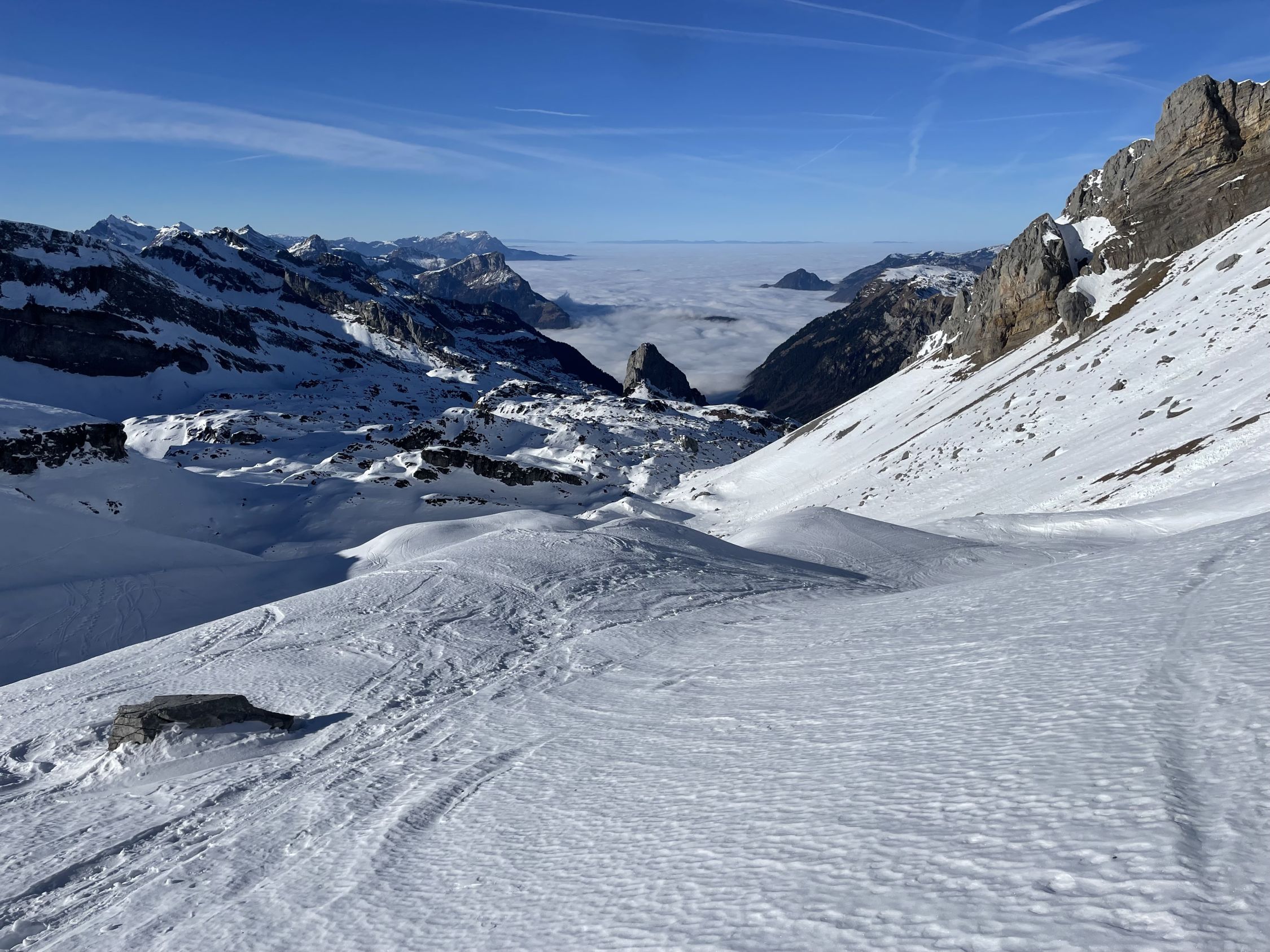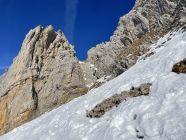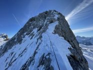 Schnee ist hart: Windpress und Bruchharsch wechseln sich ab. Je nach Sonneneinstrahlung gegen Mittagcerste aufgeweichte Stellen.