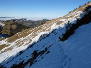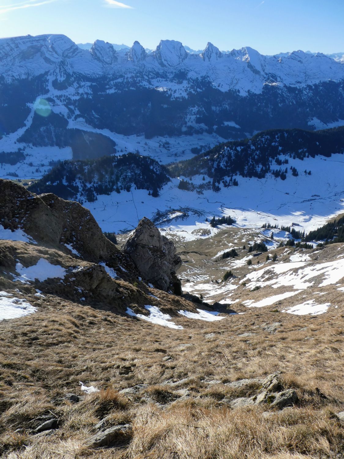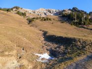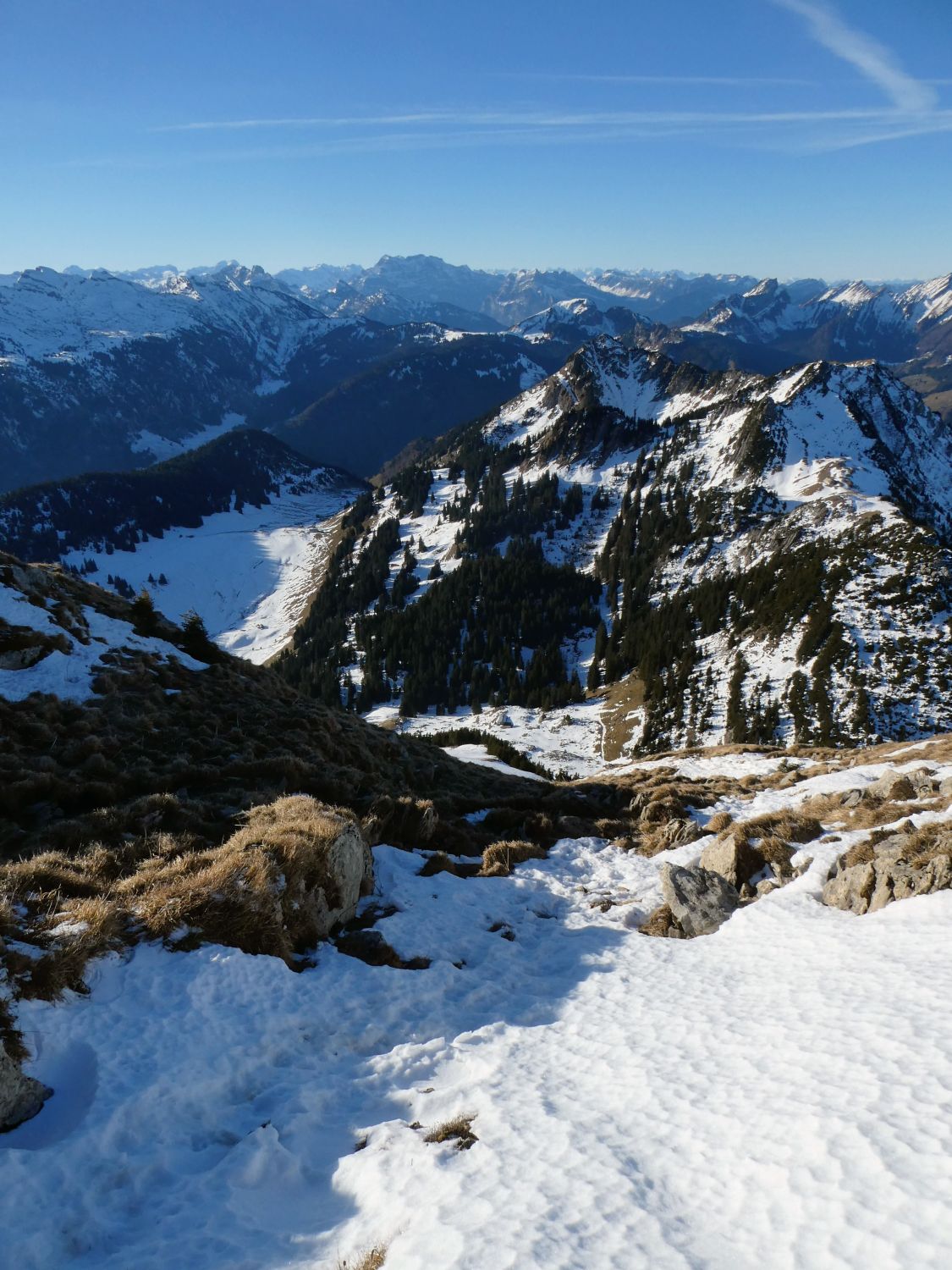 In der steilen Lütispitz-Südflanke liegt für Ende Dezember sehr wenig Schnee. Die wenigen Schneefelder waren heute früh aber pickelhart. Steigeisen waren also kein Luxus. Auch für den Aufstieg im plattgedrückten Gras waren sie hilfreich.