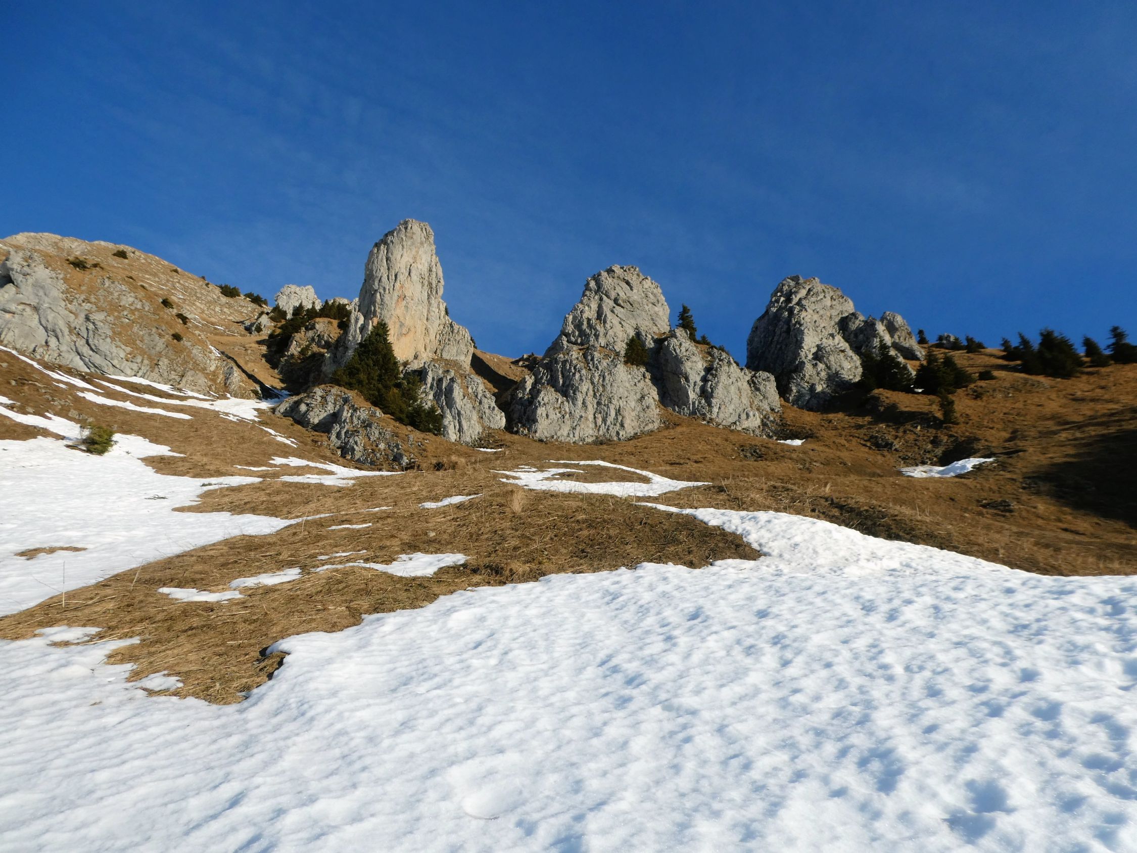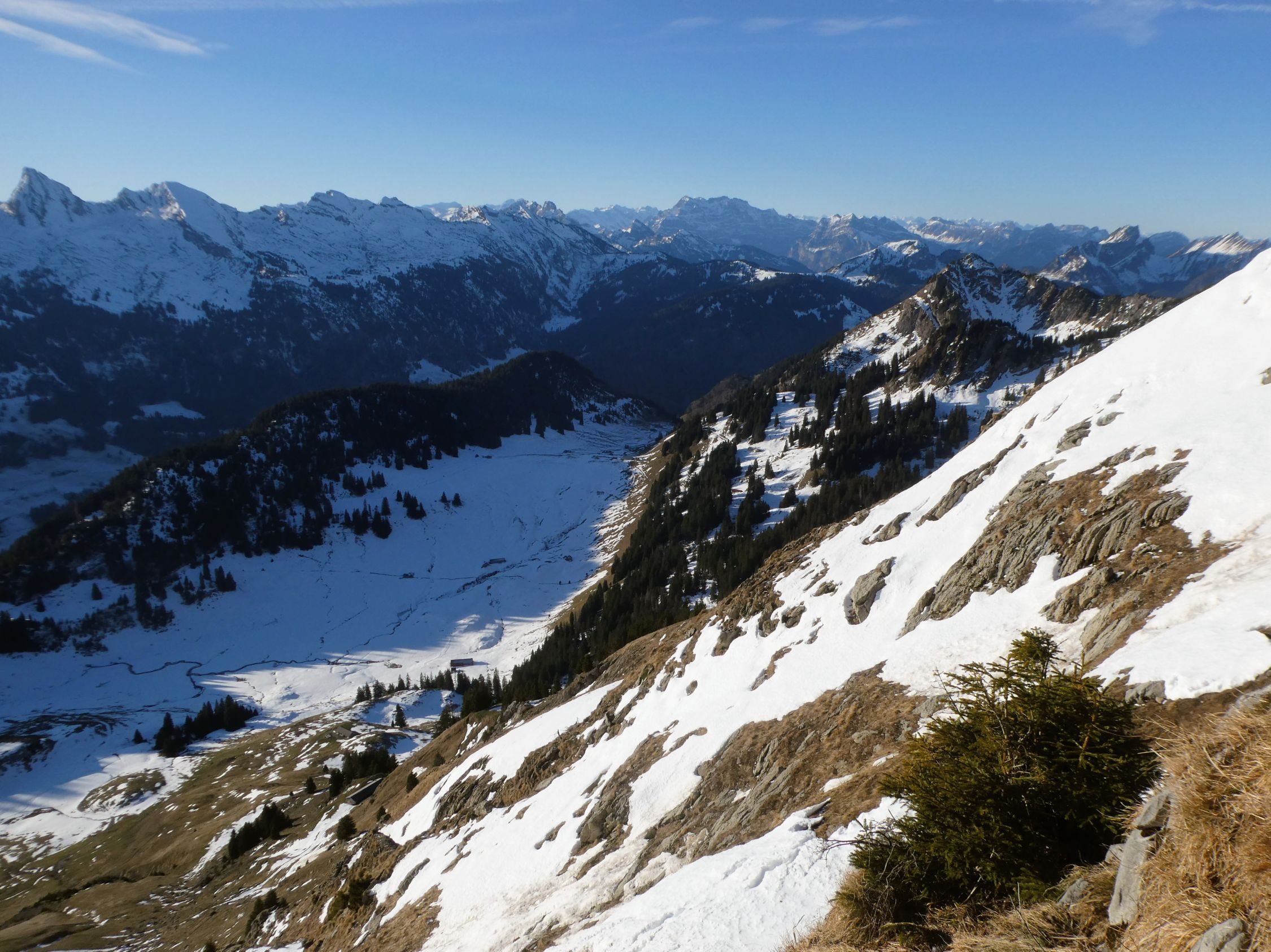 Bis zum Sattel bei Risi ist momentan alles schneefrei. Im kalten, schattigen Gräppelen ist es winterlich, doch stört der wenige Schnee dort nirgends.