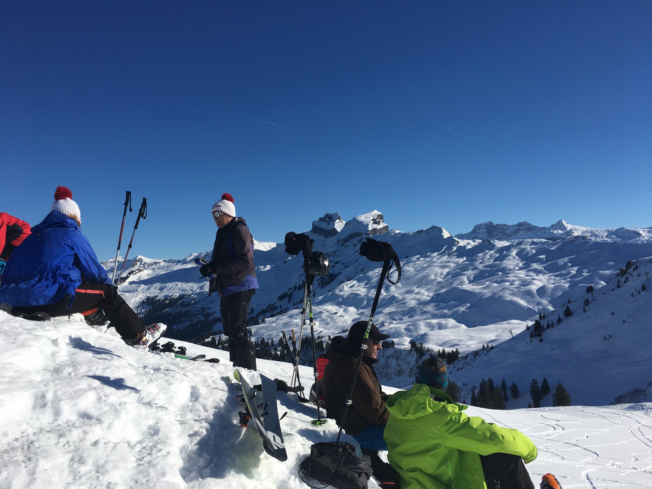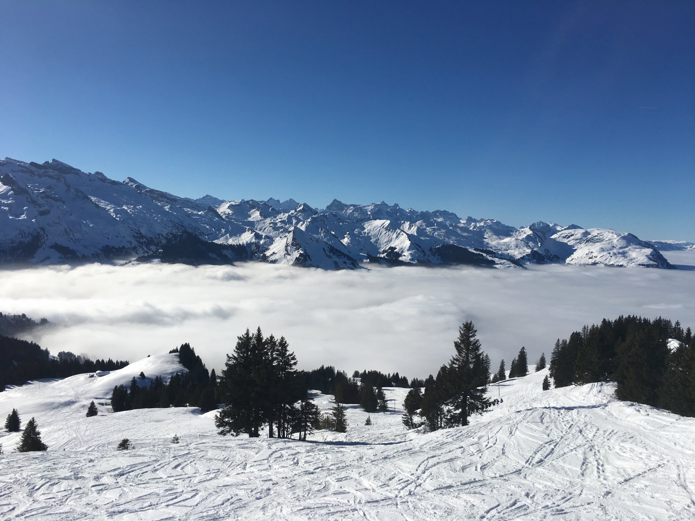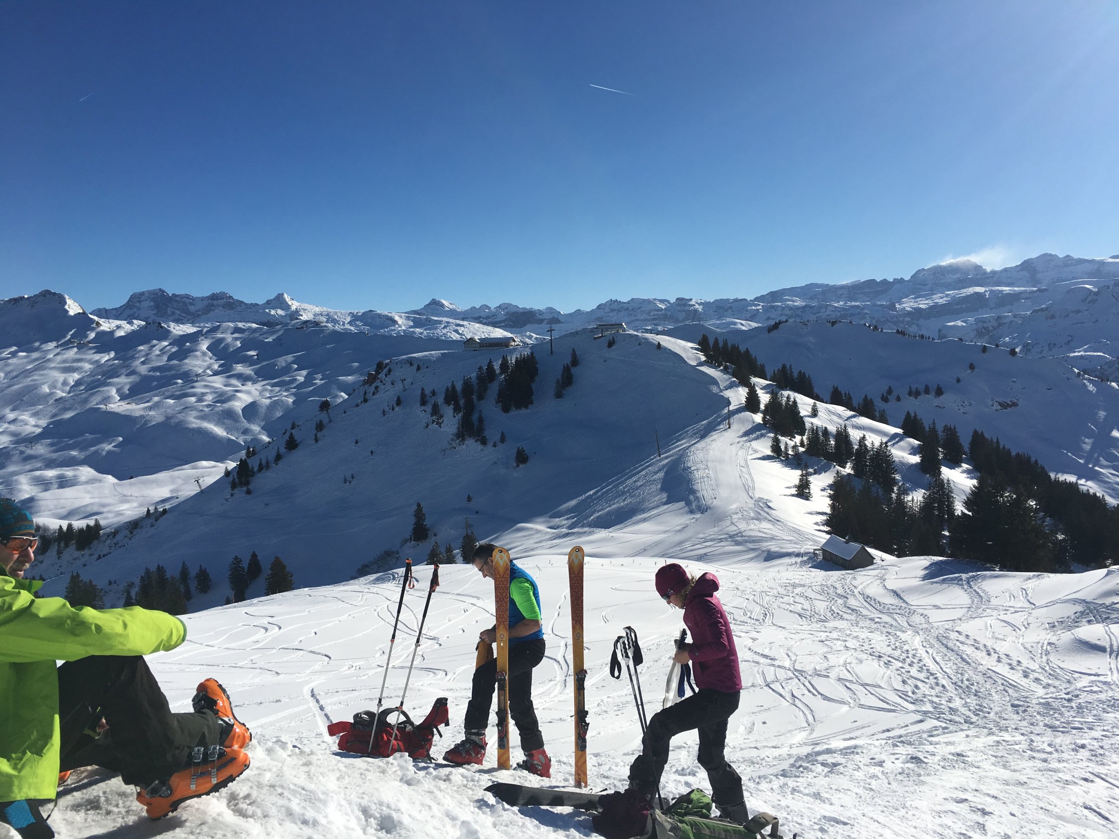 Im Nebel gestarted im oberen Parkplatz Handgruobi 1150m. Auf 1300m haben wir die Nebeldecke durchstossen und den Traumtag genossen. Nach so langer Zeit ohne Neuschnee sind alle Haenge stark verspurt. Die Sonnenhaenge ueber dem Nebel sind gedeckelt und geben wenig Abfahrtsgenuss. Die Nordabfahrt vom Laucheren und besonders die linken schattigen Haenge haben noch schoenen Pulverschnee - zwar auch ziemlich verfahren aber weiterhin genussvoll zu befahren! Auf der unteren Fahrstrasse haben wir wieder angefellt und sind zur Sternenegg aufgestiegen. Leider hat sich die Nebelgrenze nicht wie angekuendigt weiter gesenkt. Anstatt Bruchharst und Nebel sind wir entlang der Piste nach Ibergeregg abgefahren und haben dort fuer Fr14.00 die Zweistundenkarte Ibergeregg gekauft um Sonne und guten Pistenschnee noch eine Weile geniessen zu koennen. Die Schlussabfahrt endete ab Grossenboden wieder im Nebel!
