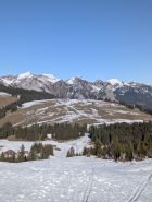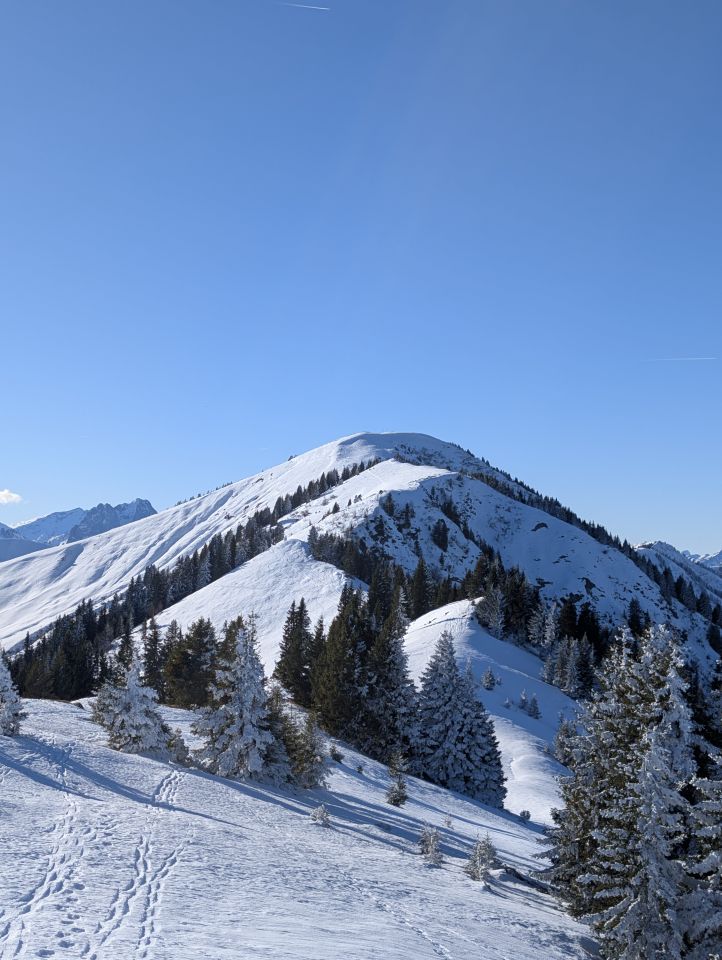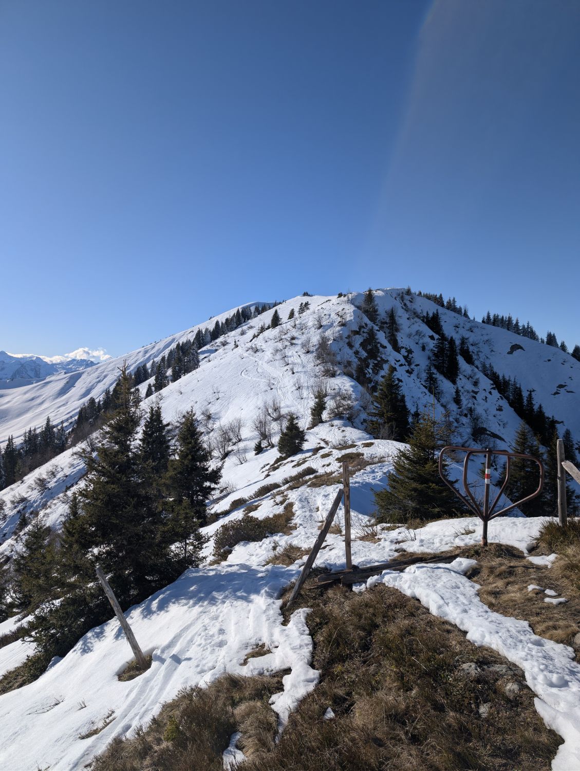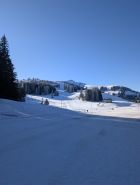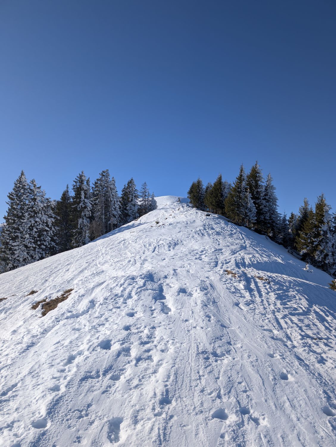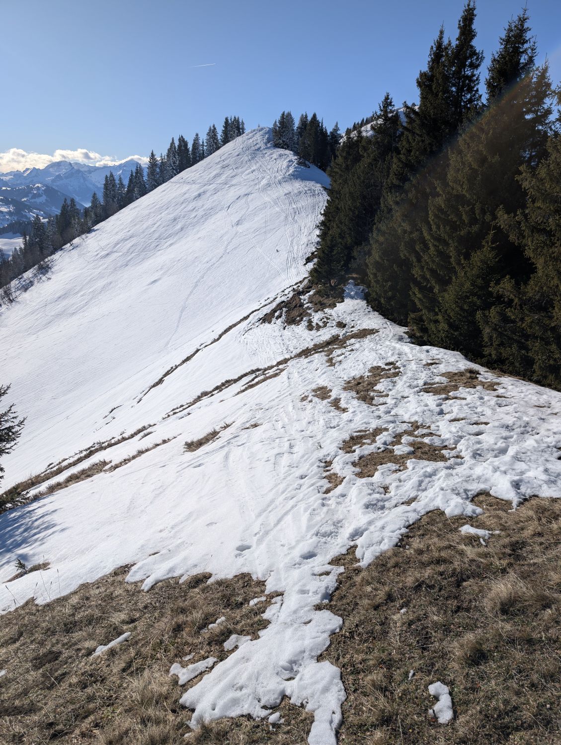 Es gibt gerade so genug Schnee. Trotz Sonneneinstrahlung ist es überall ziemlich hart – selbst gegen 13 Uhr noch. Die Abfahrt fühlt sich eher wie eine präparierte Piste an.