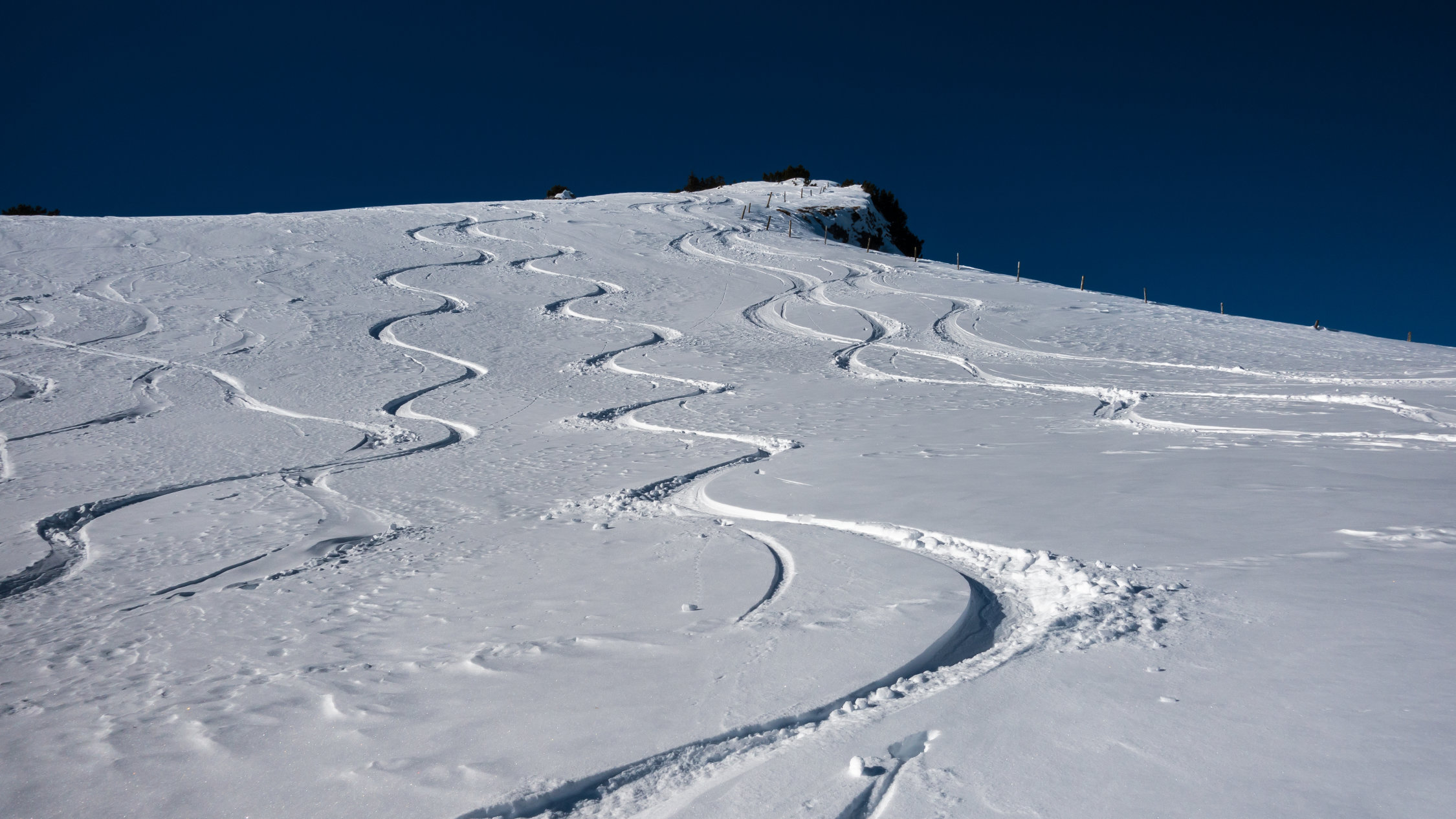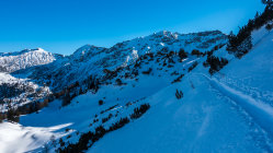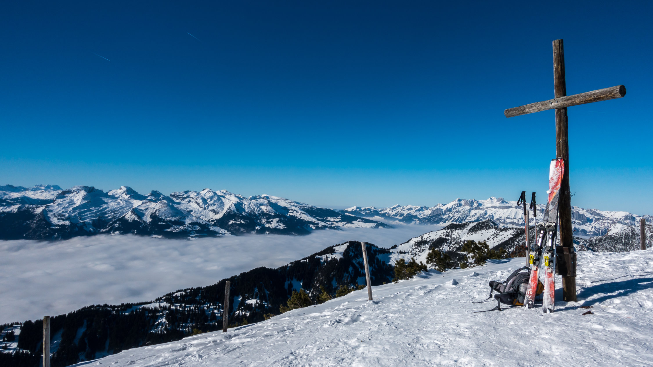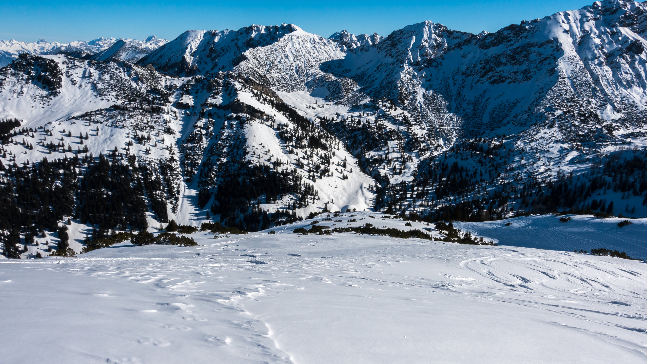 wolkenlos, windstill, in der Sonne frühlingshafte Verhältnisse. Der Aufstieg erfolgt auf der Südseite, hier schlechte Schneeverhältnisse (Bruchharst, Pulver und nasser Frühlingsschnee) Darum bin ich vom Gipfel auf der Ostseite abgefahren. Die ersten 300 Hm traumhafter Pulver, im Wald dann schon sehr zerfahren. Dann muss wieder gut 200 Hm aufgestiegen werden. Die Abfahrt vom Sassfürkle (1780m) bis unten geht leider über einen Wanderweg, also nicht sehr attraktiv.