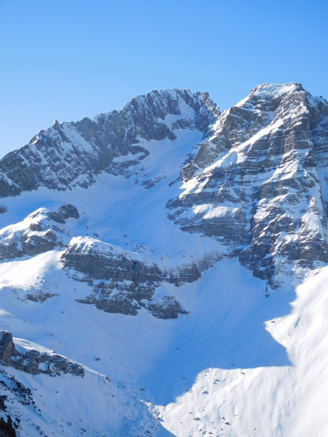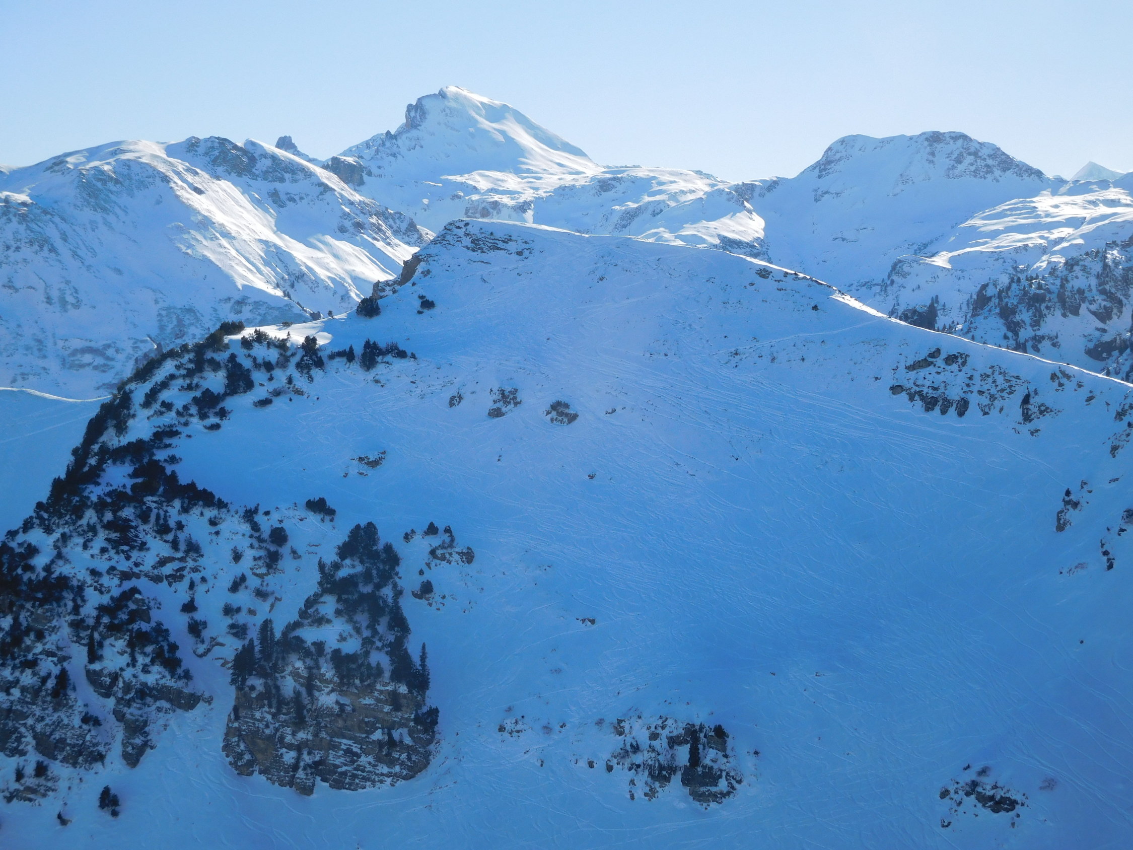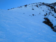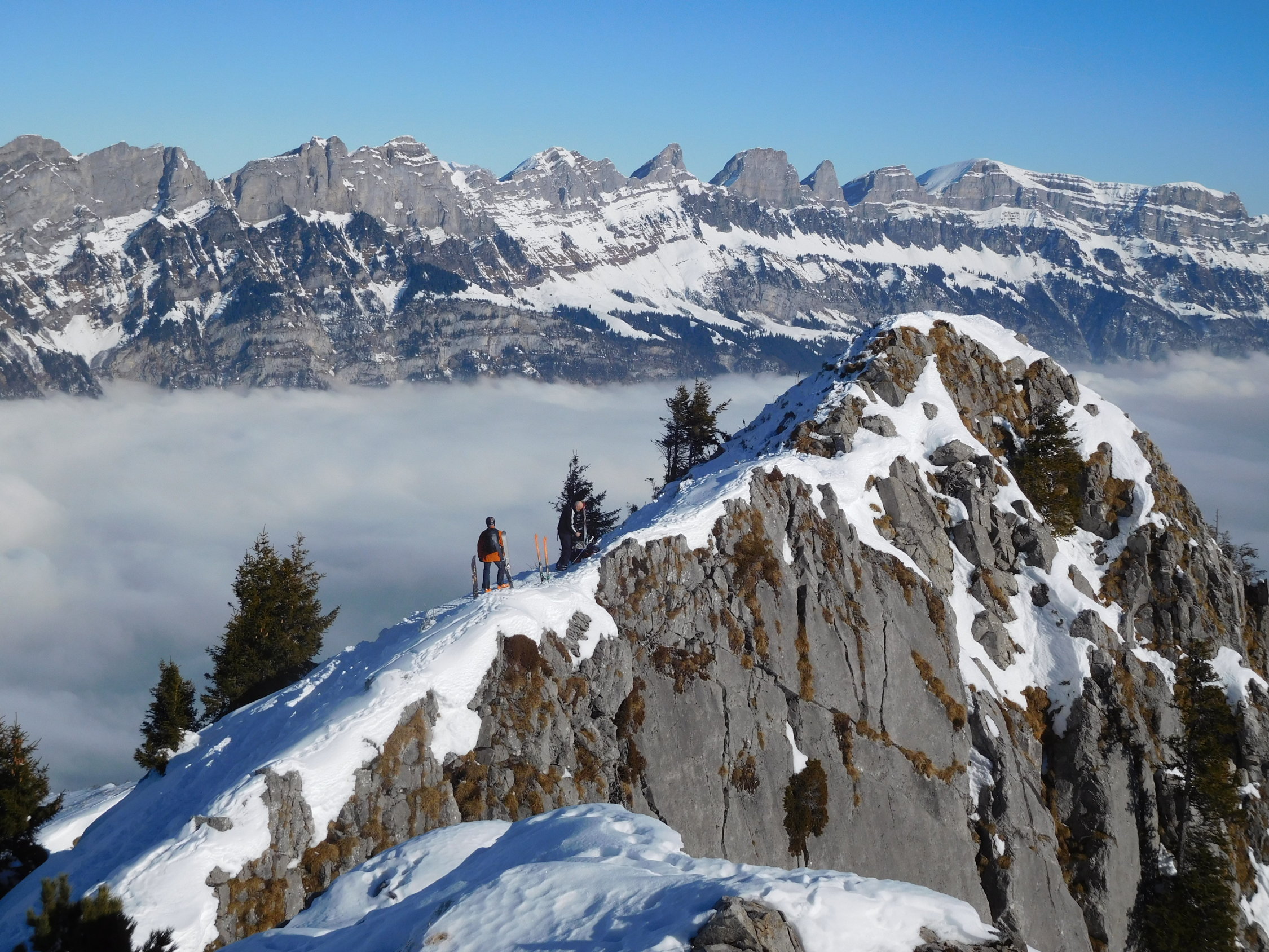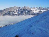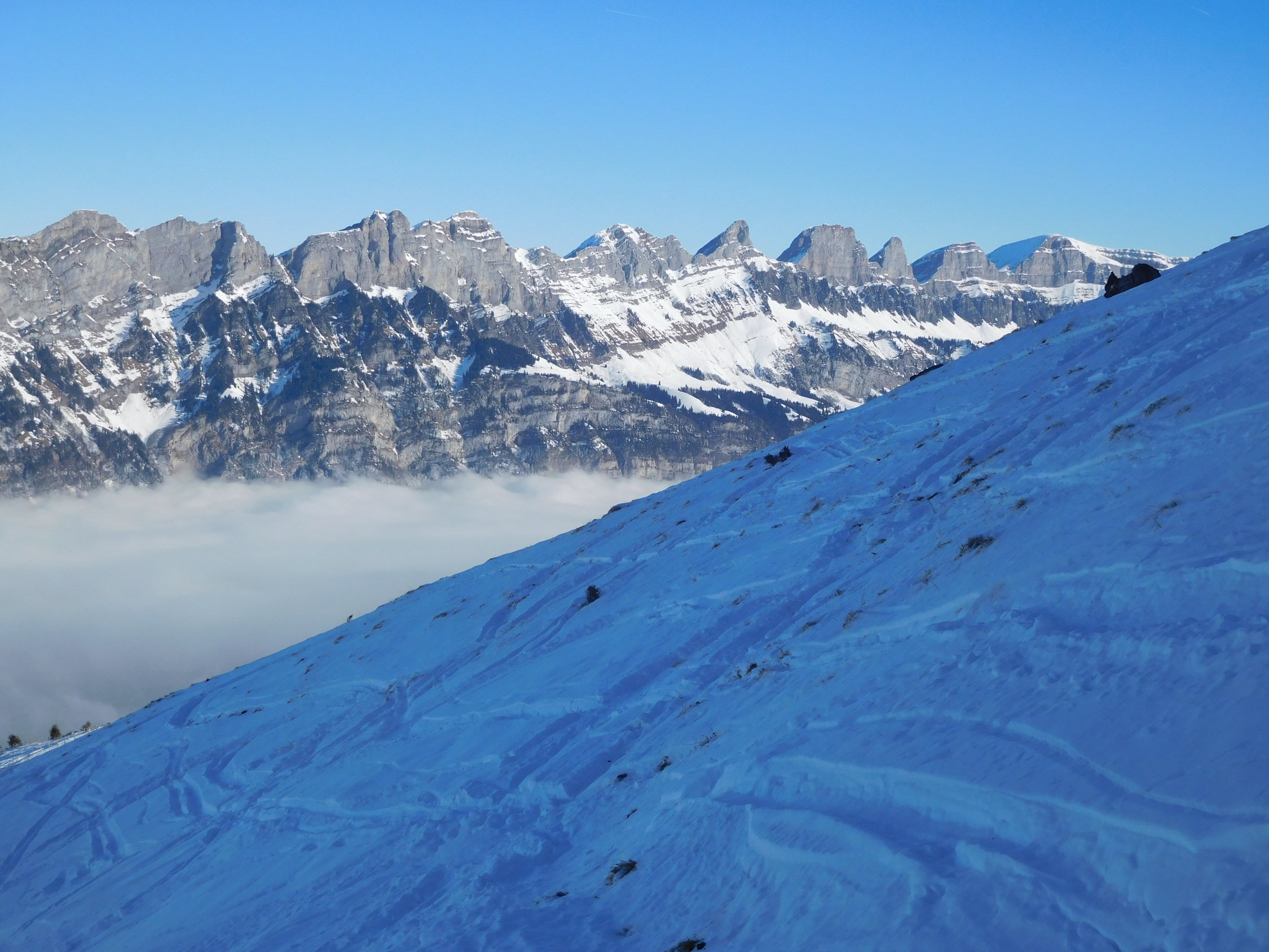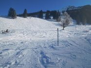 Gipfelhang ohne Gras- und Steinkontakt nicht begeh- und fahrbar -- trotzdem lohnend. Es gibt teilweise noch gut fahrbaren Pulverschnee