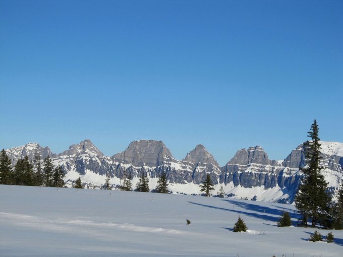 Schnee pulvrig, aber total zerfahren und im unteren Bereich bis zur Alp P. 1737 m praktisch fast pistenähnliche Verhältnisse. Über die Gletti viel grün, da Schnee stark verblasen wurde. Aber dem Südostrücken bis zum Gipfel mit Schneeschuhen okay, die letzten Meter im Gras zu Fuß zum Gipfelkreuz