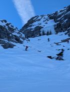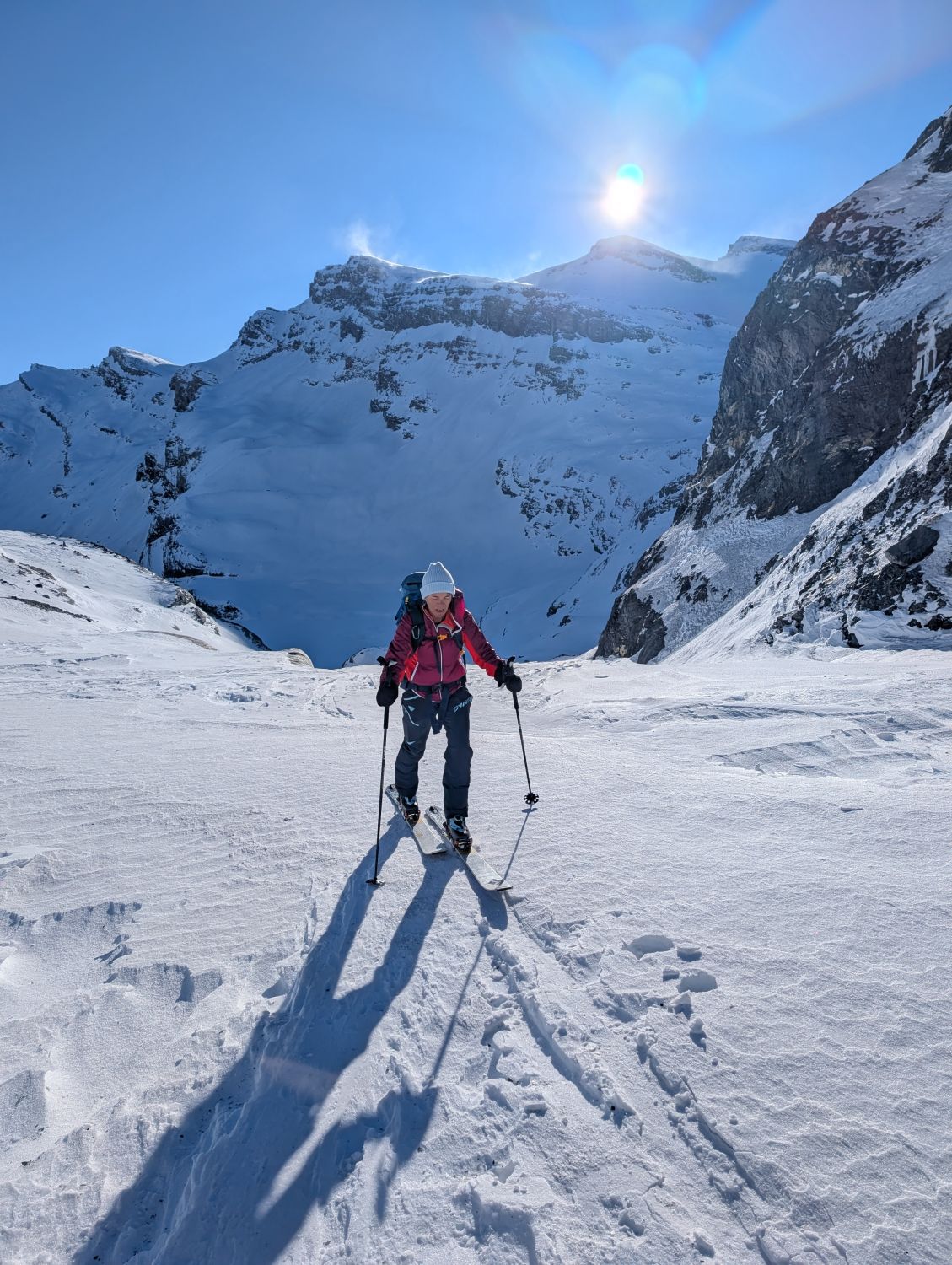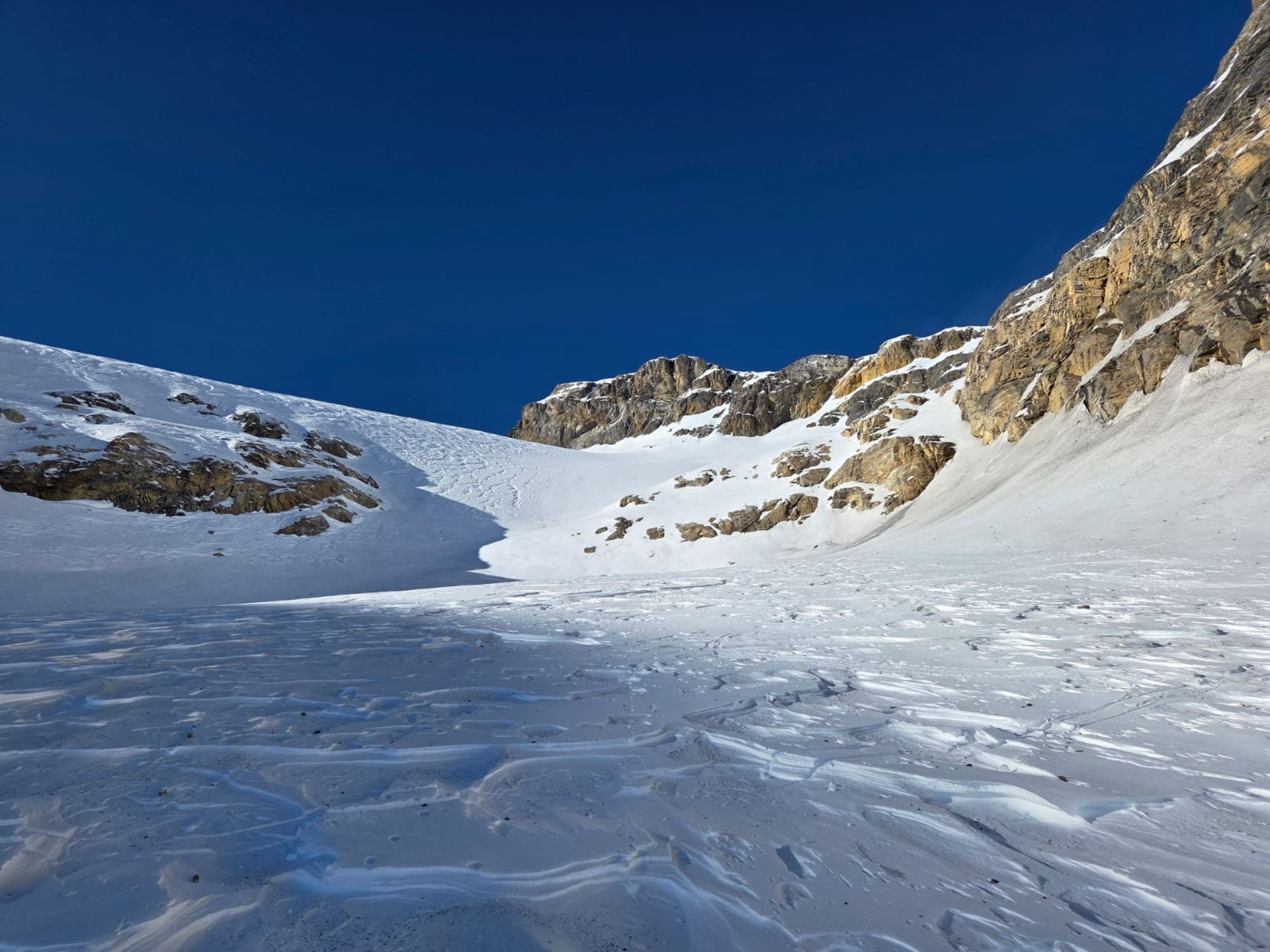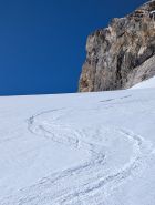 Durchgehend harte Schneeoberfläche. In der Steilstufe nach dem Lämmernboden entweder die Ski kurz schultern oder Harscheisen erforderlich. Runter kann man hier einige Meter mit der nötigen Vorsicht abrutschen. Im Aufstieg auf dem Gletscher, momentan südlich der Felsinsel, gibt es im oberen Teil einige Zastrugis. Abfahrt deshalb mit Vorteil auf der eingezeichneten Route nördlich der Felsinsel. Im oberen Teil durchaus genussvoll abzufahren. Unten bei den Schwüngen in der Abfahrt mehr Feingefühl gefragt. Auf der ganzen Route genügend Schnee, keinerlei Steinkontakt.