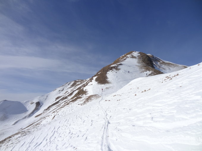Der Föhnsturm hatte offensichtlich schon die ganze Nacht gewütet und hat uns verlässlich begleitet. Entsprechend atemberaubender Aufstieg und eher ungemütliche Gipfelrast. Warm. Auch lag keine Schneeflocke mehr dort, wo sie runtergekommen ist - alles blankgefegt. Entsprechend schneearm, viele Steine schauen vor, teilweise sogar ganz aper. Auf dem Grat war ein Teil Skitragen angesagt. Der Schnee hat sich im Tal versammelt.