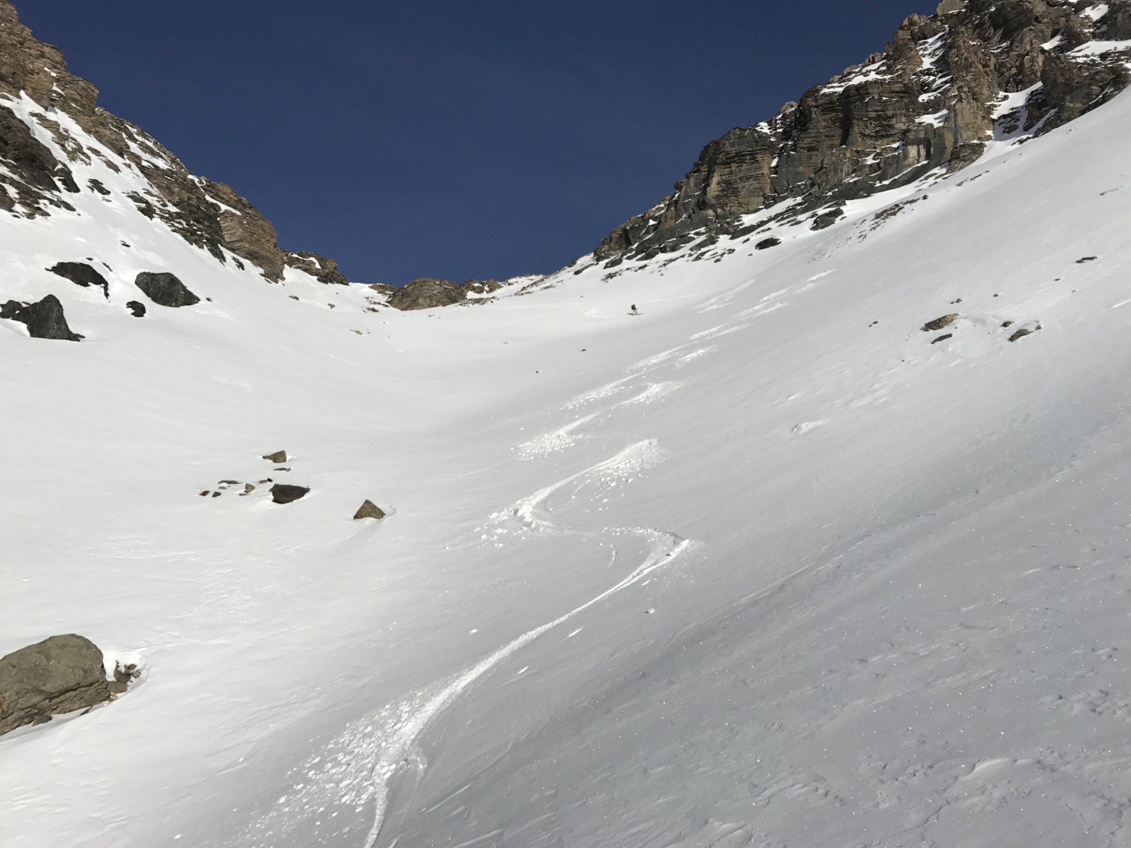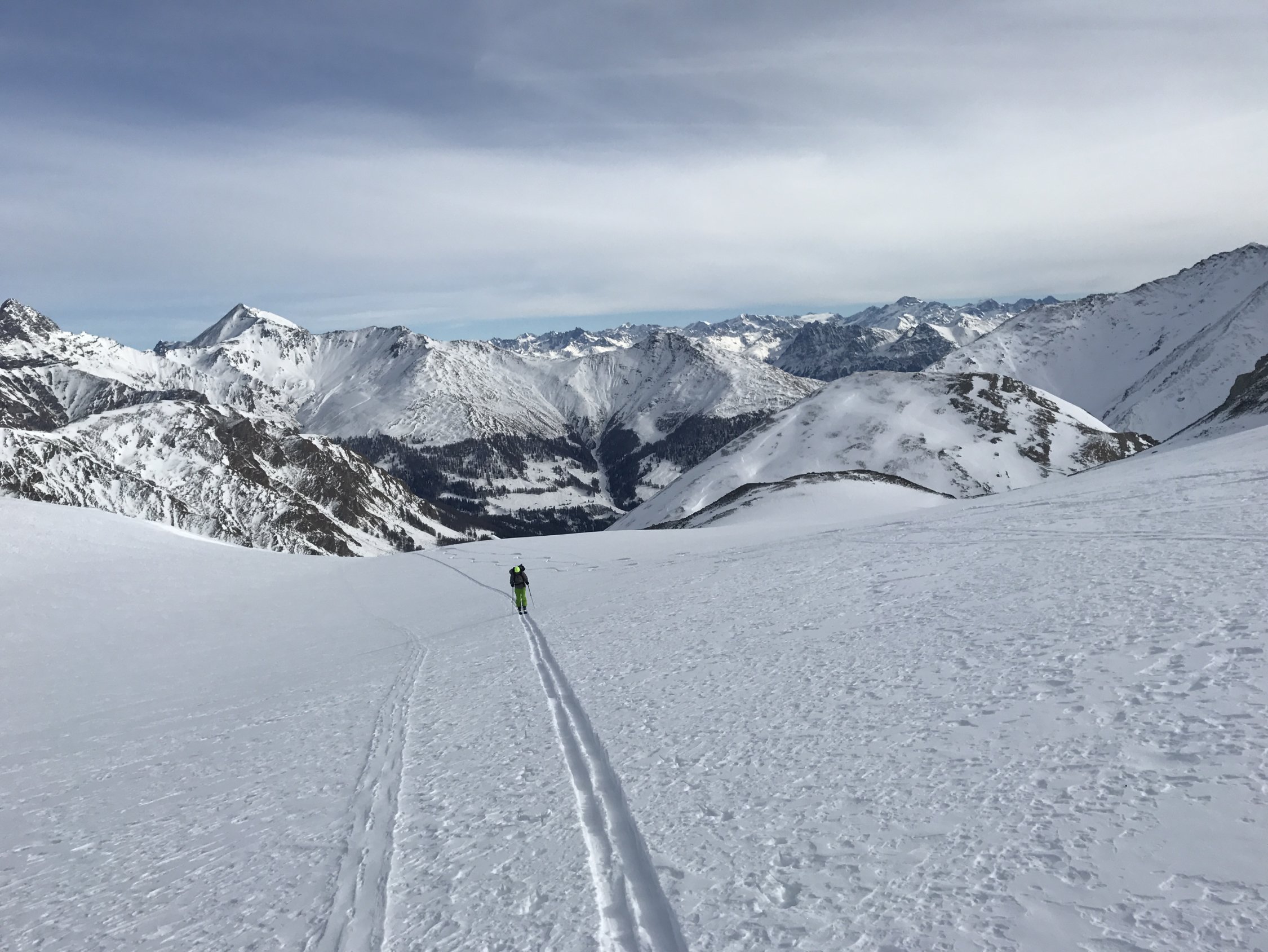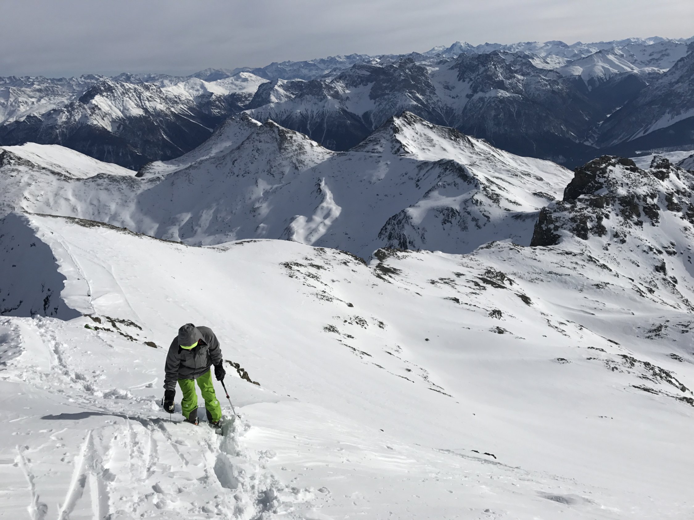 Abfahrt südseitig mit tollem Schnee bis Ils Sulvadis (ca. 2600 m), dann kurzer Aufstieg auf die Scharte südl. Piz Nair (P 2798), dann Abfahrt zurück ins Skigebiet.