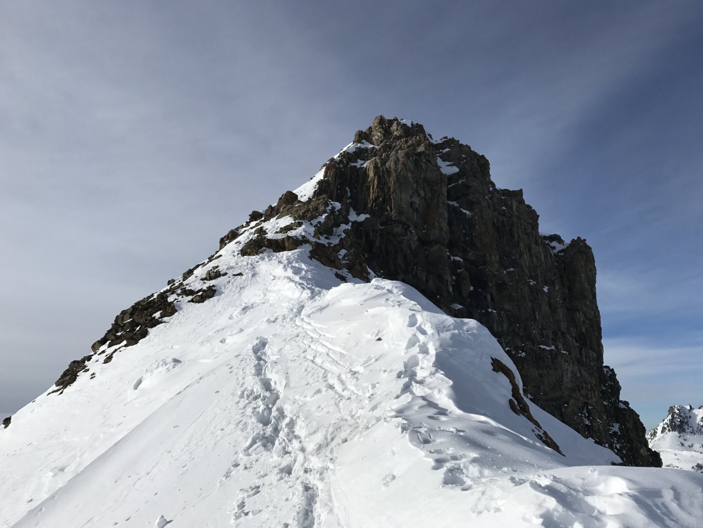 Abfahrt nach Tiral Pulver zwischen steinigen Zonen. Aufstieg über den Vad. Tasna im schönen Pulver. Gipfelgrat ab ca. 3040 m abgeblasen, wir sind von dort mit geschulterten Ski bis unter den Gipfel (3100m) aufgestiegen, Skidepot. Zu Fuss problemlos zum Gipfel (Pickel oder Steigeisen angenehm, geht aber auch ohne).