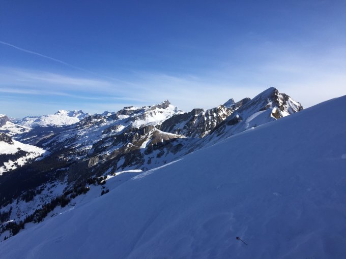 Im unteren Drittel bis Alplen (1380) führt die Strecke entweder über die Strasse oder durch verspurtes Gelände mit etwas nassem / schwerem Schnee. Anschliessend Aufstieg in zwei Stufen zur Alp "Stock". Im Aufstieg dorthin grösstenteils windgedeckelter Schnee. Danach, auf ca. 1850 müM haben wir dann die Harsteisen montiert. Bruchharst, aber auch Triebschnee (Pulver-gut) im Wechsel. Für die Abfahrt haben wir die Variante über "Butzen" gewählt. Um nicht noch einmal nach "Stock" queren zu müssen. Die Verhältnisse auf der ganzen Abfahrt haben unsere Erwartungen deutlich übertroffen. Die schönen Stellen mit Triebschnee / Pulver sind sehr gut erkennbar und auch im steilen Gelände gut verfestigt. Ansonsten ist der Deckel tragend. Alles gut zu fahren.