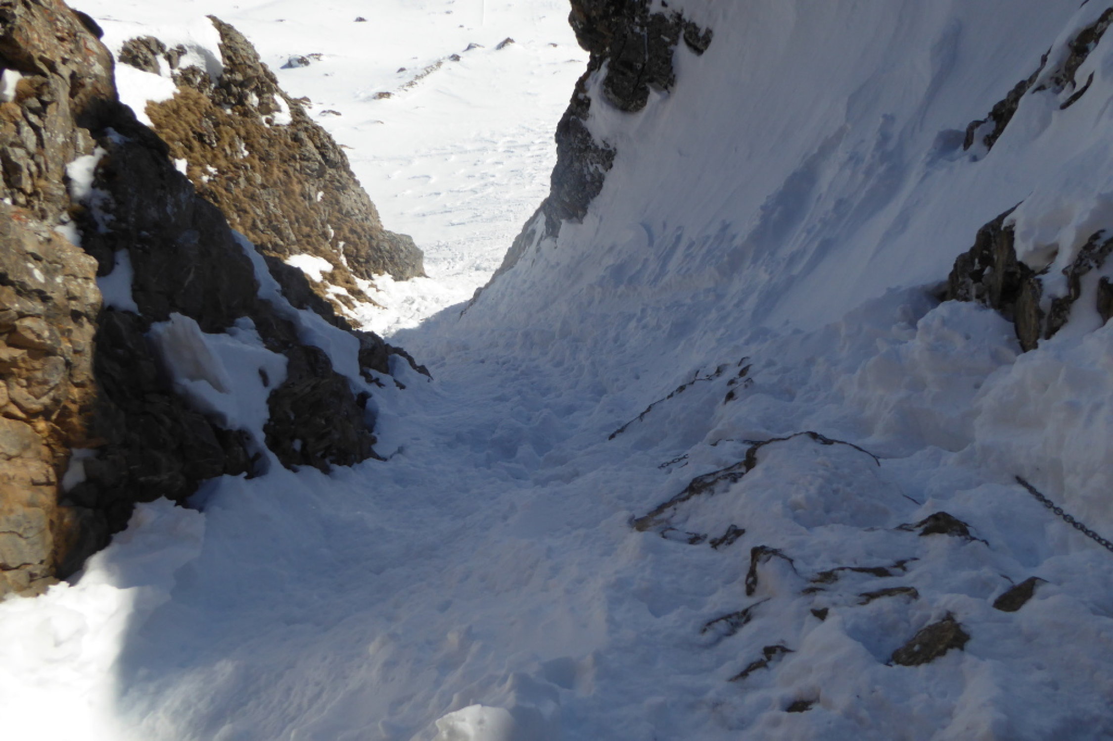 Der Aufstieg zum Spitzmeilen ist mit Steigeisen gut zu machen. Oben kommt die Kette aus dem Schnee.