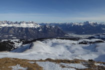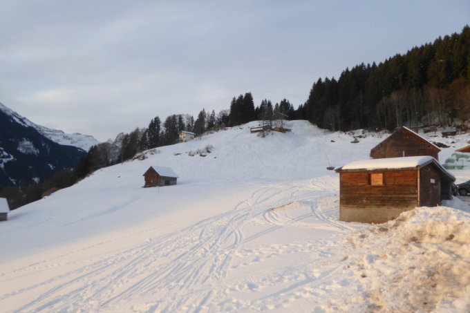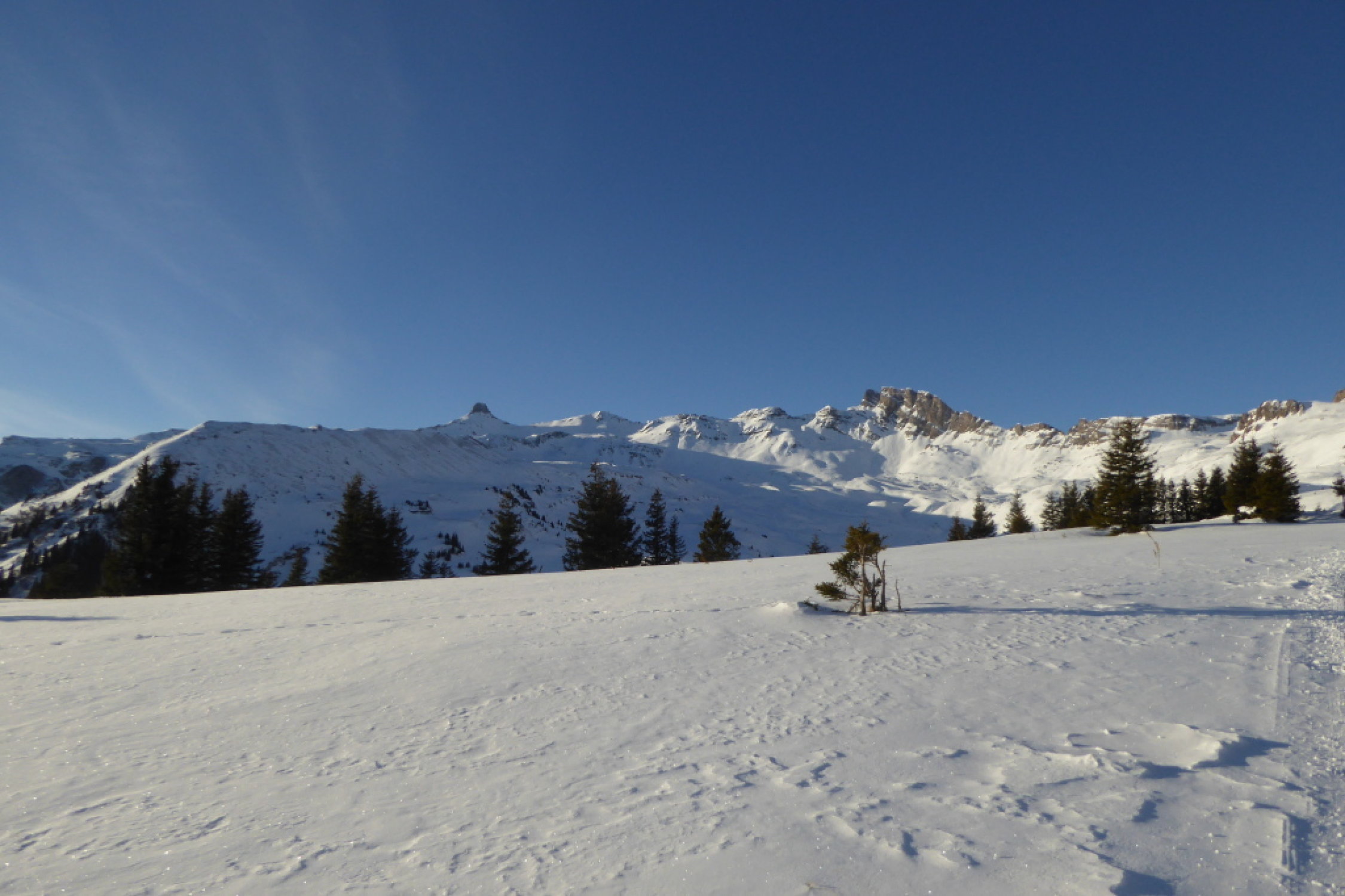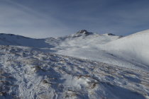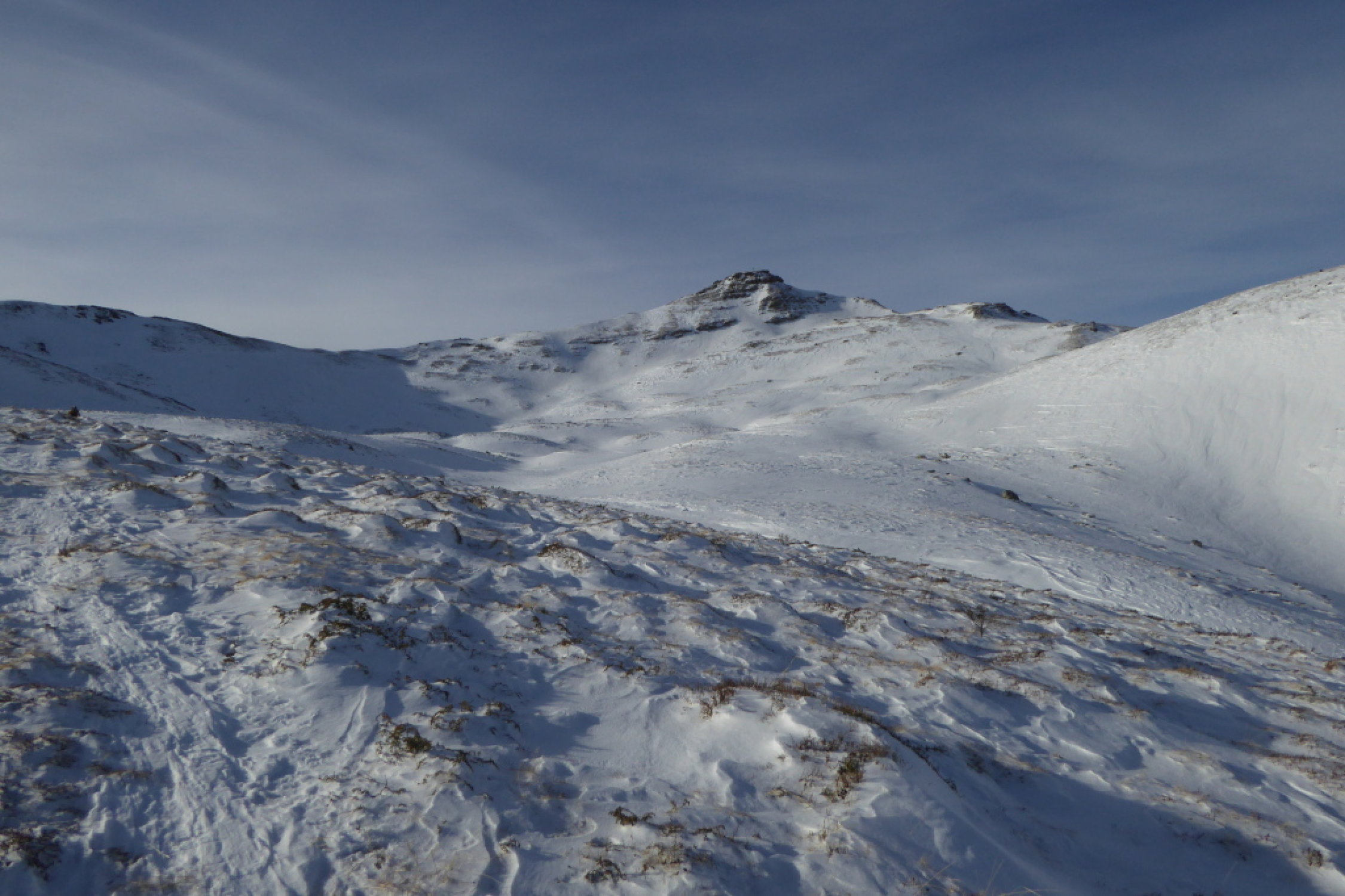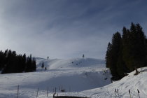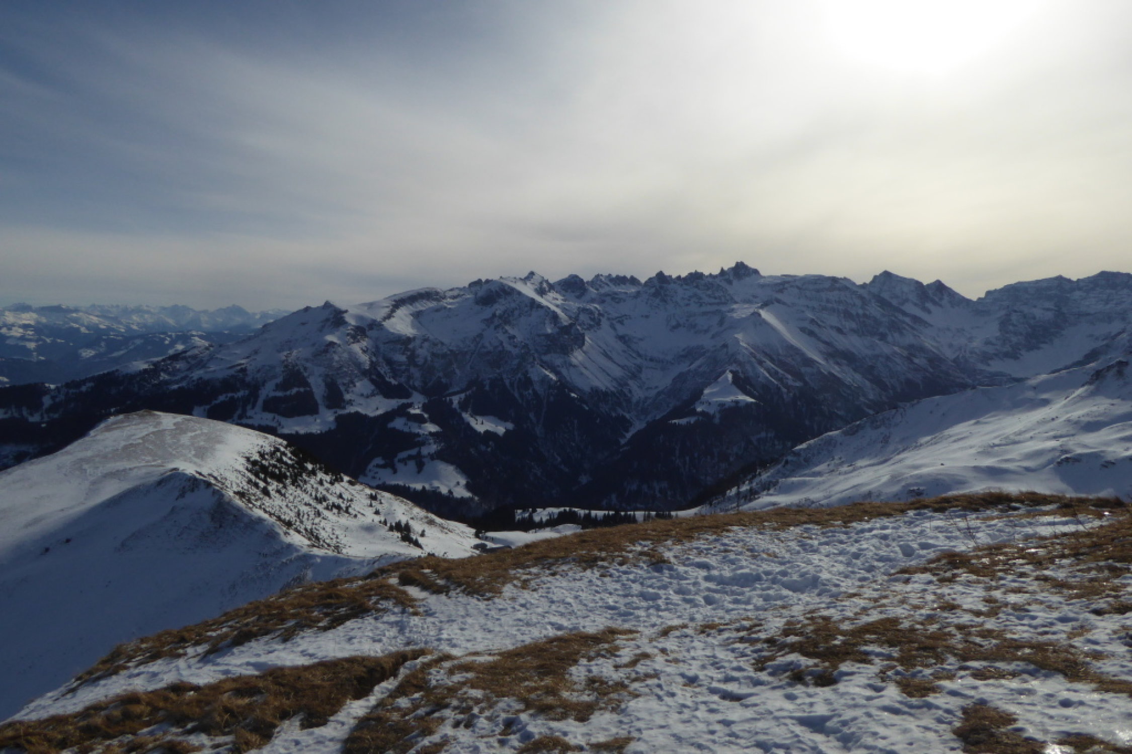 Ab Vermol genügend Schnee bis zur Alp Vorsäss. Auf der Ebene in Richtung Hüenerchopf sehr stark abgeblasen und wenig Schnee auf der Route vorhanden. Der Weg über den Rücken auf den Gipfel komplett schneefrei.
