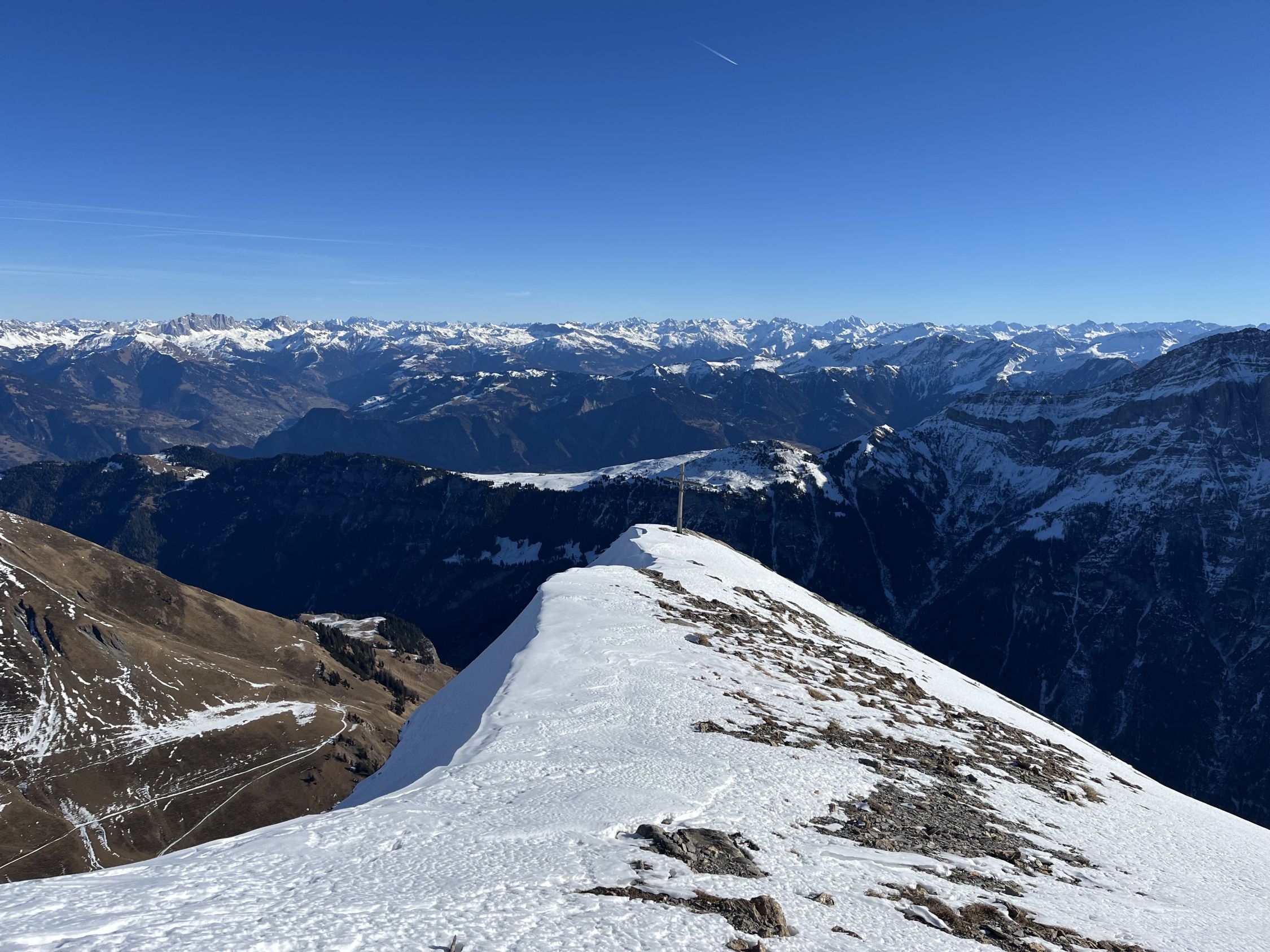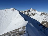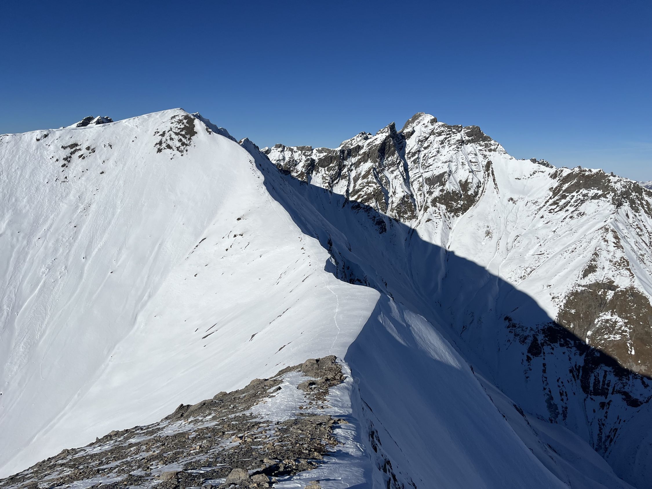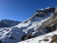 Weitgehend aper bis Gelbberg, bis hier zu Fuss. Dann mit Schneeschuhen auf sehr magerer Schneedecke zum Sattel. Hier oft sulzig, da relativ warm. Grat mit wenig Schnee.