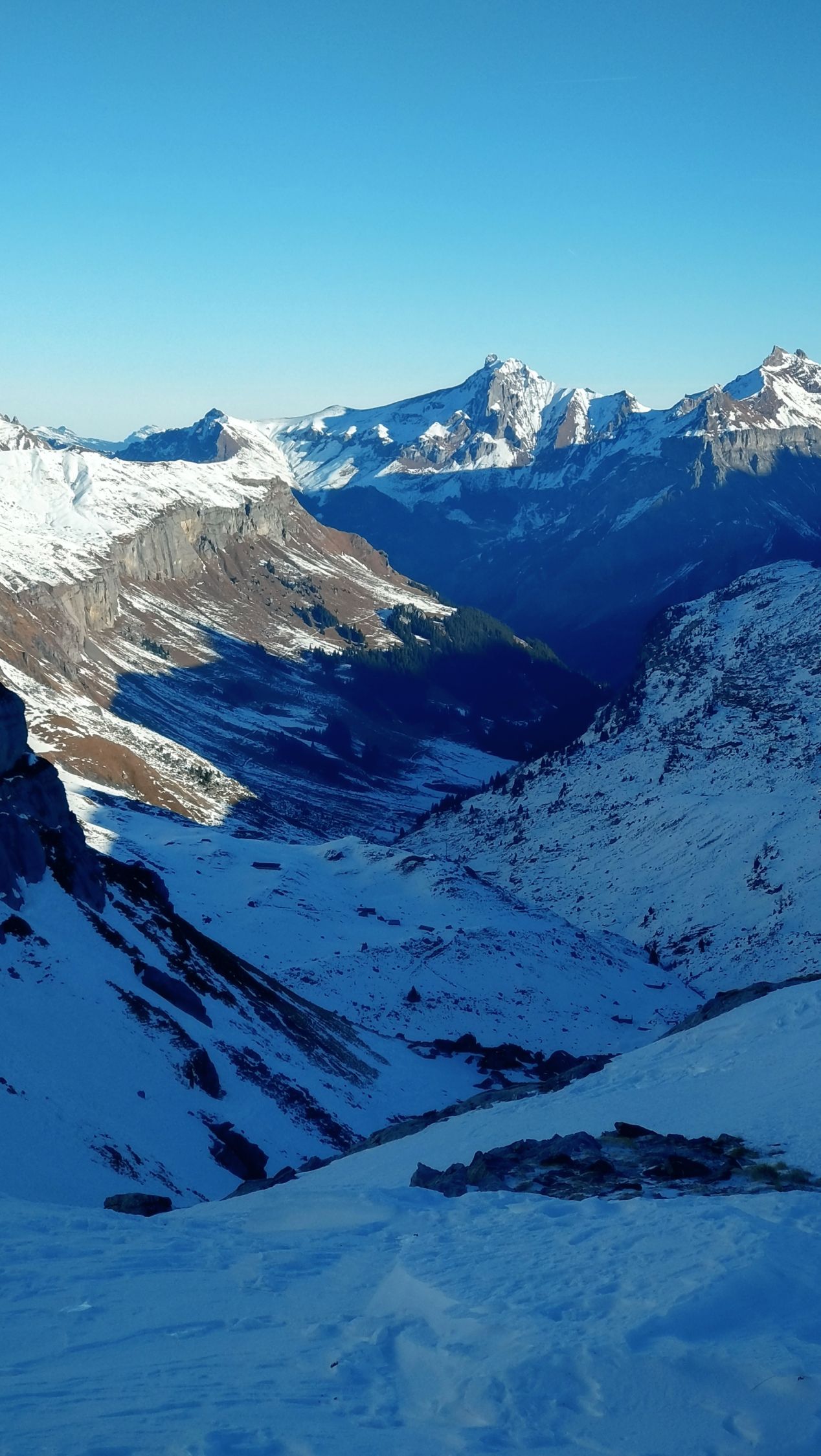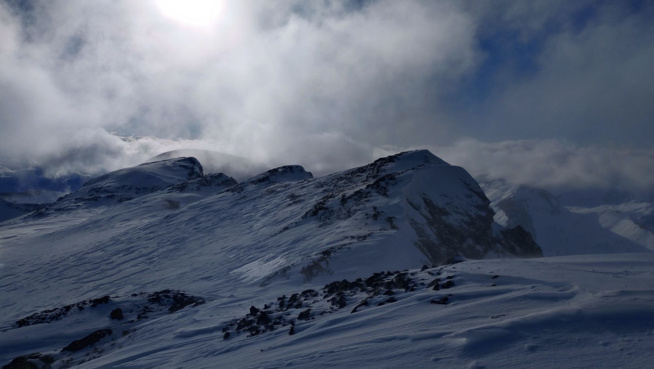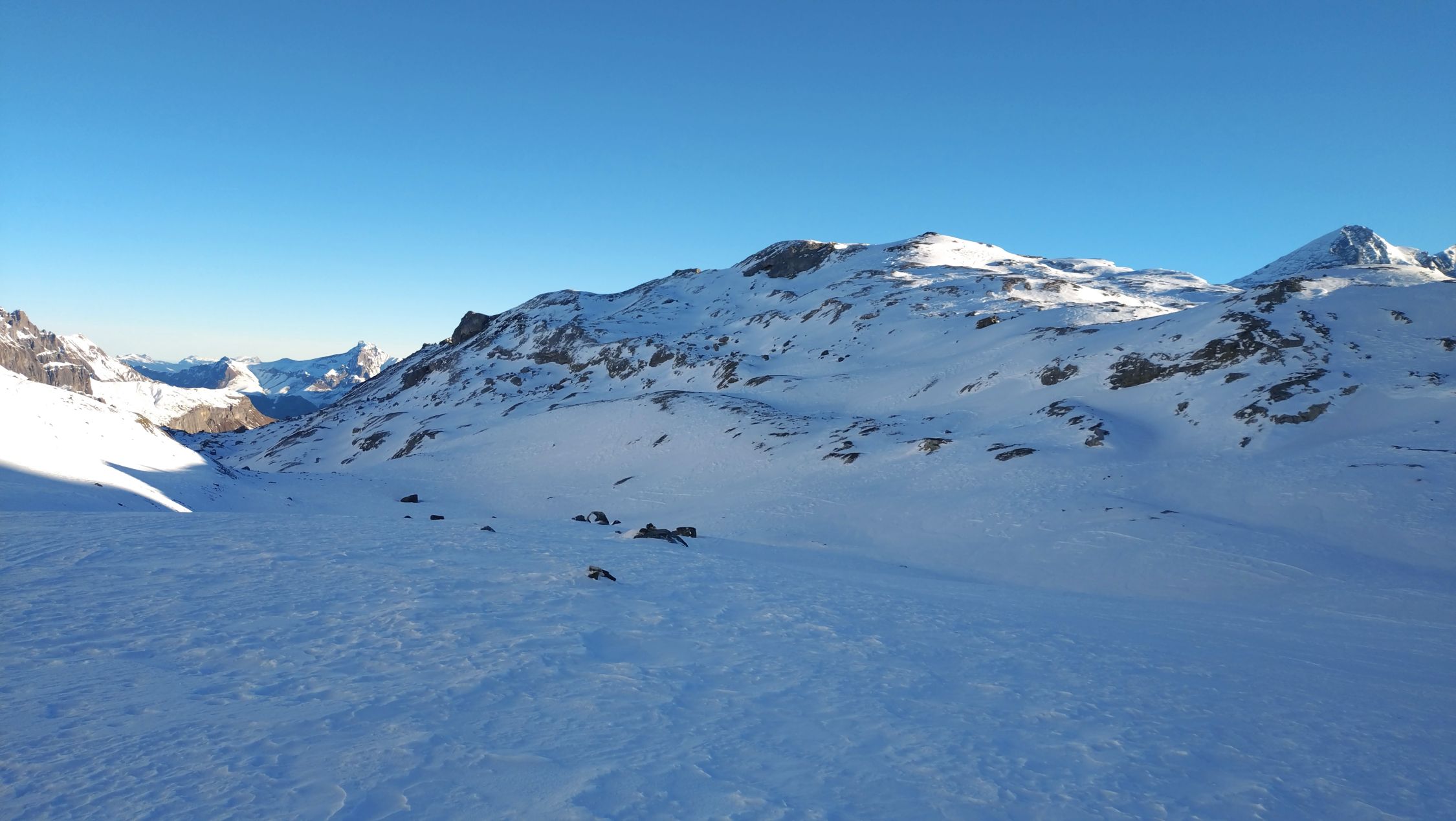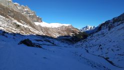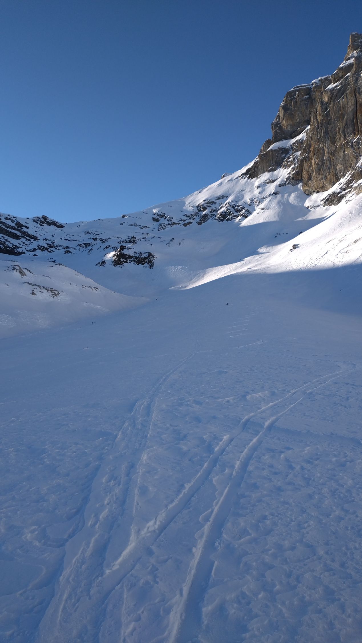 Der Aufstieg ging heute ohne Harscheisen. In der Abfahrt meistens tragend hart, aber nicht immer. Der Windeinfluss ist gut sicht- und spürbar. Die Walliswäng haben nur wenig Schnee und eine gute Spürnase für eine Route ohne Steinkontakt ist gefragt. Die Bachquerung geht gut, jedoch hat es aktuell mehr als eine. Bei PT.1620 bin ich der Skitouren gefolgt, weil die Strasse aper ist. Bei PT.1548 ist definitiv fertig mit Skifahren, weil die Strasse geräumt ist. Bis dort musste ich die Skis 4x kurz tragen. Die Route ist grundsätzlich machbar, aber mit den Schneeverhältnissen kein grosses Vergnügen.