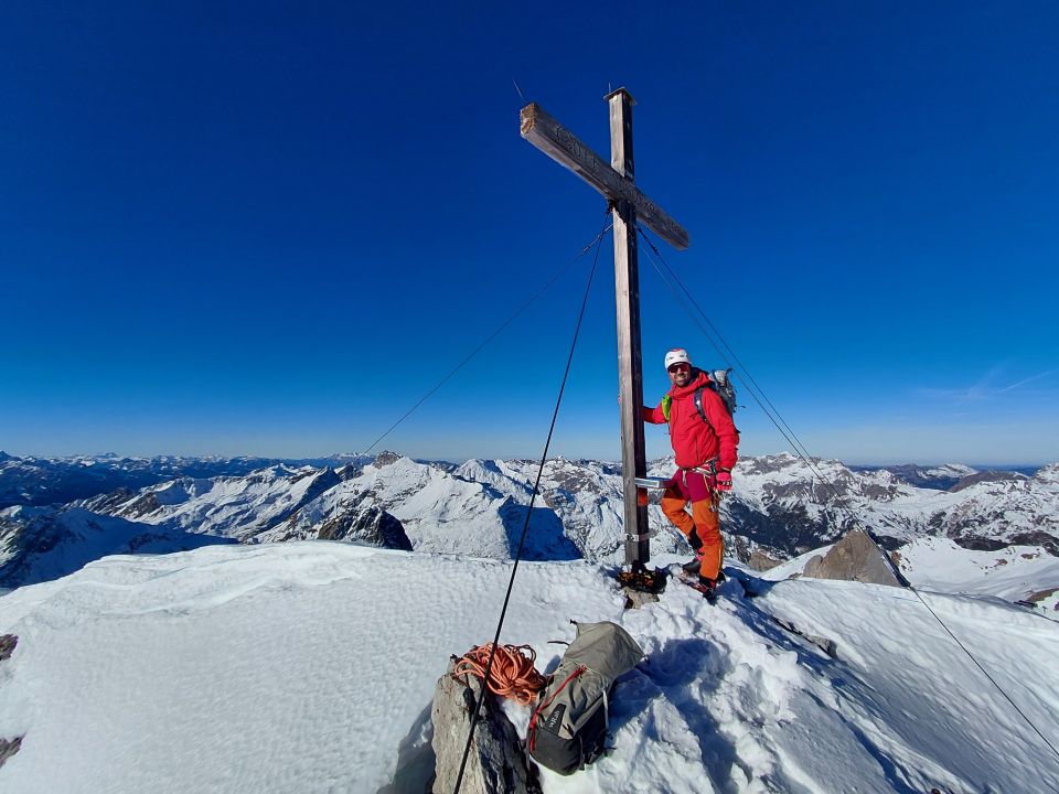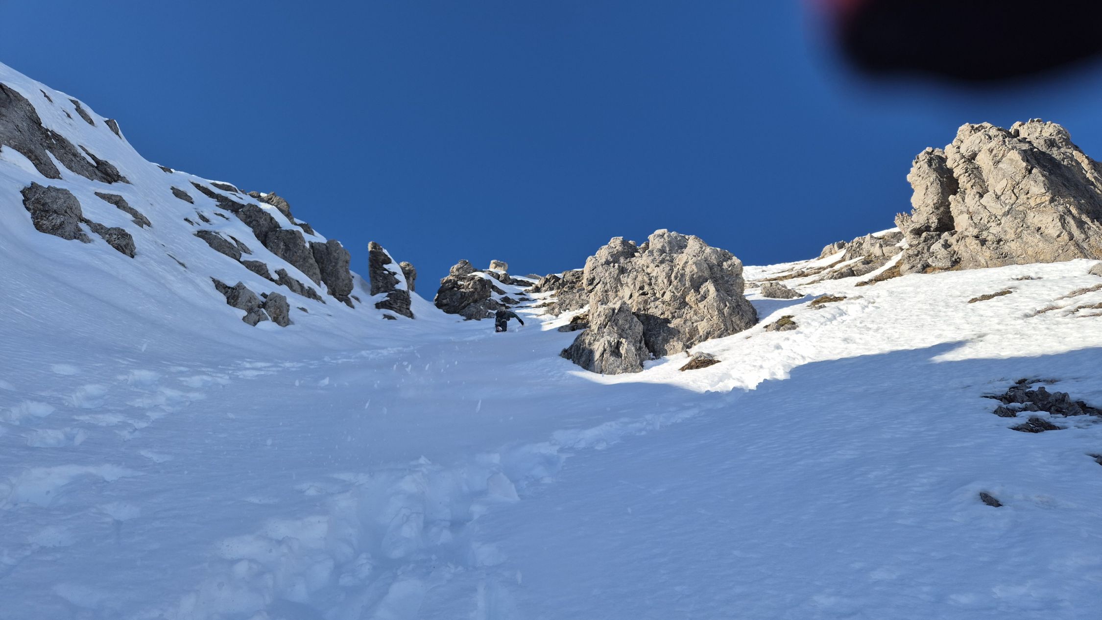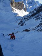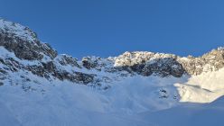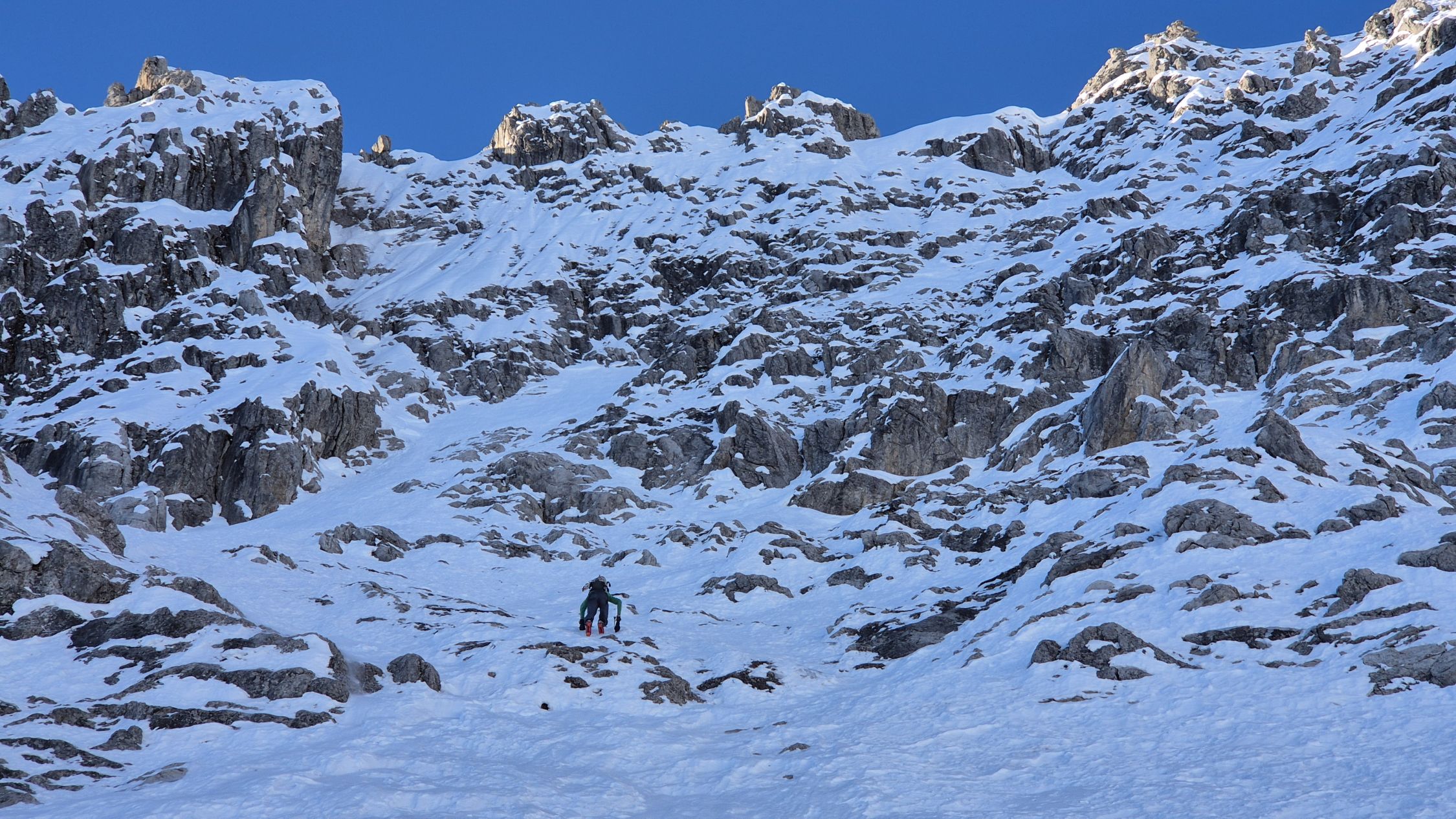 Pistenschitour zum Wandfuß eisig, schlecht. Klettern im Schnee in der Ostwand war recht gut. Kalt!