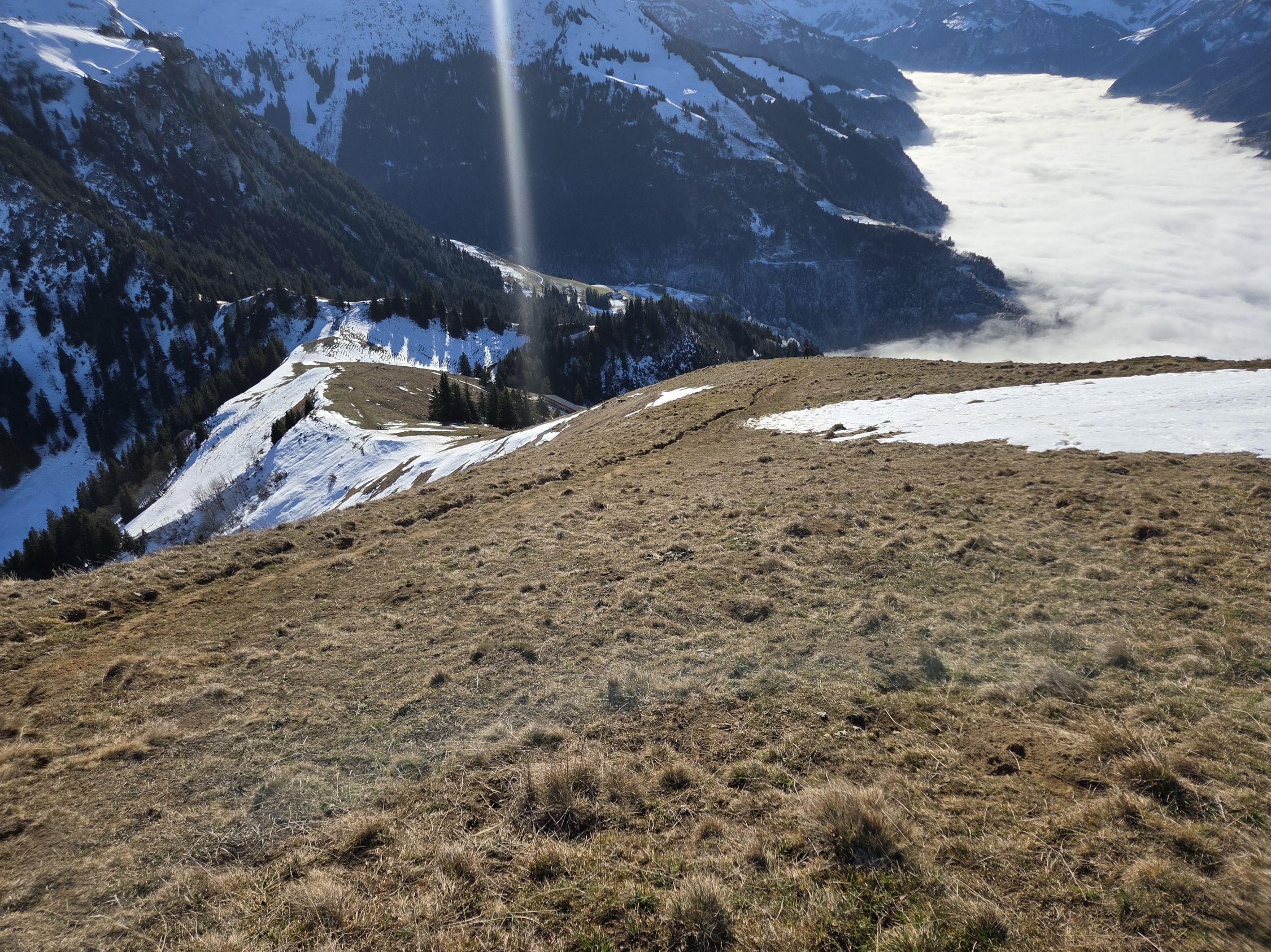 Abstieg via Bleiki. Grundsätzlich fast schneefrei. Schattige Stellen noch Schnee oder Eis. Mühsamer bzw. schliffriger waren die teils recht rutschigen und nassen Bergwege. Hier lohnen sich gute Profilschuhe.