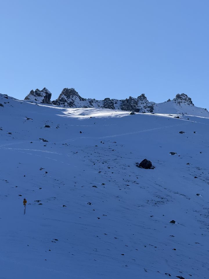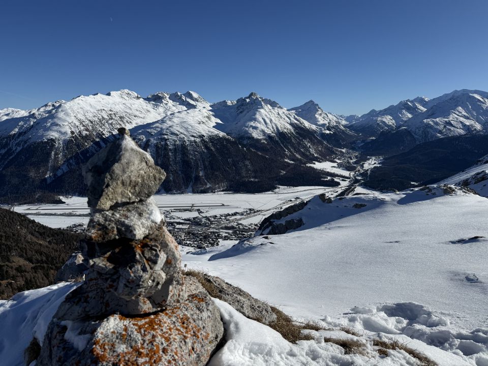 Rundtour mit 30 cm Schnee ab Alp Munt, Abstieg via Alp Muntatsch Punkt 2187. T4, Minus 10 Grad, Start Slilift Survih, 8.45, windstill, wolkenlos, Sonne an Peidra Grossa. Der Wanderweg im God da Munt teilweise vereist, wir waren mit Hochtourenschuhen und Grödel unterwegs. Ab Alp Munt im Schneenhoch, teilweise Spur. Ab Margunin viel Schnee und keine Spur mehr. In der Ostflanke 50 cm Schnee ohne Unterlage und mühsames hochsteigen. Abstieg via Alp Munt und Alpgebäude Muntatsch nach Samedan.