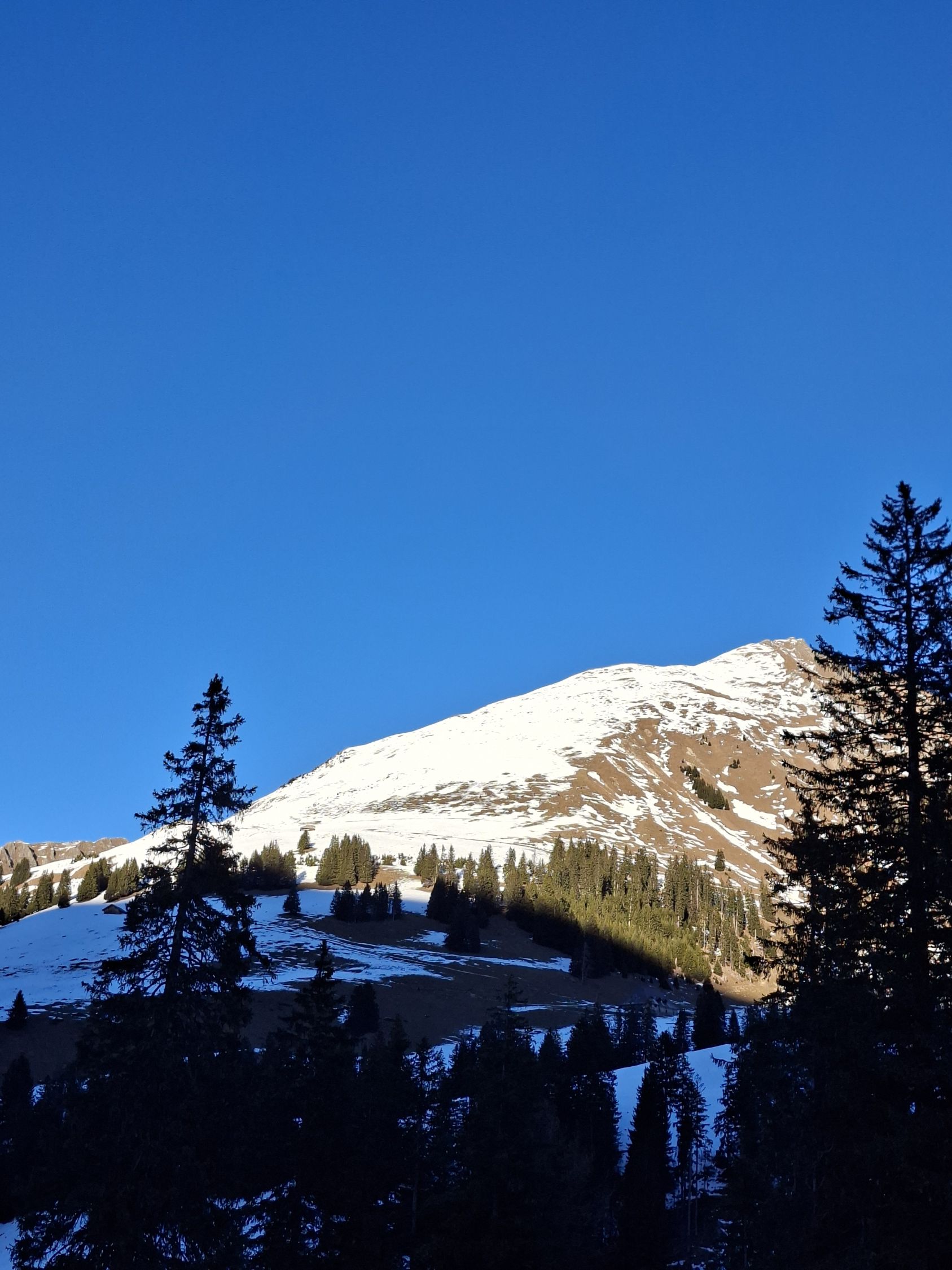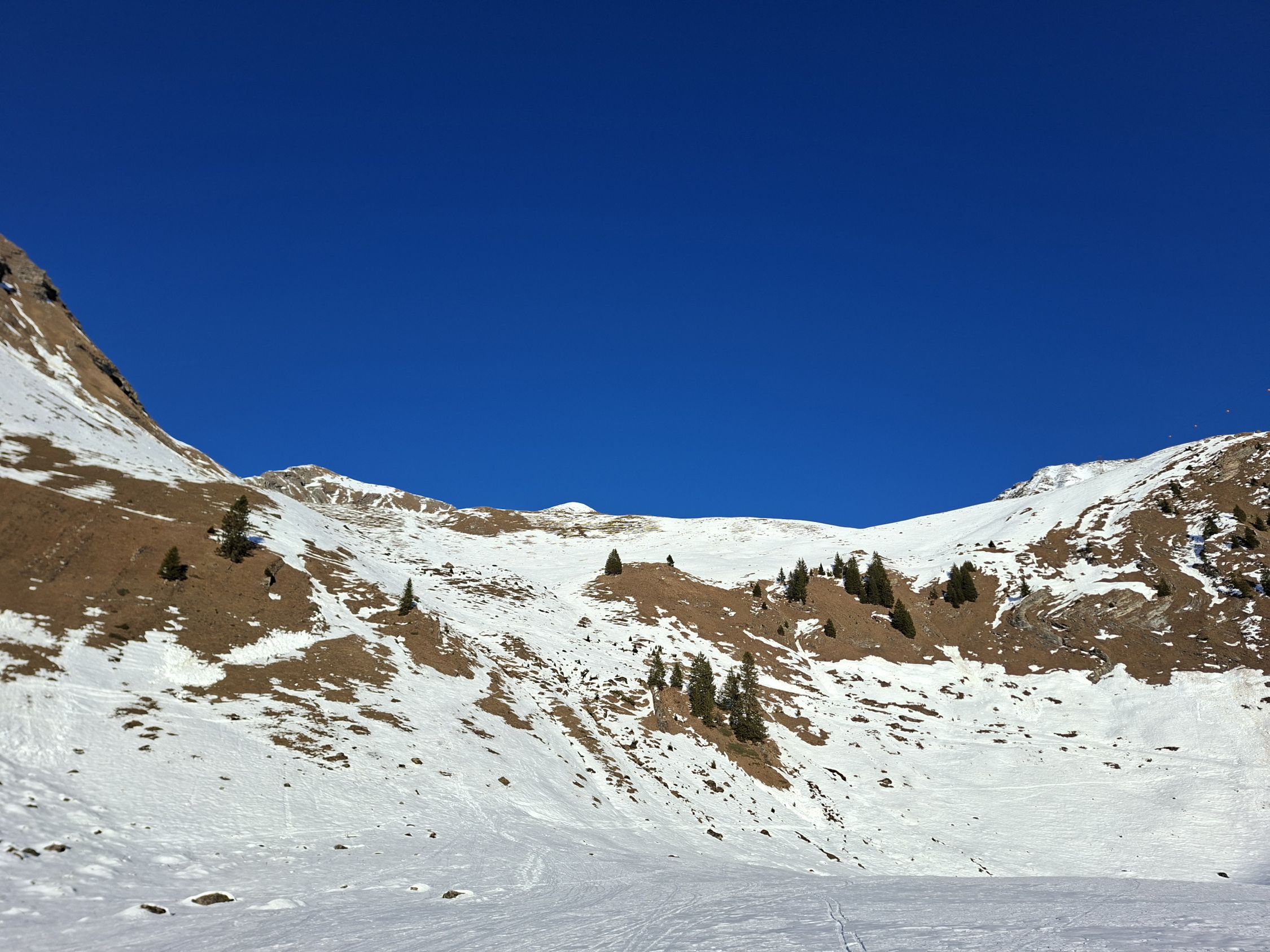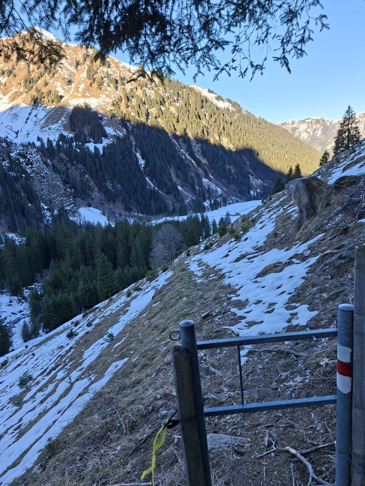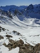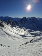 Abfahrt: Vom Gipfel Querung zur Scharte Pt. 2535 war es hart. Die Steilpassage (50°) bin ich zu Fuss abgestiegen, weil es zu wenig Schnee hat. Bis Mittelberg hatte es Sulz, dann bis zum Parkplatz Hartschnee.
