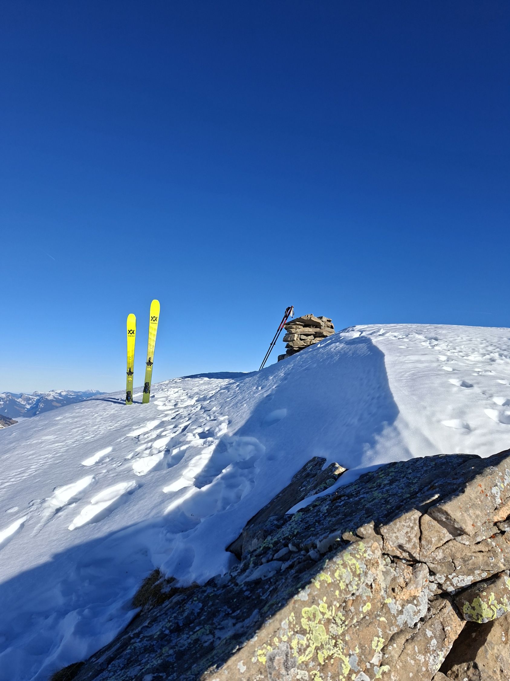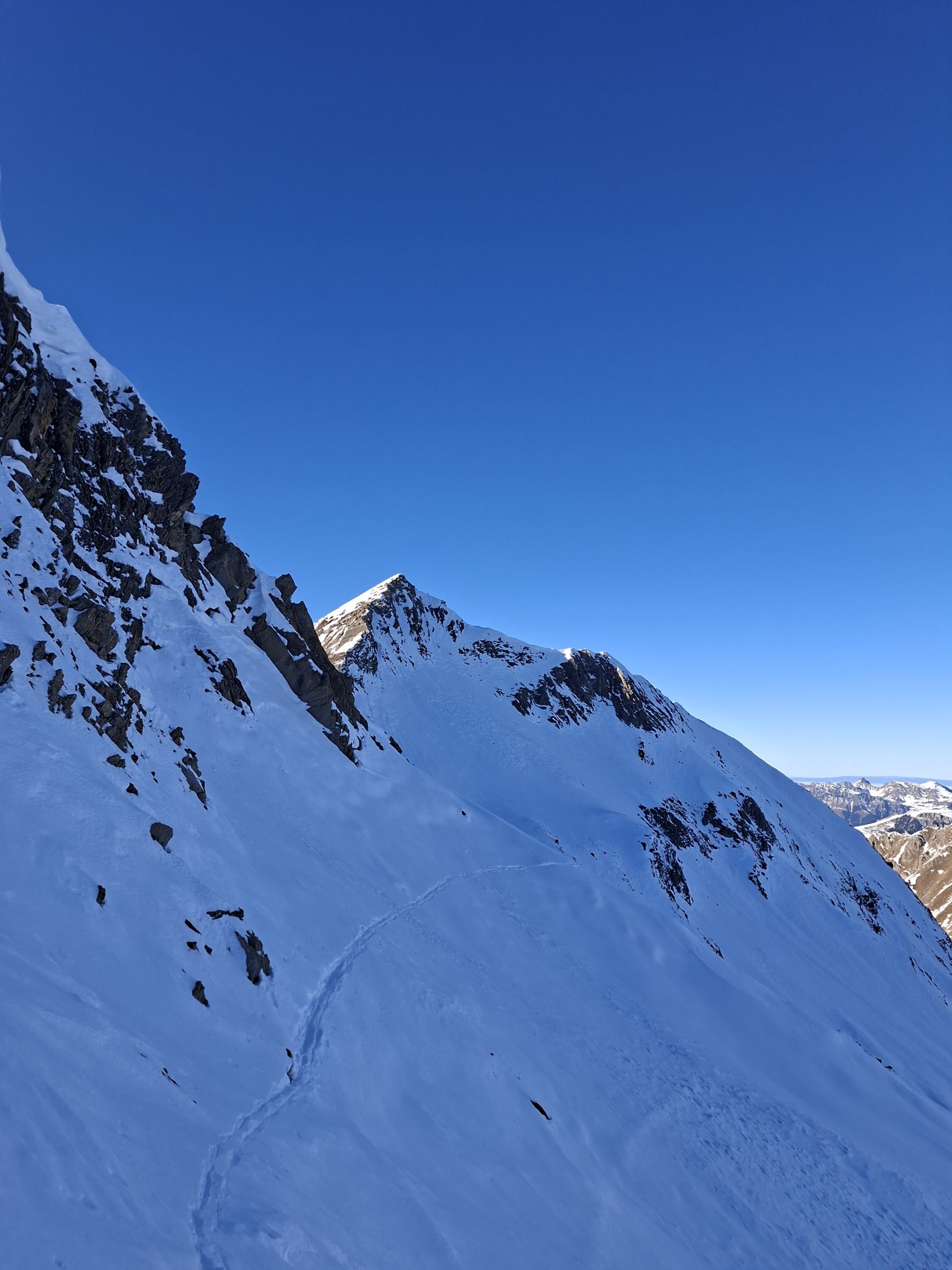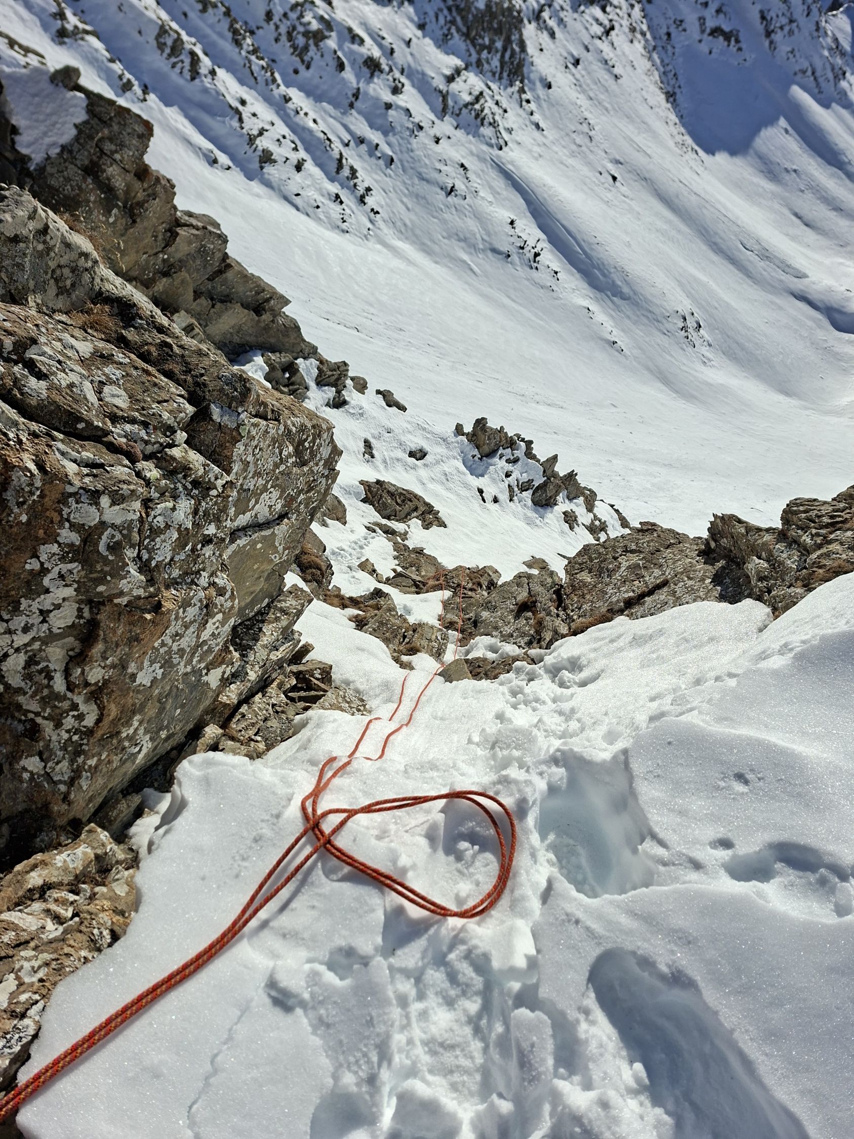 Abfahrt: Vom Gipfel Querung zur Scharte Pt. 2535 war es hart. Die Steilpassage (50°) bin ich zu Fuss abgestiegen, weil es zu wenig Schnee hat. Bis Mittelberg hatte es Sulz, dann bis zum Parkplatz Hartschnee.