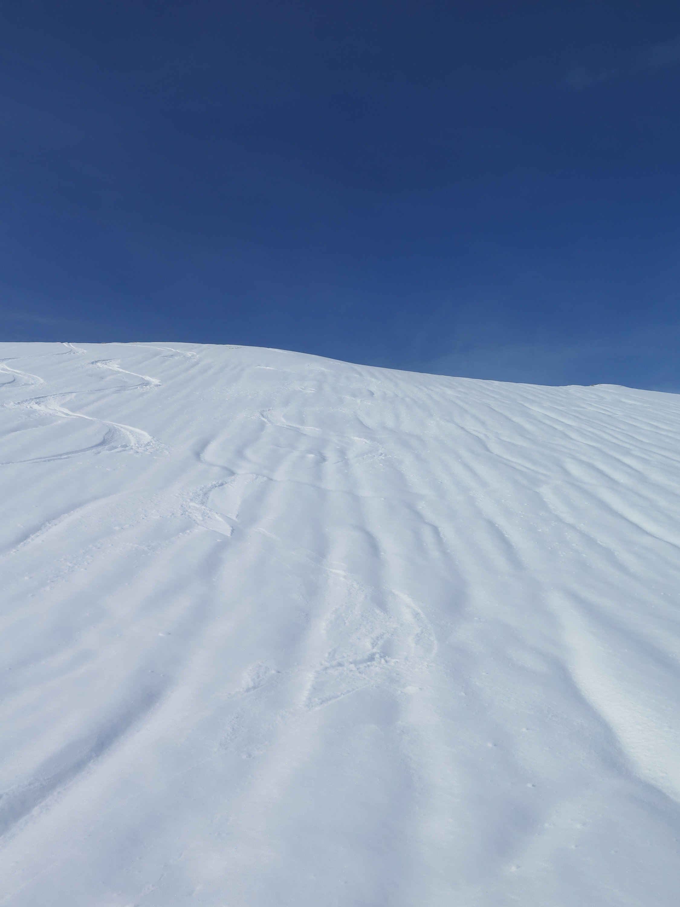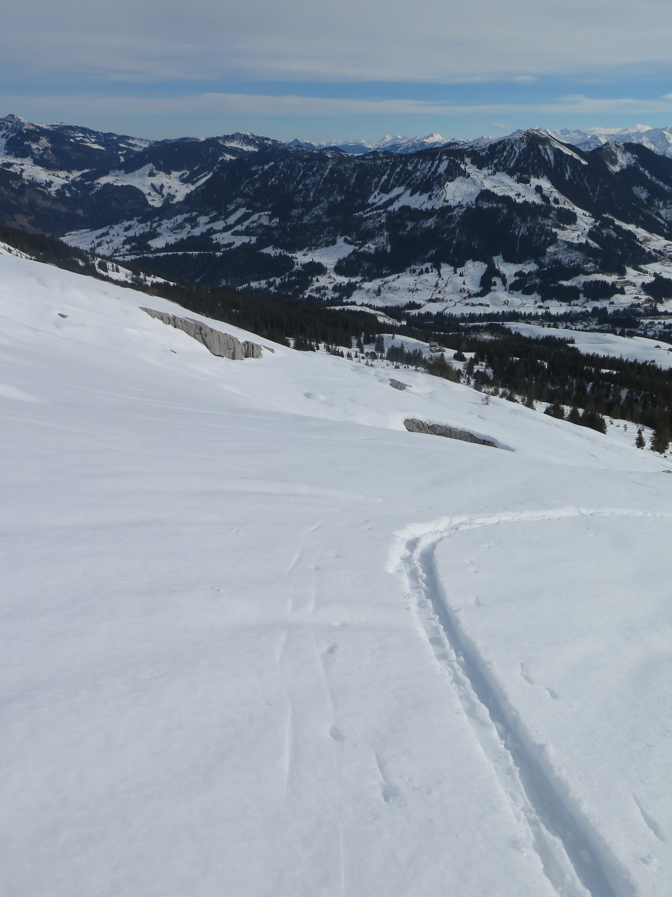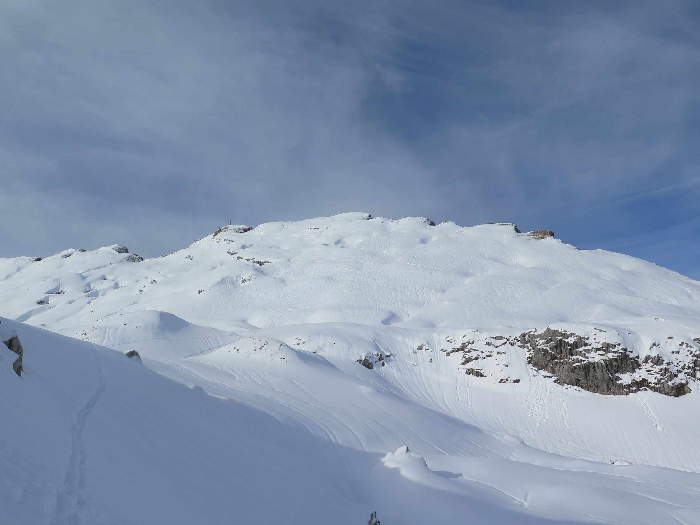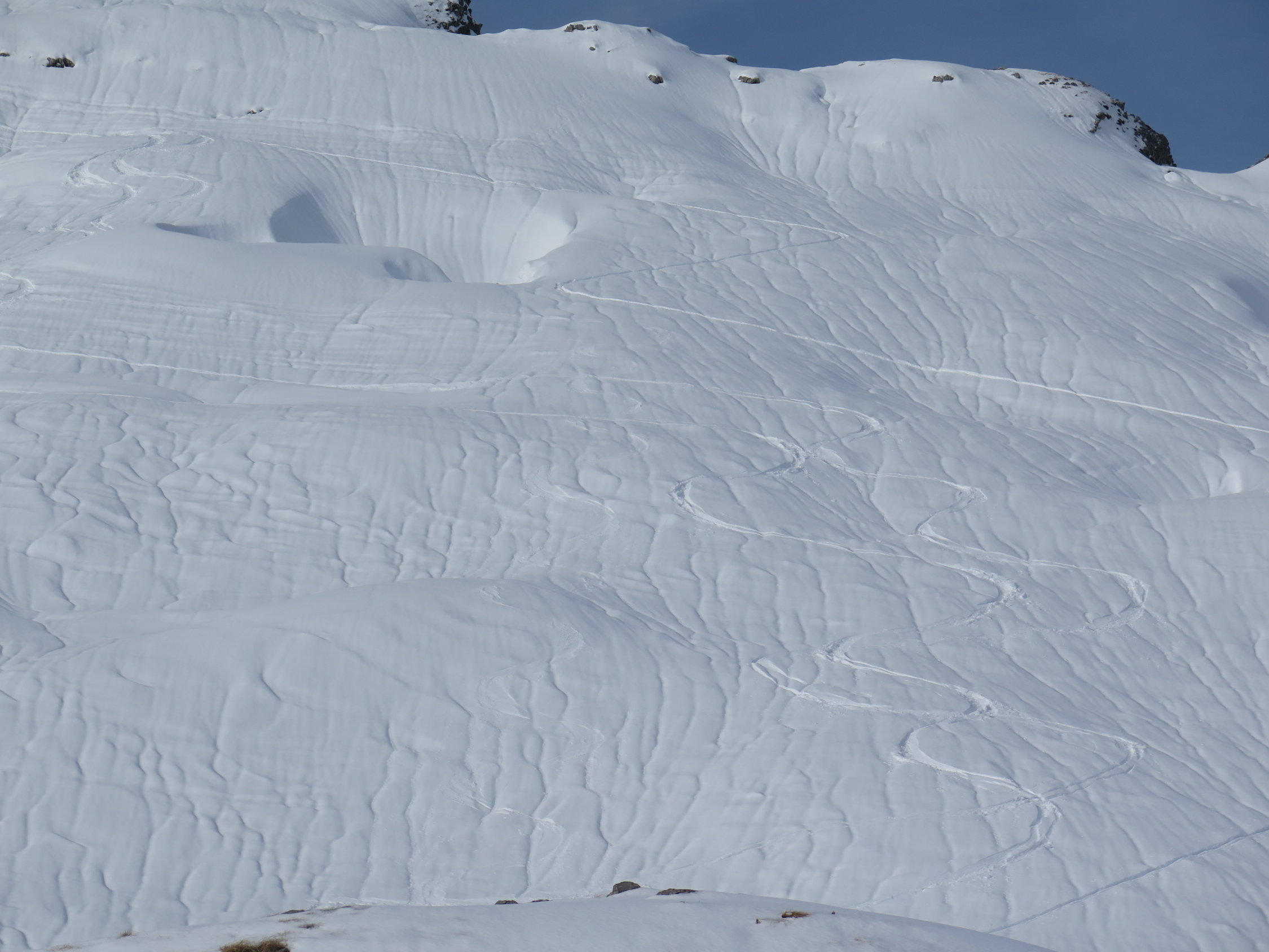 Gestern war wärmer. Es ist eine Aufstiegsspur und 2 Abfahrtspuren vorhanden. Oberhalb des Waldes bis zum Gipfel sieht man Wasserrinnen in der Schneedecke. Bei der Abfahrt bis zum Rest. Schlund Tragende Schneedecke. Je nach Exposition etwas Aufgesulzt. Unten wars schon etwas weicher. Der Schlussteil War etwas rupig und dazu bremsschnee, da es viele Spuren der letzten Tage hat. Dazu der viele Regen.