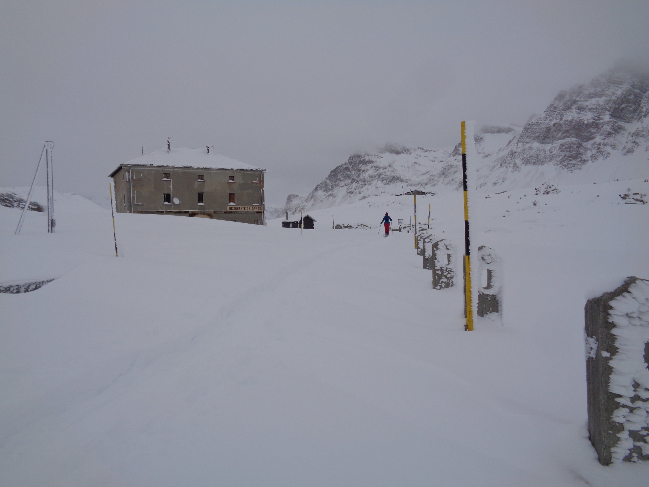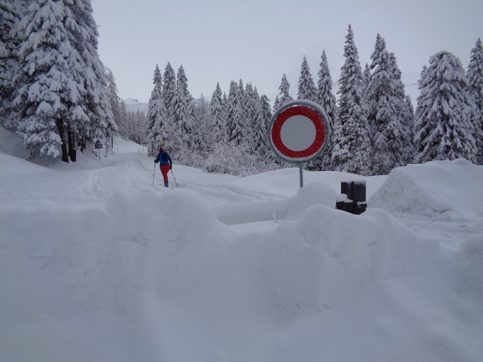 Kaum hat man den San Bernardino-Tunneldurchquert befindet man sich in einer anderen Welt - im Norden nur wenig Schnee, auf der Südseite alles tiefverschneit! Heute waren viele Leute unterwegs, vor allem Schneeschuhläufer, so dass sich eine gute Spur im tiefen Schnee bildete.