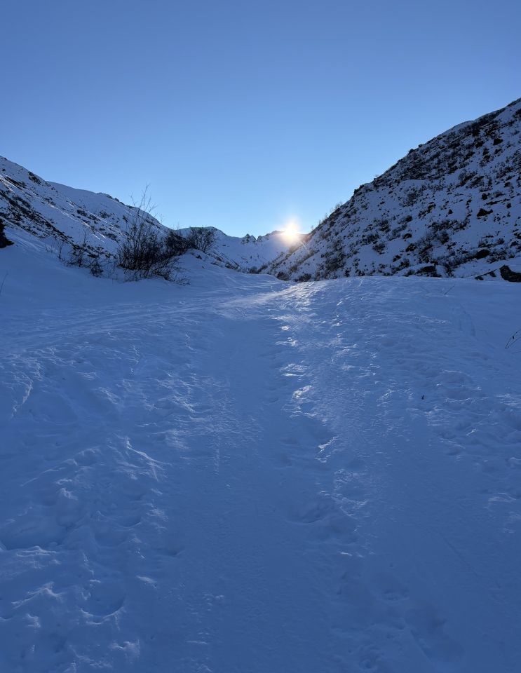 Das hintere Vergaldental wirkt aktuell wie ein Gefrierschrank - es ist recht kalt, dafür hat es noch halbwegs gute Schneeverhältnisse in den Schatthängen (!). Die Aufstiegsituation ins Vergaldental ist auf dem Winterweg zunächst recht eisig, besser sich dann aber rasch auf dem Weg zur Vergalden Alpe. Der weitere Weg in den Talschluss ist gut gespurt. Meine alte Aufstiegspur ist zwar noch in Verwendung aber leider in den letzten Tagen zum Teil vereist. Ab Grenzschutzhütte dann eine alte Spur die z.T. recht steil angelegt ist bis zur Kunterbandfurgga und zum Gipfel. Etwa 50 m vor dem Gipfel zu Fuß, da zu wenig Schnee. Abfahrt dann zunächst bruchharschig. Z.T: aber auch windgepresster Pulver, der mit etwas Können doch für überraschendes Fahrvergnügen sorgt. Abfahrt durch das Tal recht rasant möglich, so gut wie kein Schieben, das ansonsten etwas mühsam in Erinnerung geblieben war. Heute auch (leider etwas zu spät für mich) von zwei Skitourengehern eine Spitzkehrrouten in die NO-Flanke der Eisentälispitze angelegt. Wirkte als wäre dort noch ein schöner Pulverschnee für die Abfahrt.