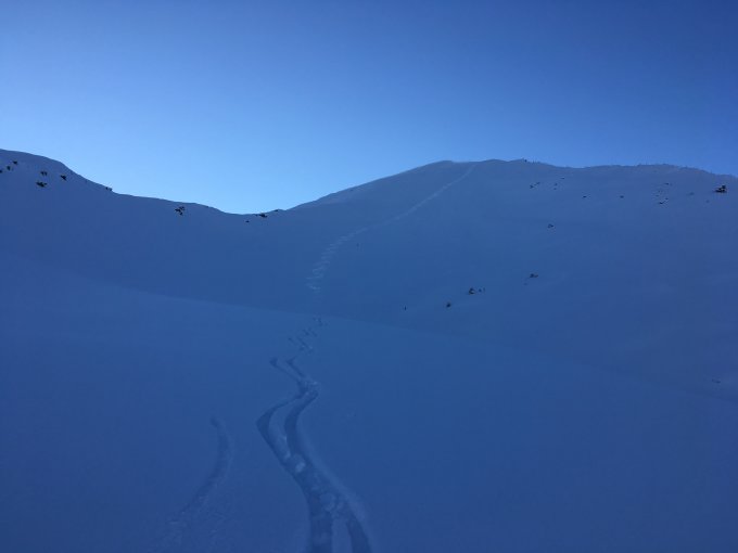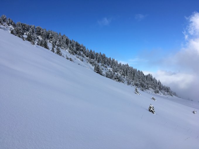 Schöner Pulver, teilweise windgepresst, gut drehbar und sehr gute Unterlage. Zwischen 20 und 35 cm Neuschnee, Triebschnee natürlich deutlich mehr, vor allem an Kammlagen.