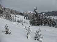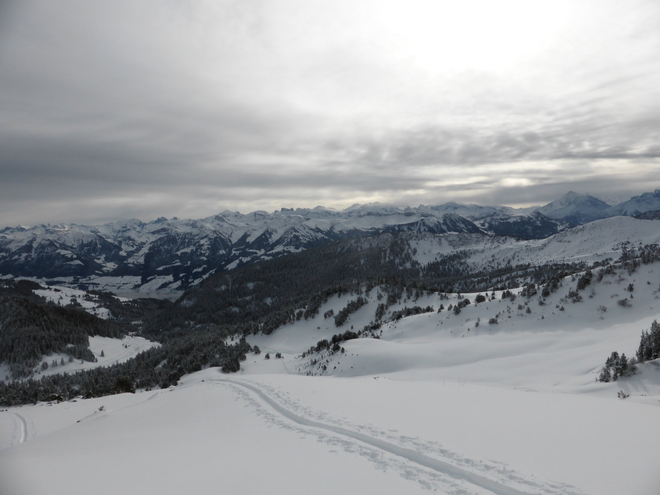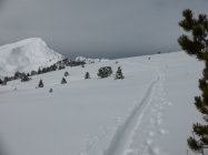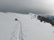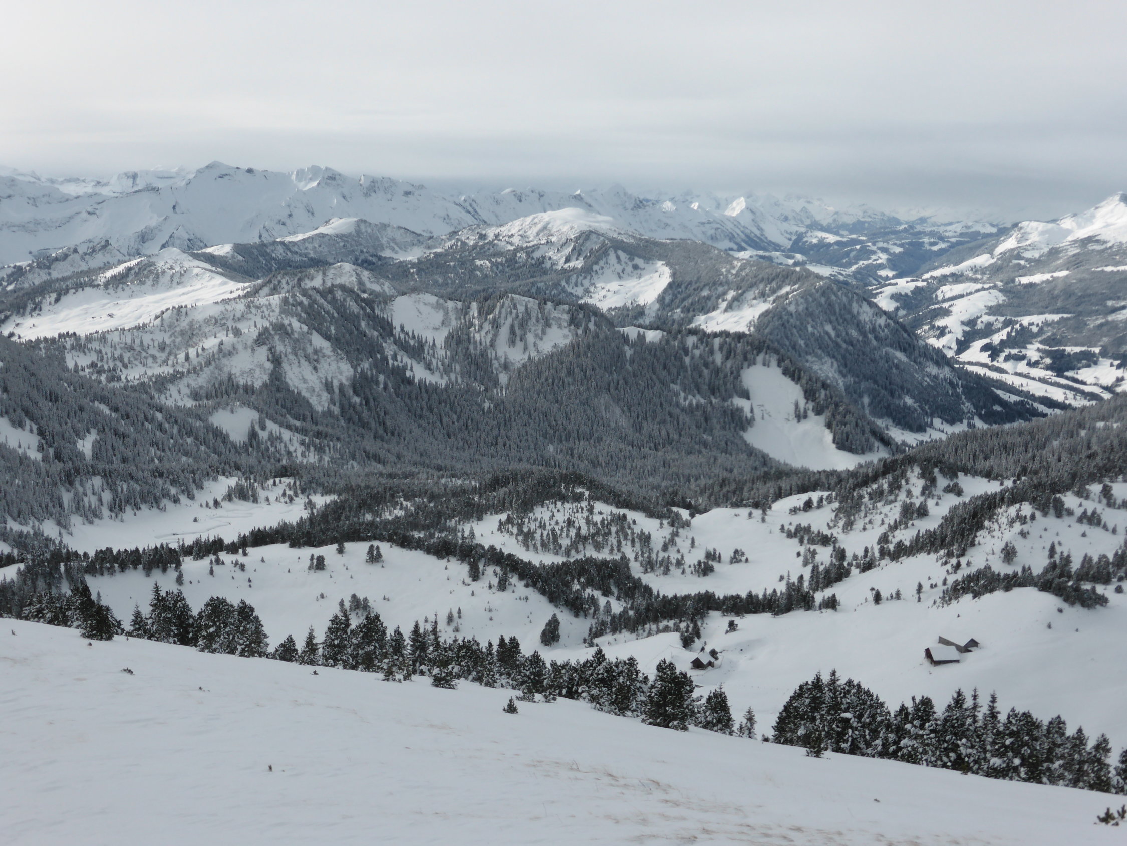 Wetter: Am Morgen bei der Anreise noch Sonne. Dann rasche Bewölkungszunahme, jedoch bis etwa Mittag immer wieder recht gut(mal etwas fahler Sonnenschein, dann wieder alles bedeckt, aber immer gute Sicht). Danach sehr schnell diffuse Licht- bzw. Sichtverhältnisse und einsetzender Schneefall. Desshalb habe ich mich entschlossen bei Pt.1819m direkt abzufahren und nicht noch auf den Chli Fürstein zu gehen.
