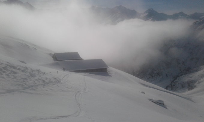 Von Weisstannen bis auf ungefähr 1.500 recht wenig Schnee. Hat heute gerade noch gereicht..Mit der erwarteten Sonneneinstrahlung und der Erwärmung (Fön) Morgen wirds richtig knapp. oberhalb Süd-seitig noch ok zu fahren... wird sicher nicht besser werden die nächsten Tage...(Deckel) Auf harter Unterlage ca 10 cm Neuschnee /Nassschnee aber noch gut zu fahren....