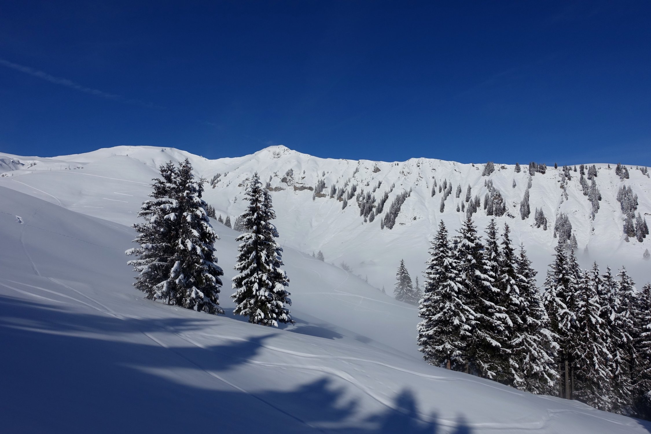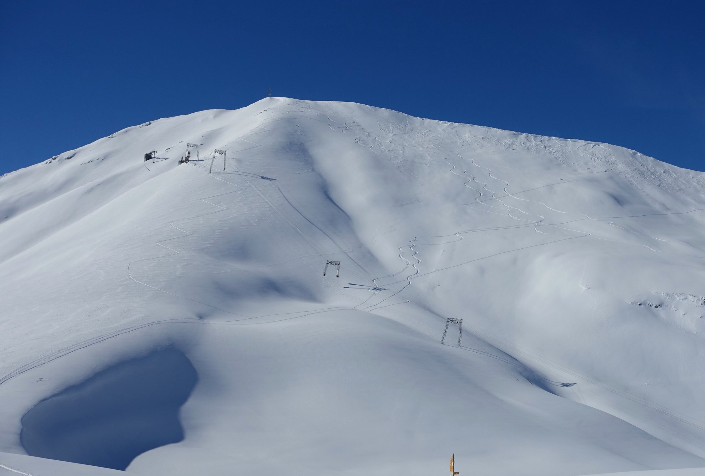 Im Bereich zwischen Gipfel und Breitenfeld herrlicher Pulver auf guter Unterlage und noch weitgehend unverspurt. Unterhalb Breitenfeld hat die Sonne schon Wirkung gezeigt. Das Gelände klug ausnutzend, aber bis zum Turren noch sehr schön zum fahren.