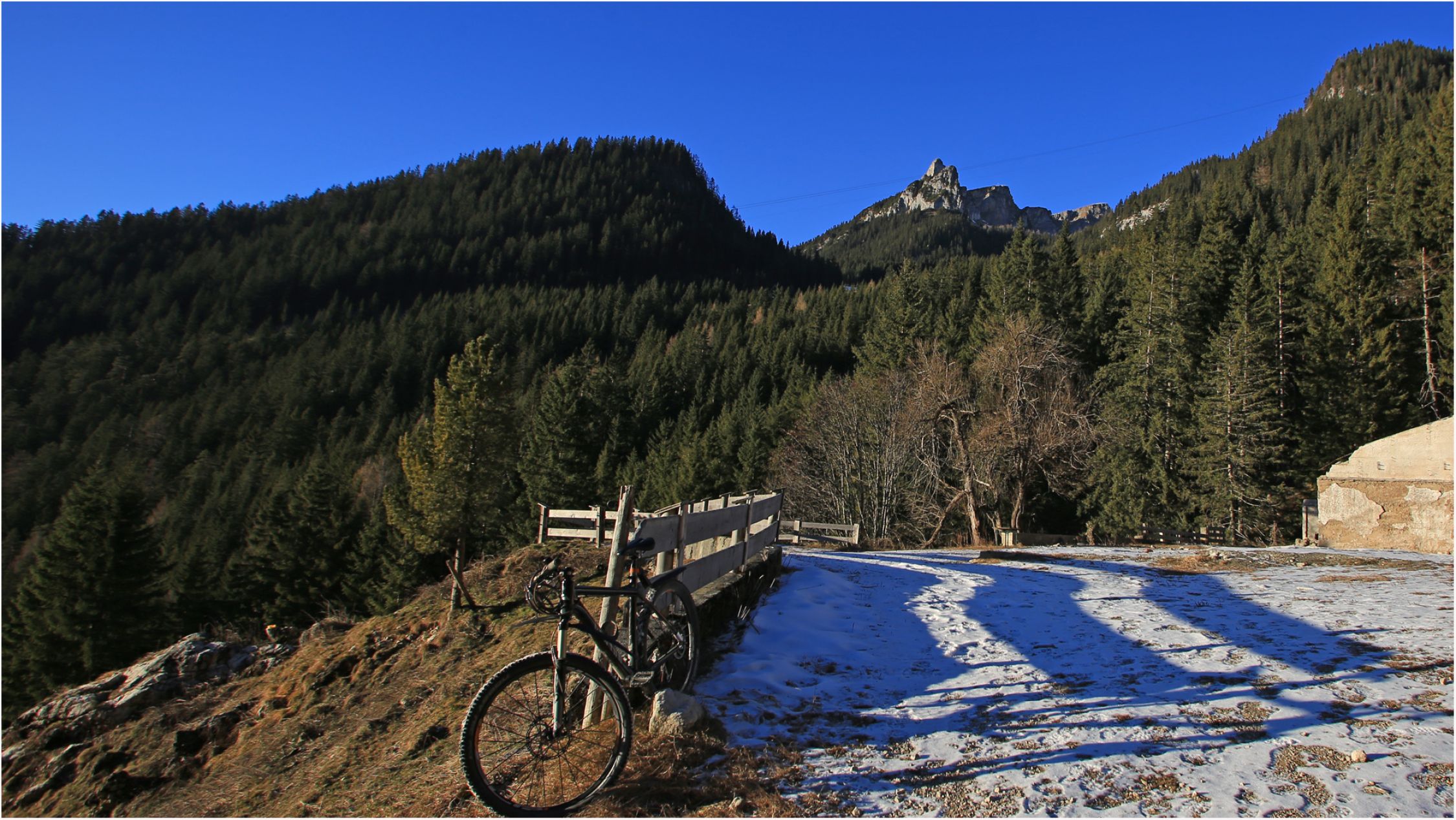 Sehr wenig Schnee auf der Fahrweg, deshalb gut mit dem Bike machbar.