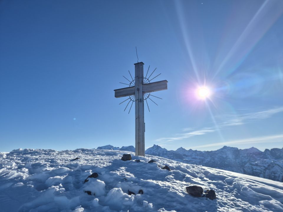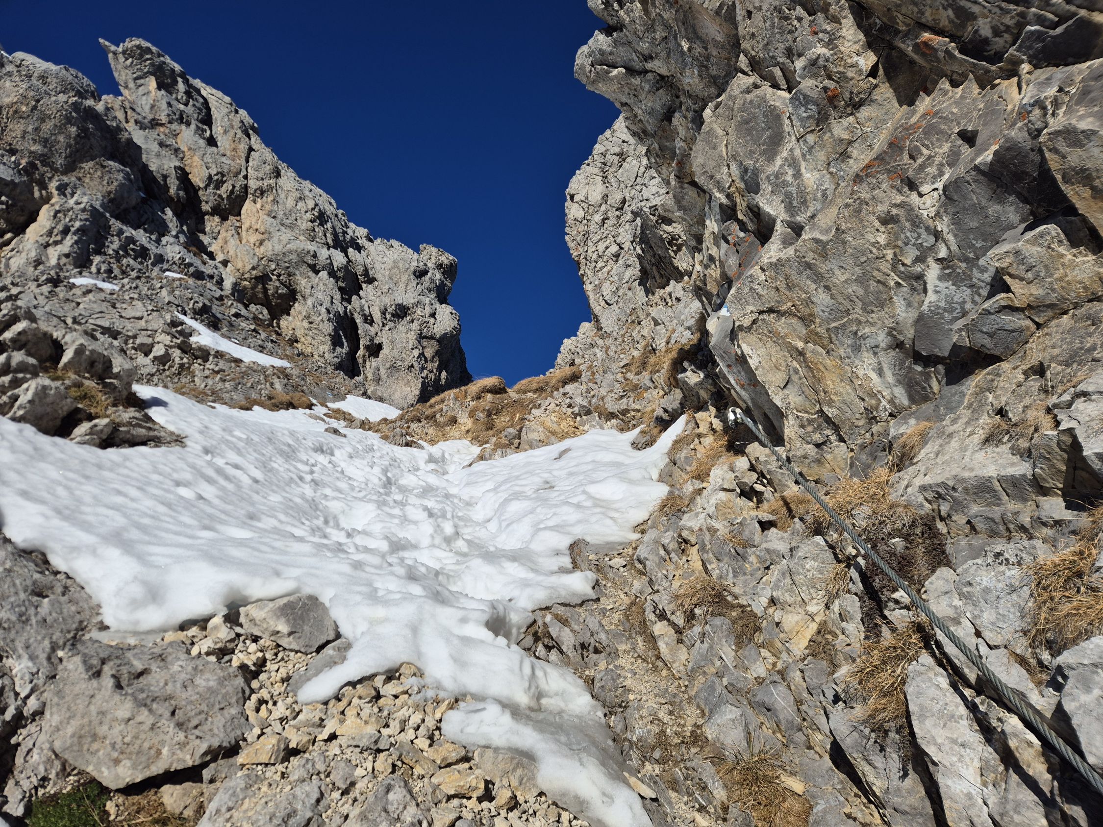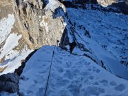 Der Schnee im Aufstieg pickelhart, zum Teil neben der Spur noch Pulver. Die Querung zur hart für Schneeschuhe, in der Hälfte auf Steigeisen gewechselt. Die meisten Seile frei. Im Abstieg hat es aufgesulzt.