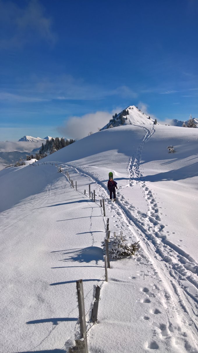 Von unten ab guter Schnee, ca. 15 cm neu auf Altschneedecke, gleichbleibend bis oben. Durchgehende und gute Aufstiegsspur, leicht zu finden. Lawinengefahr gering. Die Abfahrt war bei diesen Schneeverhältnissen gut zu machen. Beim Nebel hatte wir das Glück, dass er immer gerade woanders war!