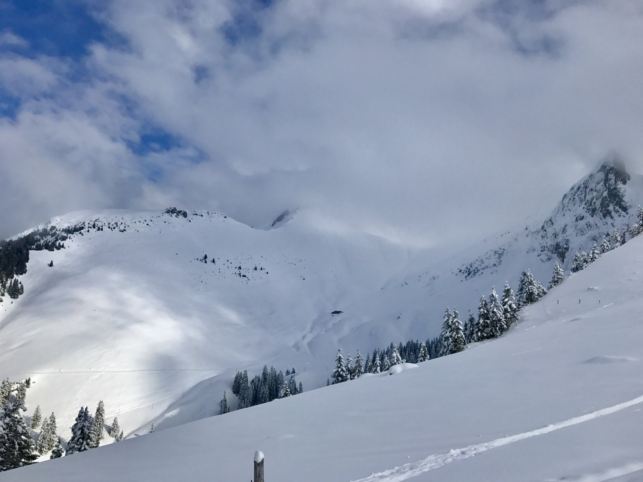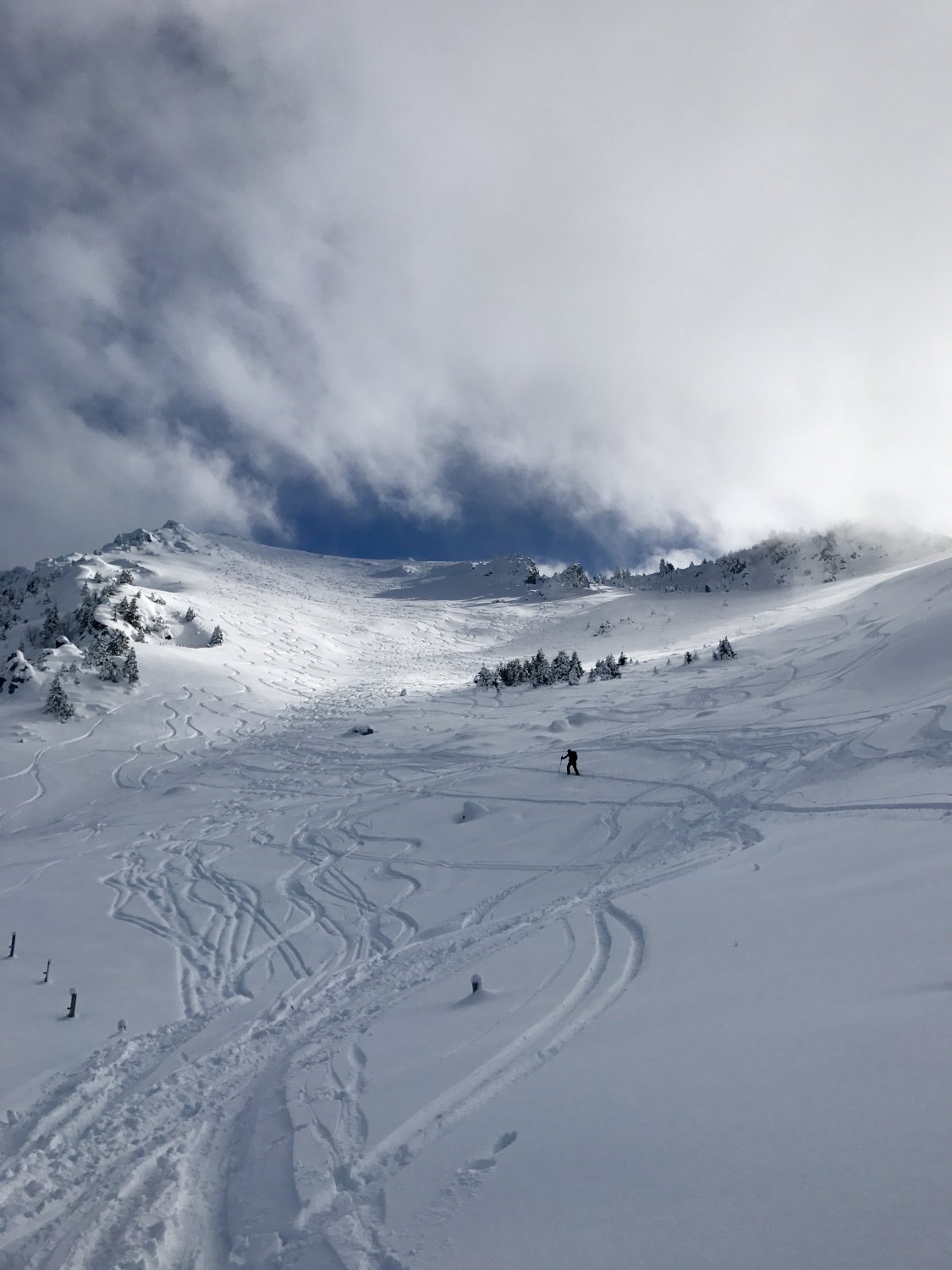 Abfahrt dann auf der Seite der Alpligenmähren noch mit schwerem Pulver. Anschl. Wiederaufstieg zur Alpligenmähren. Schneeverhältnisse deutlich besser als beim Ochsen, doch nach diesem Weekend dann entsprechend vercharet.