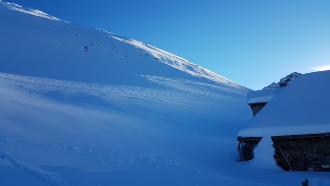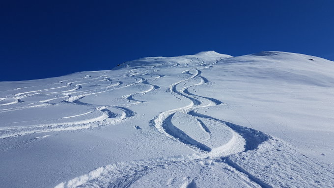 Ich wählte deswegen den Scheerizug, weil man oberhalb noch rechtshaltend über unverfahrene Pulverhänge kurven kann