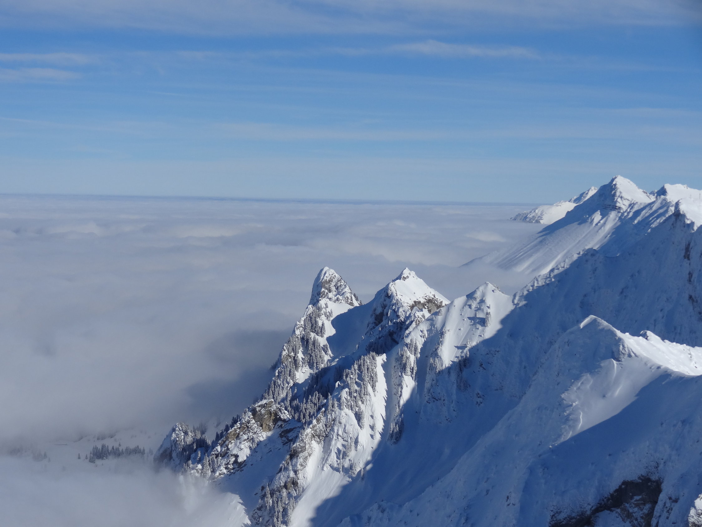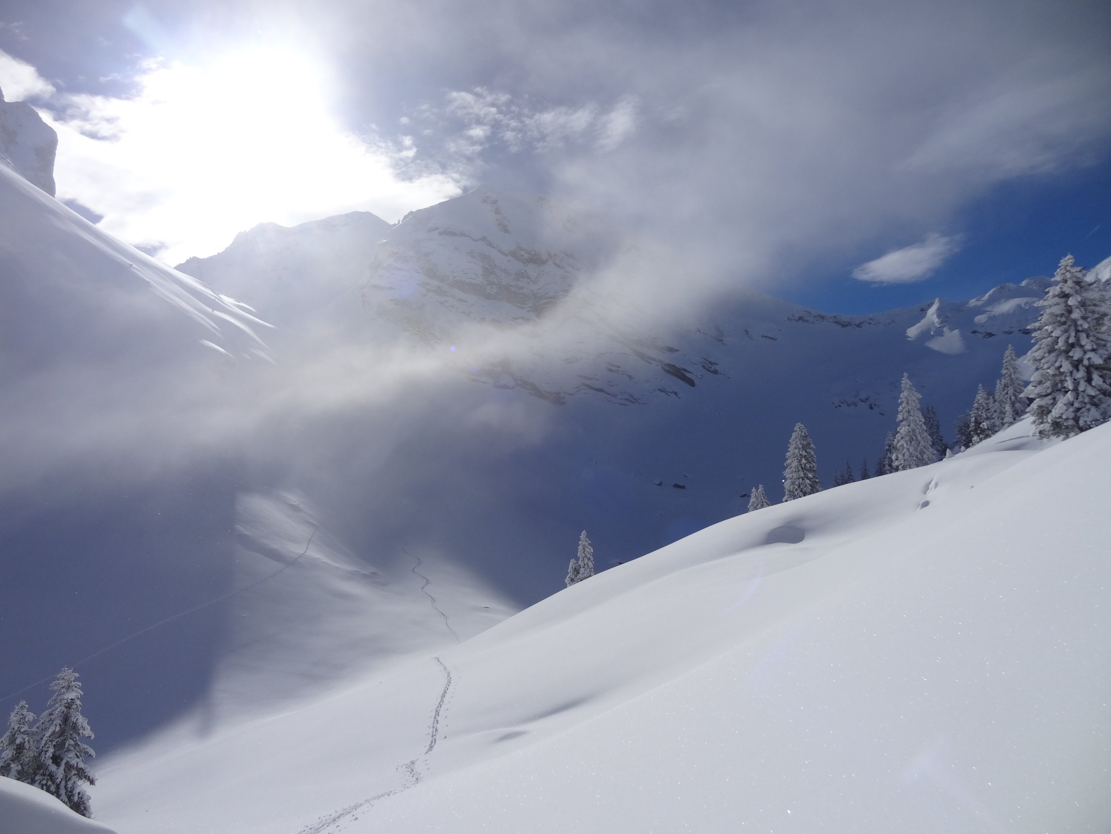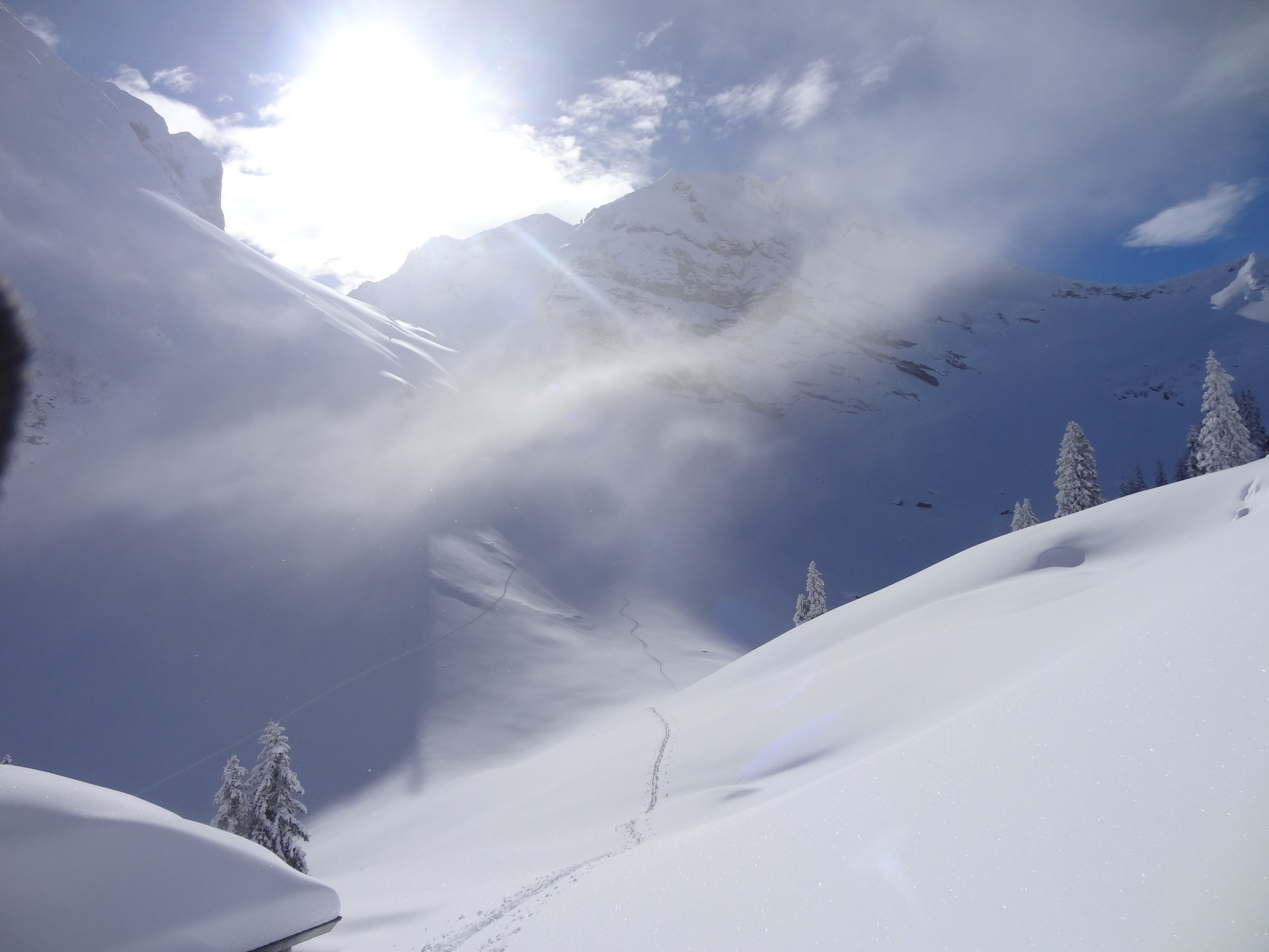 Abfahrt bis Combi war erste Sahne. Danach kurzer Aufstieg, um direkter nach Cerniets zu gelangen. Dort in den aufsteigenden Nebel eingetaucht. Der Aufstieg zum Patraflon war dann wider Erwarten noch nicht gespurt und leider sehr klebrig, also noch mal kräfteraubend. Dort dann schönste Spätnachmittagssonne knapp über dem Nebel. Abfahrt durch das NE-Couloir hatte besten Schnee, nur war nach einem Drittel die Sicht gleich null. Im kompletten Whiteout bis zu den ersten Bäumen gekurvt und zweimal hingefallen (das Gelände war nicht erkennbar). Danach dank guten Geländekenntnissen und Baumkontouren bis Schwarzsee getappt. Schade um den bis unten schönen Schnee, den man so leider nicht ganz geniessen konnte.