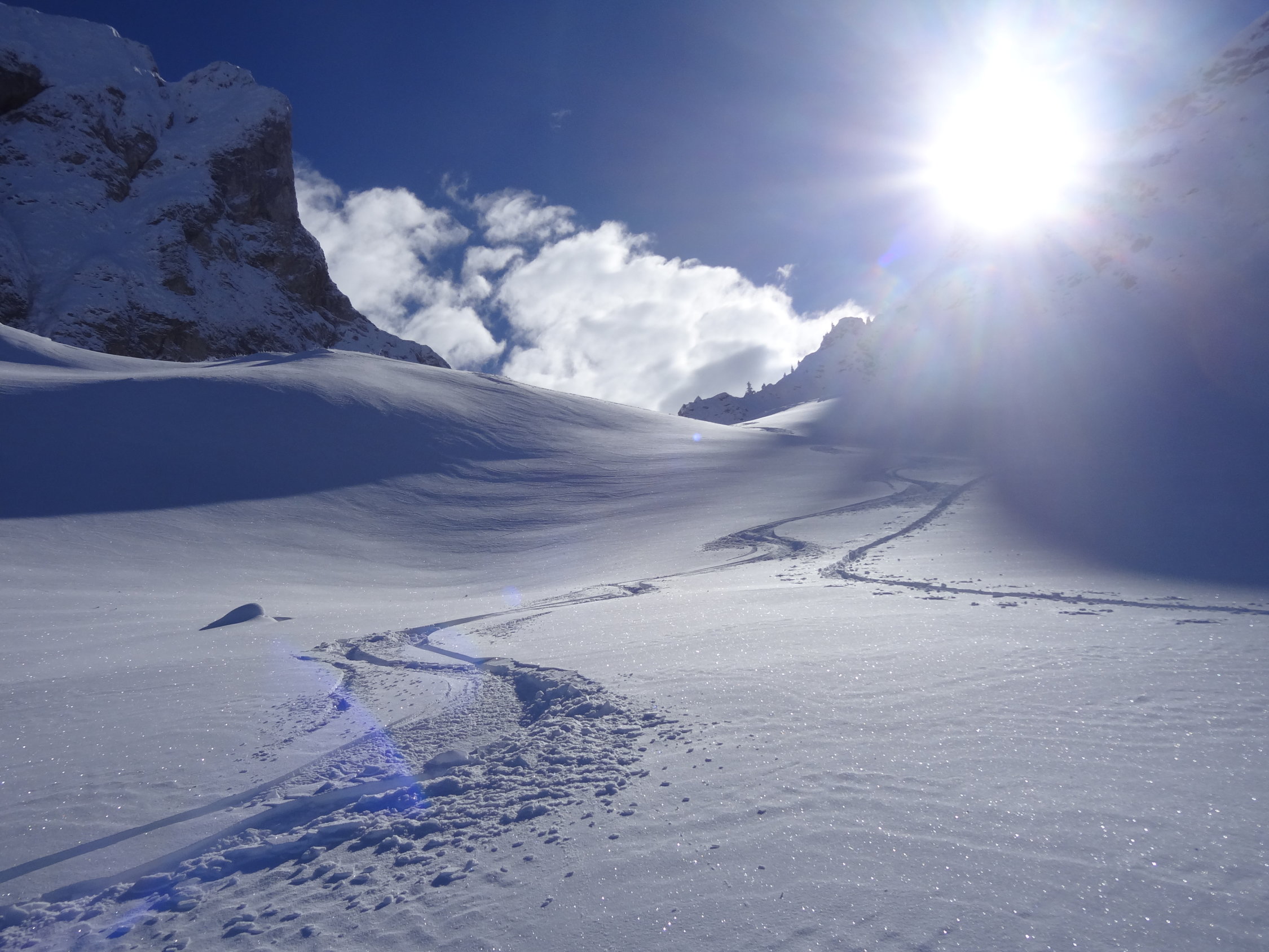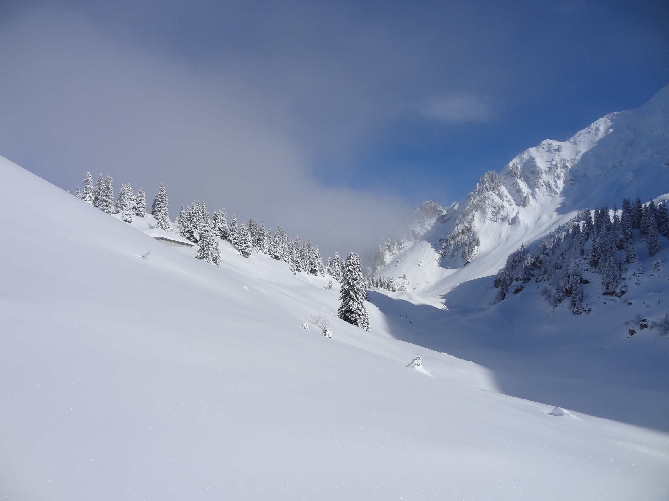 Tour am 9.2. gemacht, nach frischem Neuschnee vom 8.2. Einsamkeit pur im Breccaschlund, keine Menschenseele den ganzen Tag angetroffen, nur die Spuren von Fuchs und Has. Entsprechend harte Spurarbeit war zu leisten, welche aber durch die Vorfreude auf den schönen Pulverschnee erleichtert wurde. Sogar der Gipfelhang des Schopfenspitz konnte ausnahmsweise fast bis oben mit Ski begangen und befahren werden. Alles gut eingeschneit, 50-100 cm.