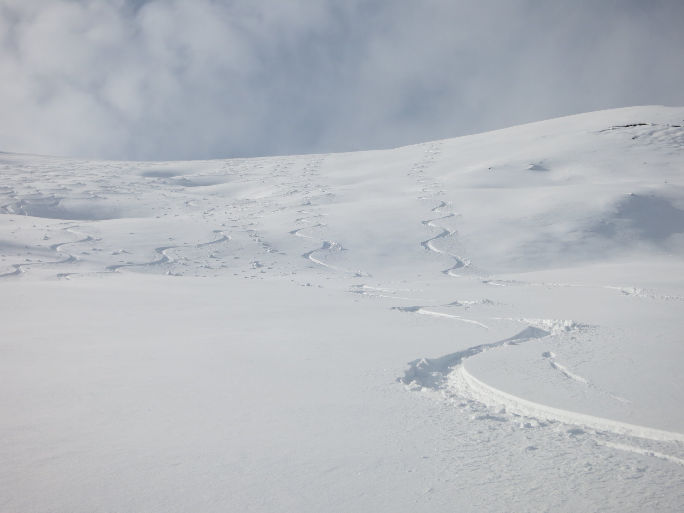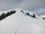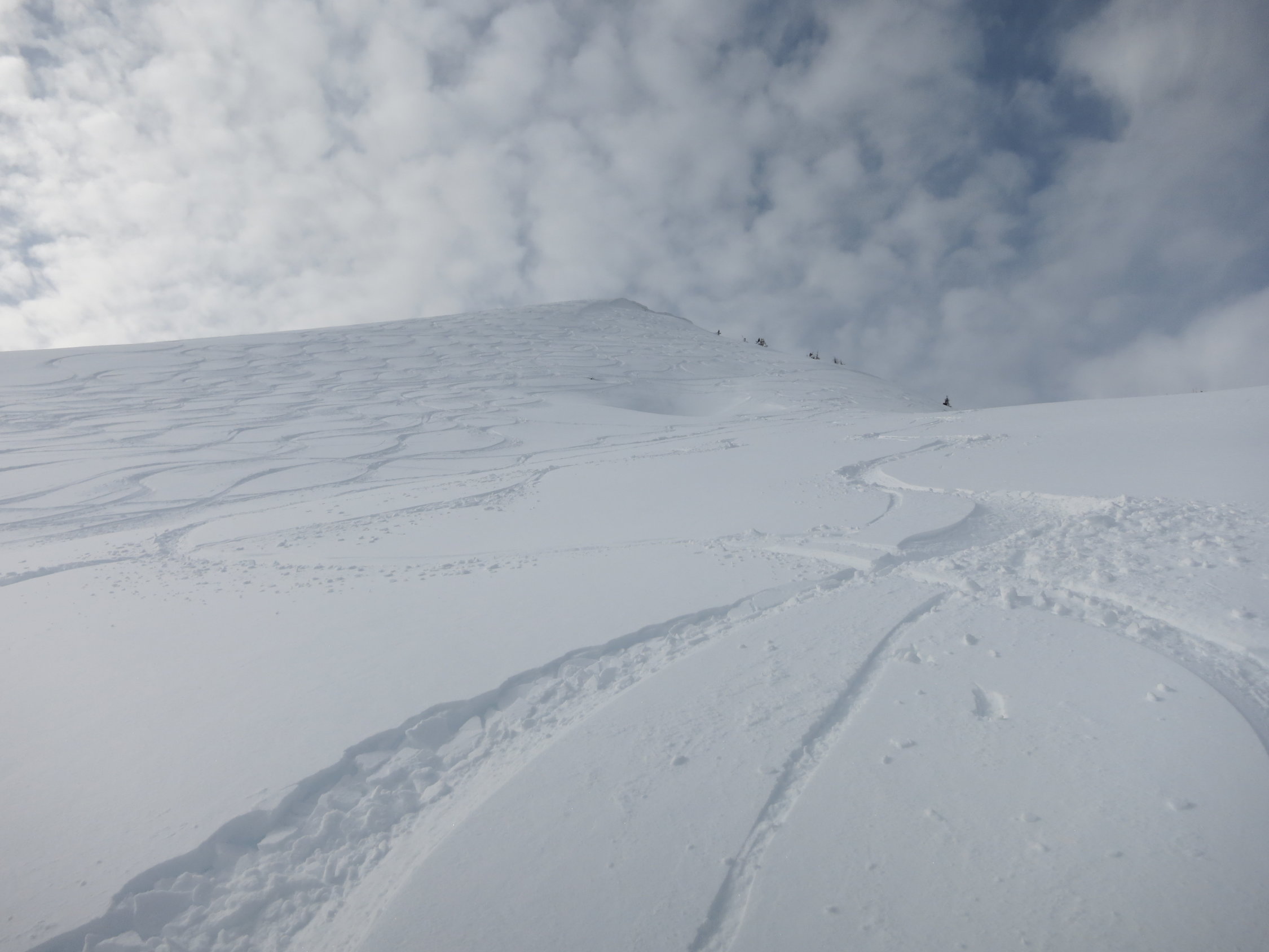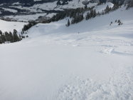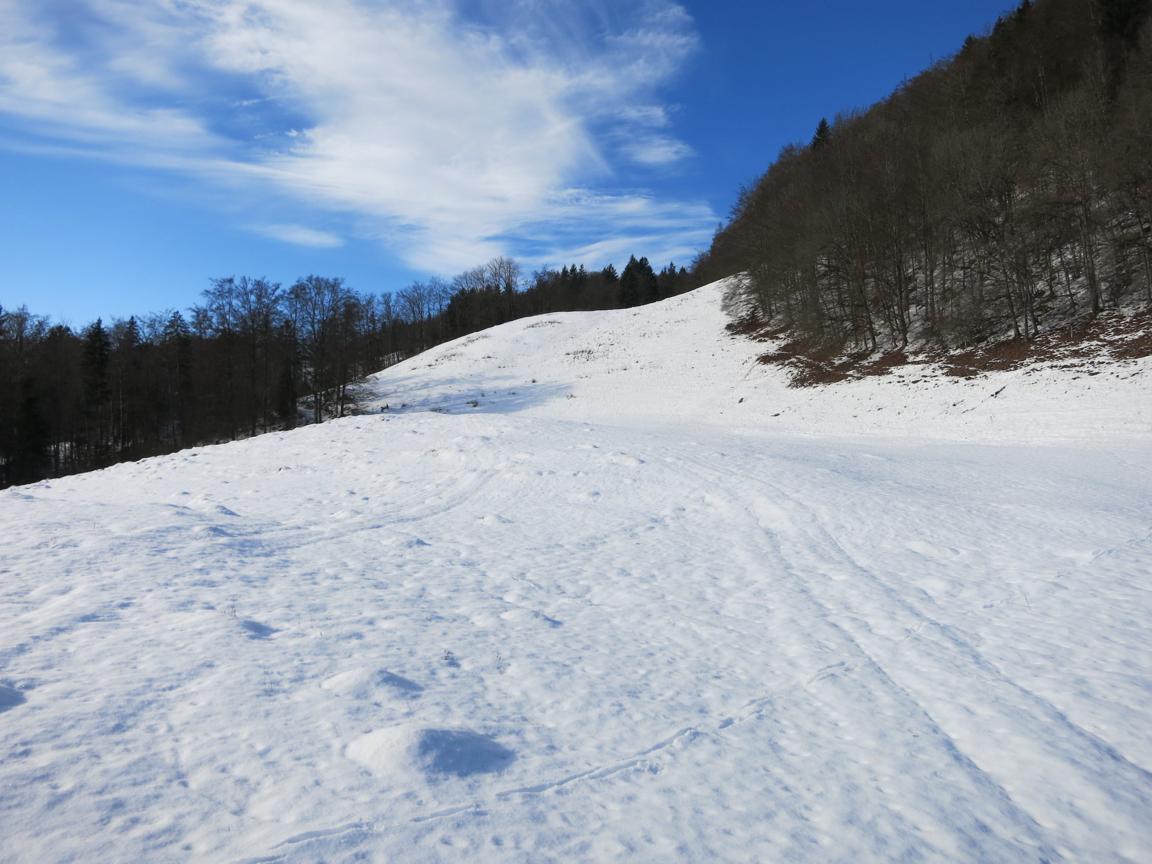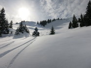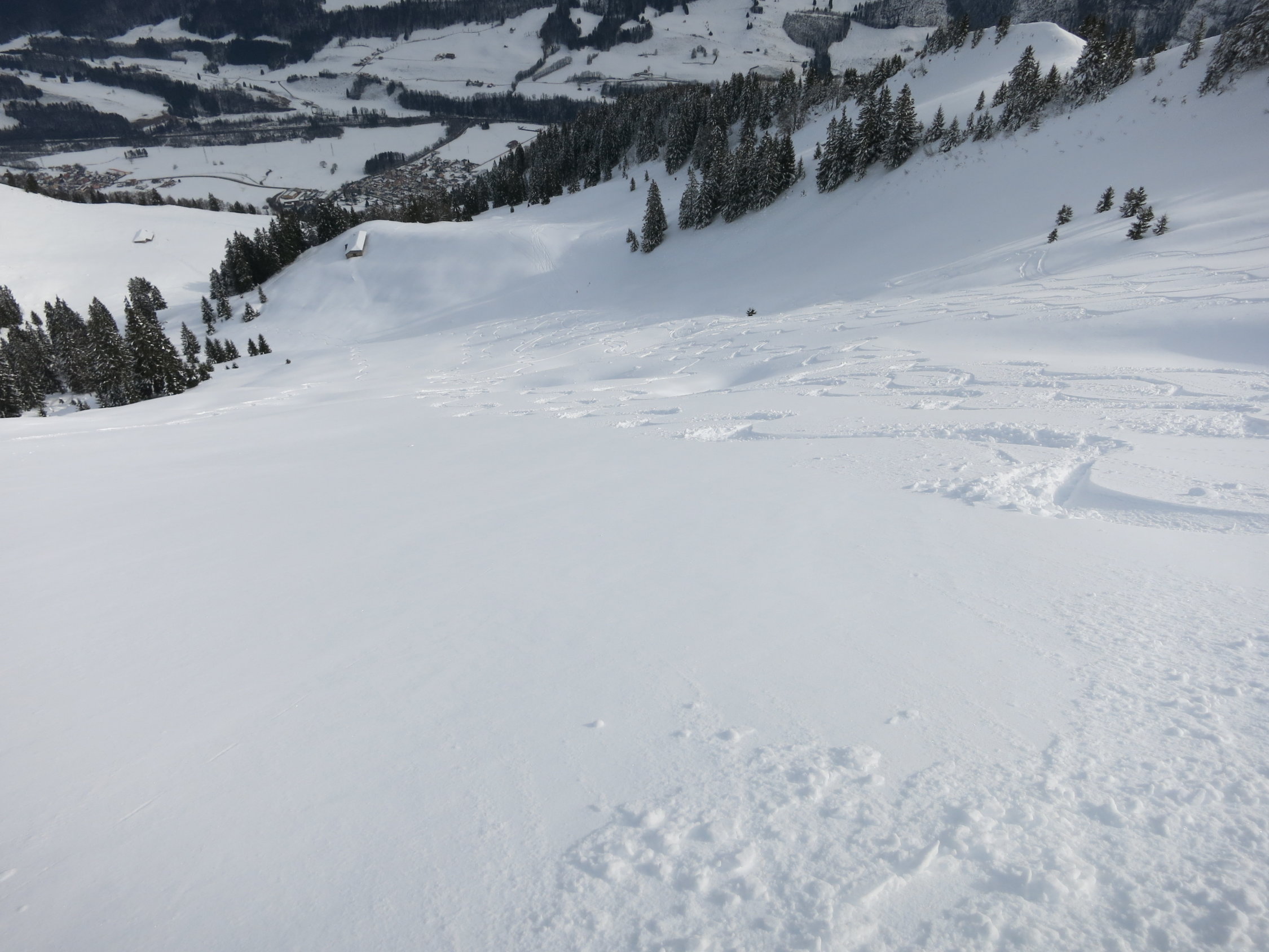 Morgens unten hart. Im Waldstück eher magere Auflage (daher auf dem Rückweg die Ski hier getragen). Gipfelhang traumhaft in schönem Pulver. Danach besser über die Strasse abfahren. Habe im unteren Teil ein paar Steinkontakte gehabt. Für den Gipfelhang lohnt sich die Tour allerdings. Noch viel Platz.