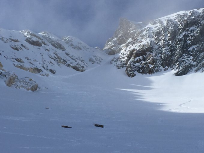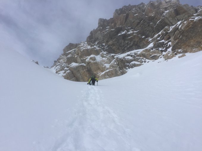 Etwas Neuschnee/Triebschnee auf dem Gletscher, die Rinne unter dem Gipfel hat einen stabilen Schneedeckenaufbau und ist nur mit wenig Triebschnee bedeckt. Ab dem Sattel bis zum Gipfel war es sehr windig.