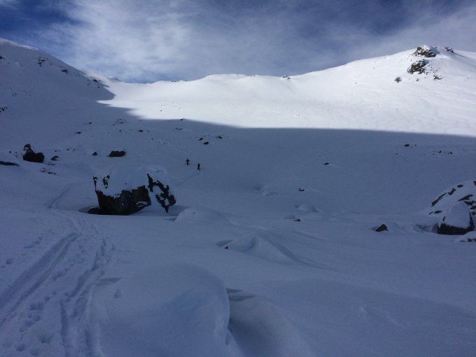 Äußerst lautes Wumm am Fuße nordost- exponierten, frisch eingewehten Kessels auf 2340m, spürbare Senkung der Schneedecke).