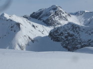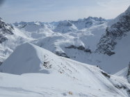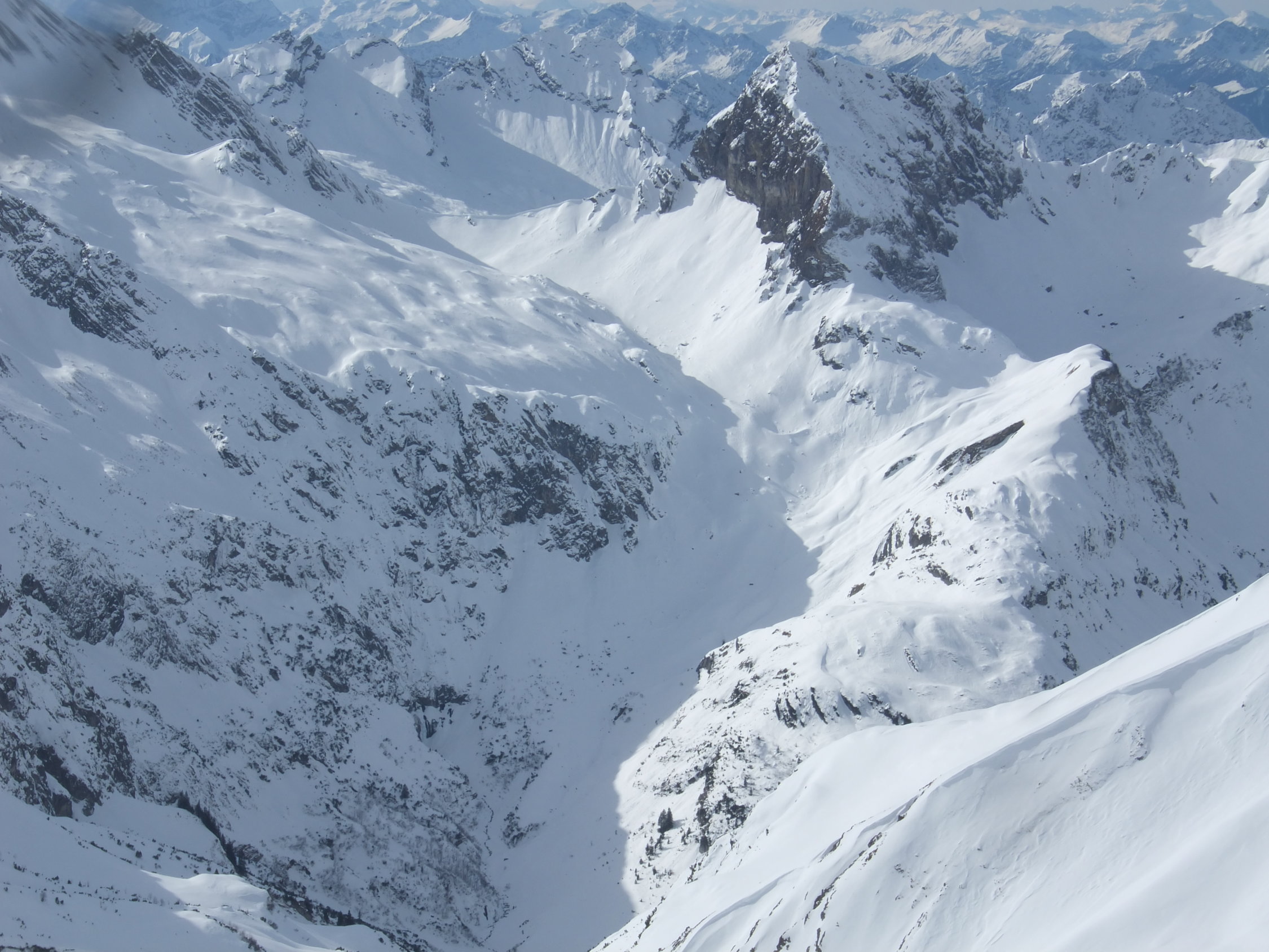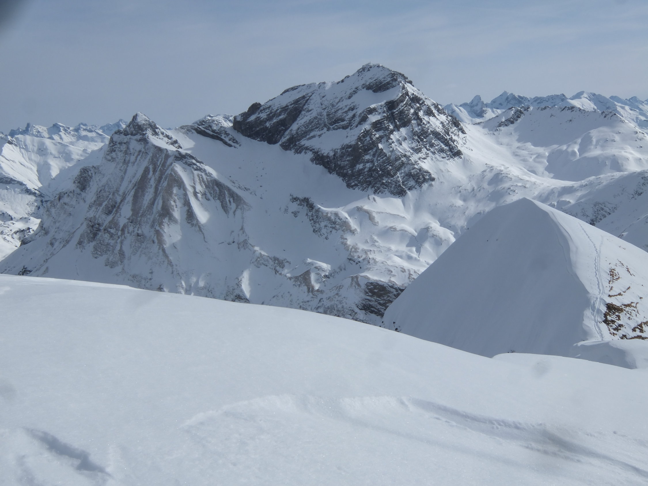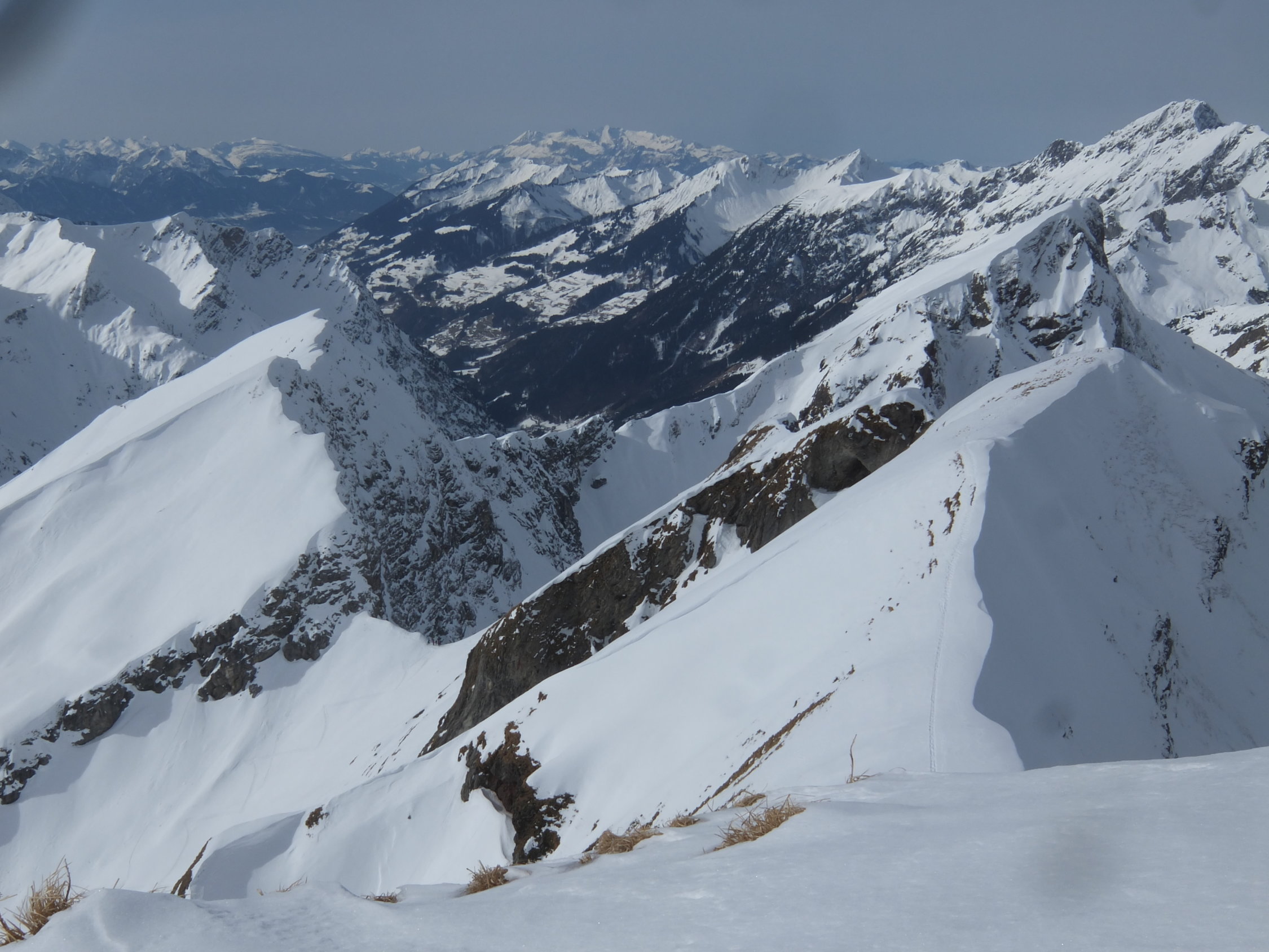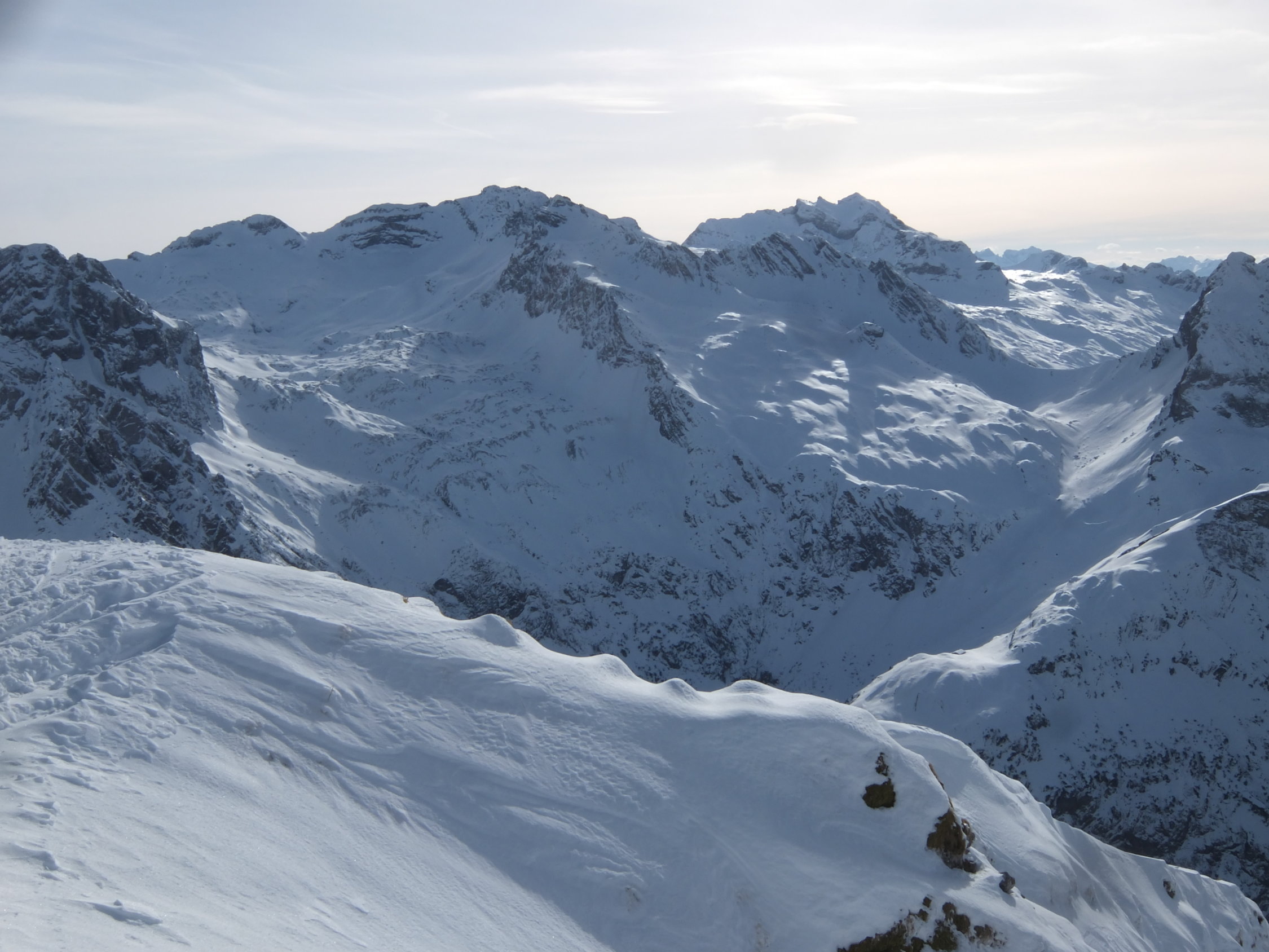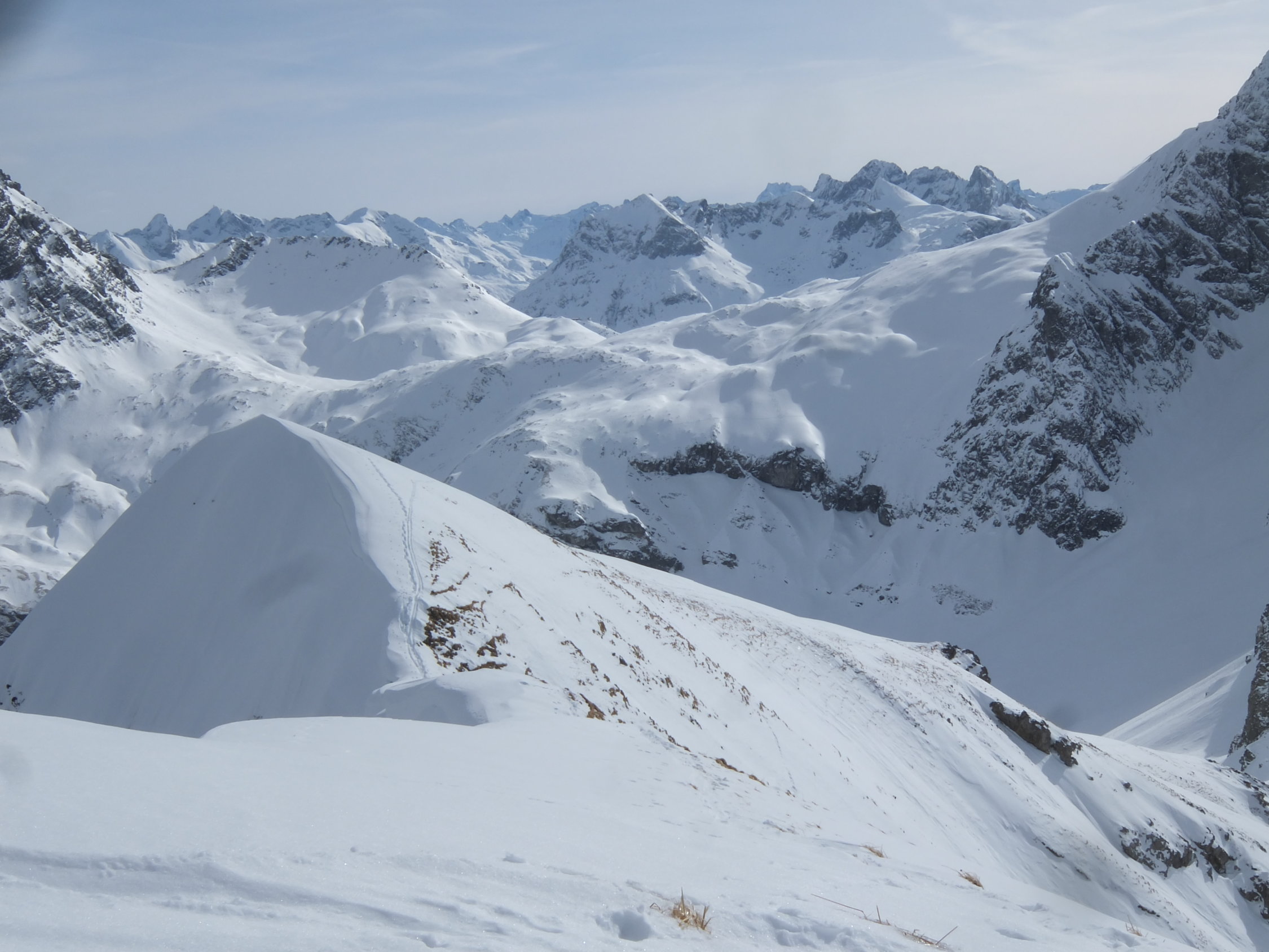 Skidepot unter dem westlichen Vorgipfel, oberhalb der Wanne. Über den Vorgipfel und den Grat zum GK. Gute Sicht auf die Touren bei Schröcken.